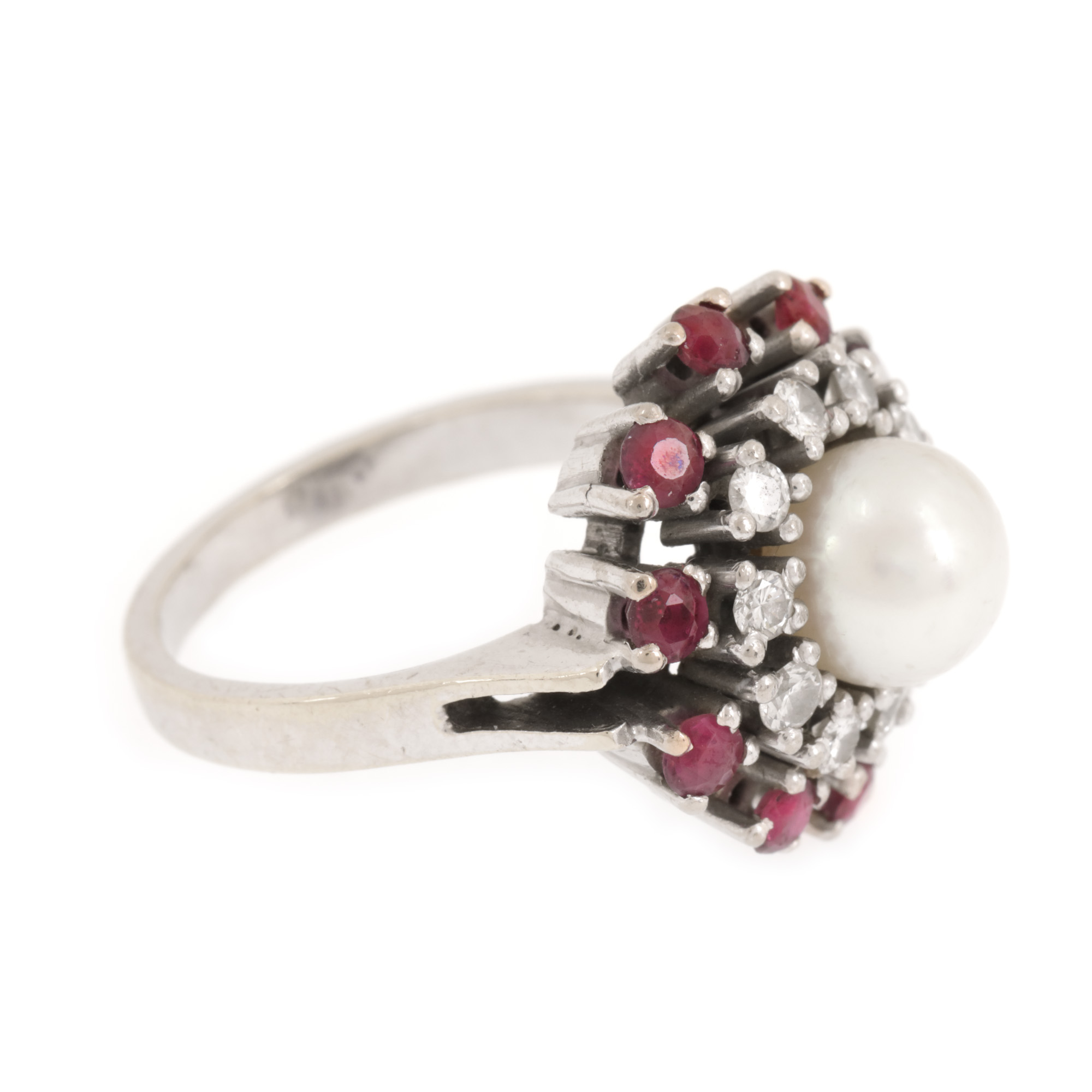 6. Inel din aur alb, decorat central cu perlă, anturată de diamante și rubine