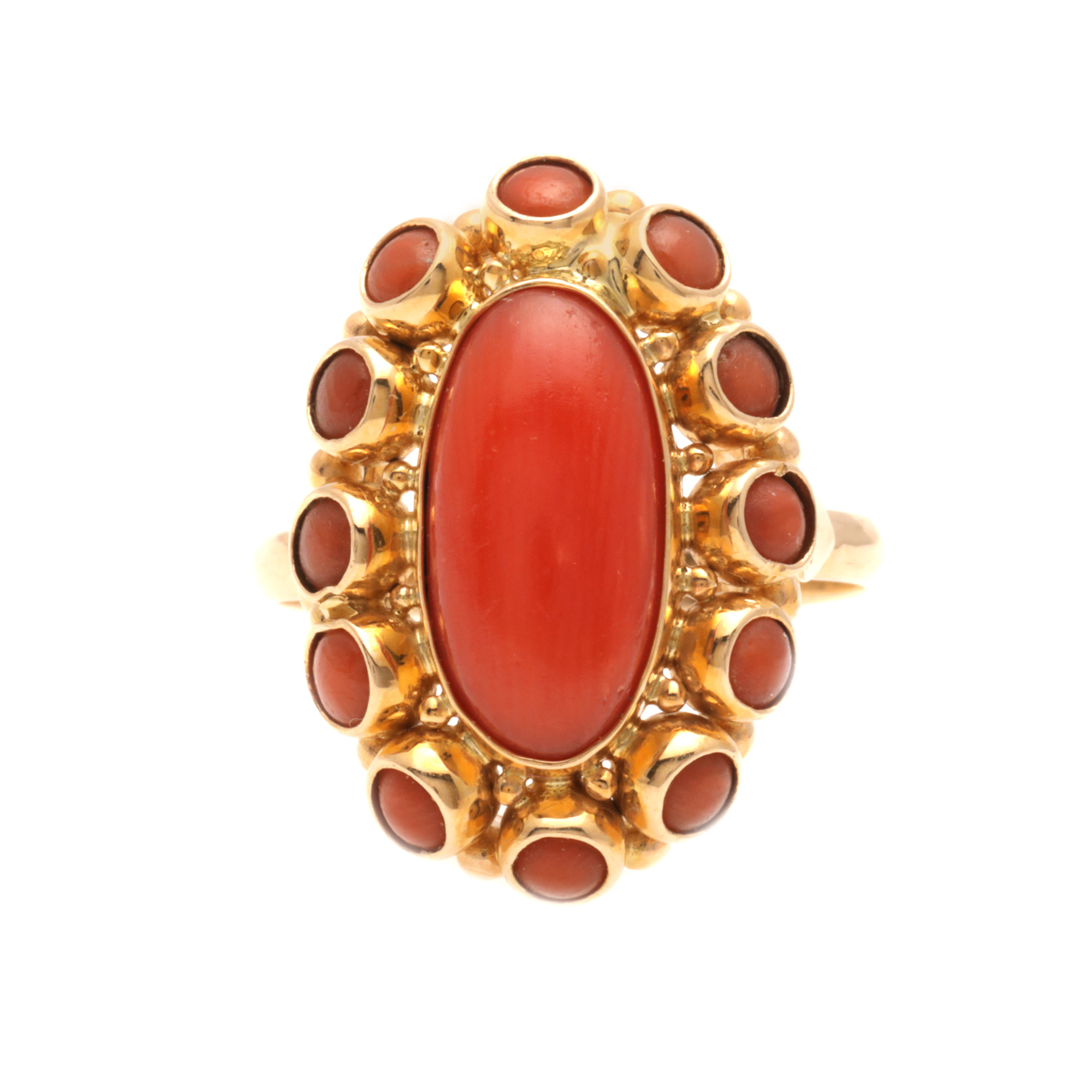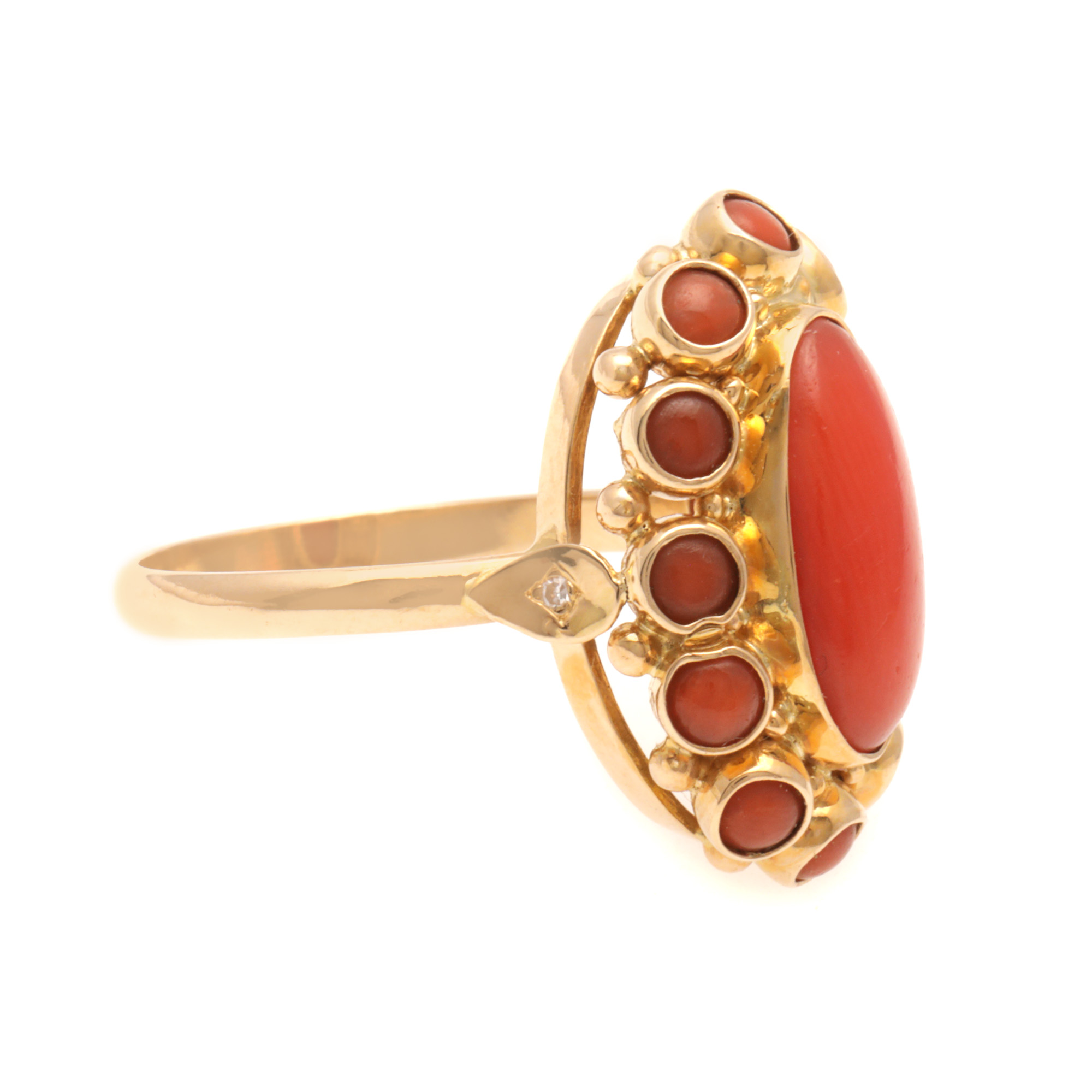 2 diamante single cut, culoare I-J, claritate SI1-SI2, cca. 0,01 ct.; 13 corali (1 oval, 12 rotunzi), culoare roșie