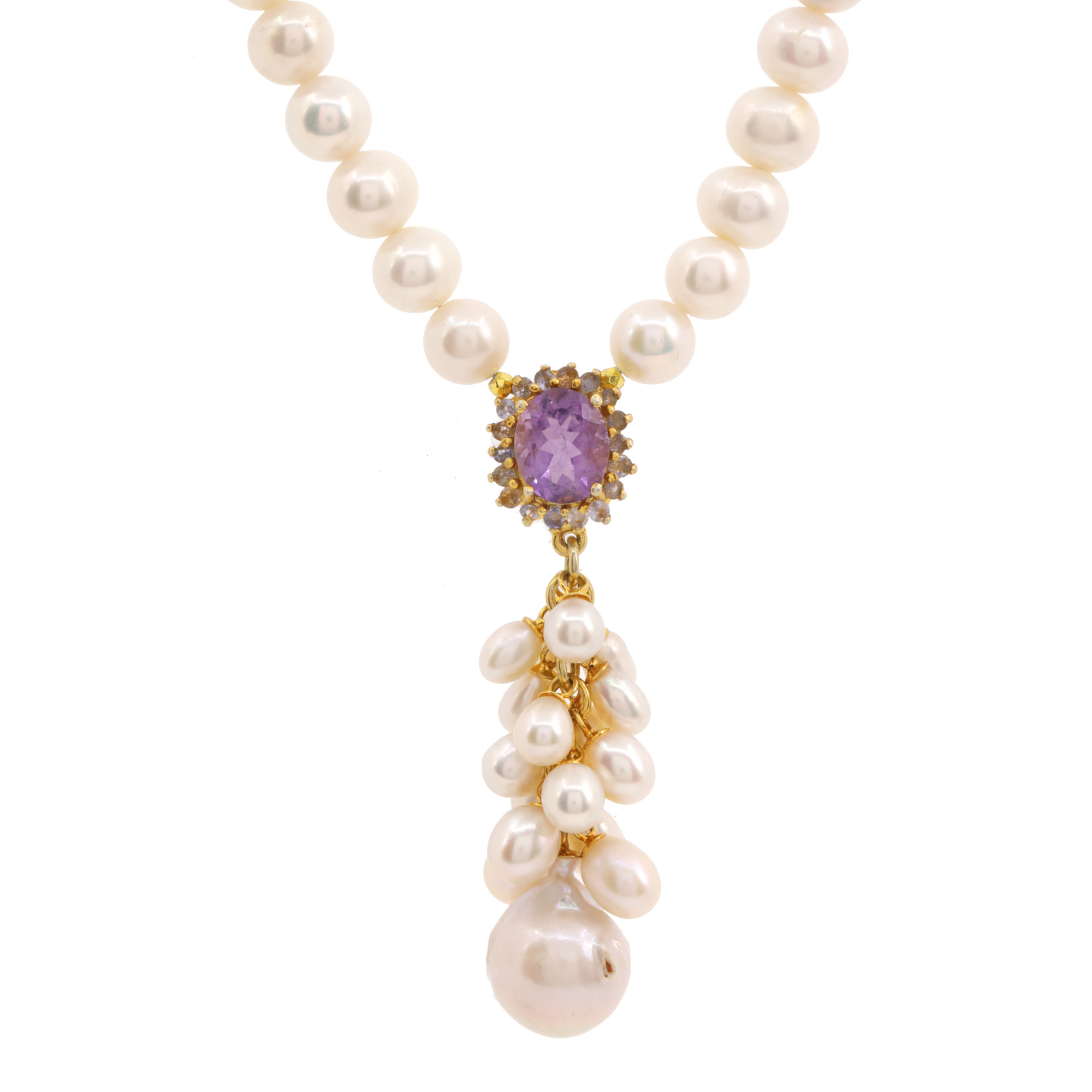 3 ametiste (2 emerald cut, 1 oval fațetat), culoare violet, claritate eye-clean, cca. 5,20 ct.; 18 tananite rotunde fațetate, culoare violet, claritate SI, cca. 0,54 ct.; 18 crom-diopside rotunde fațetate, culoare verde, claritate SI, cca. 0,27 ct.; perle de cultură de apă dulce rotunde și baroce albe.