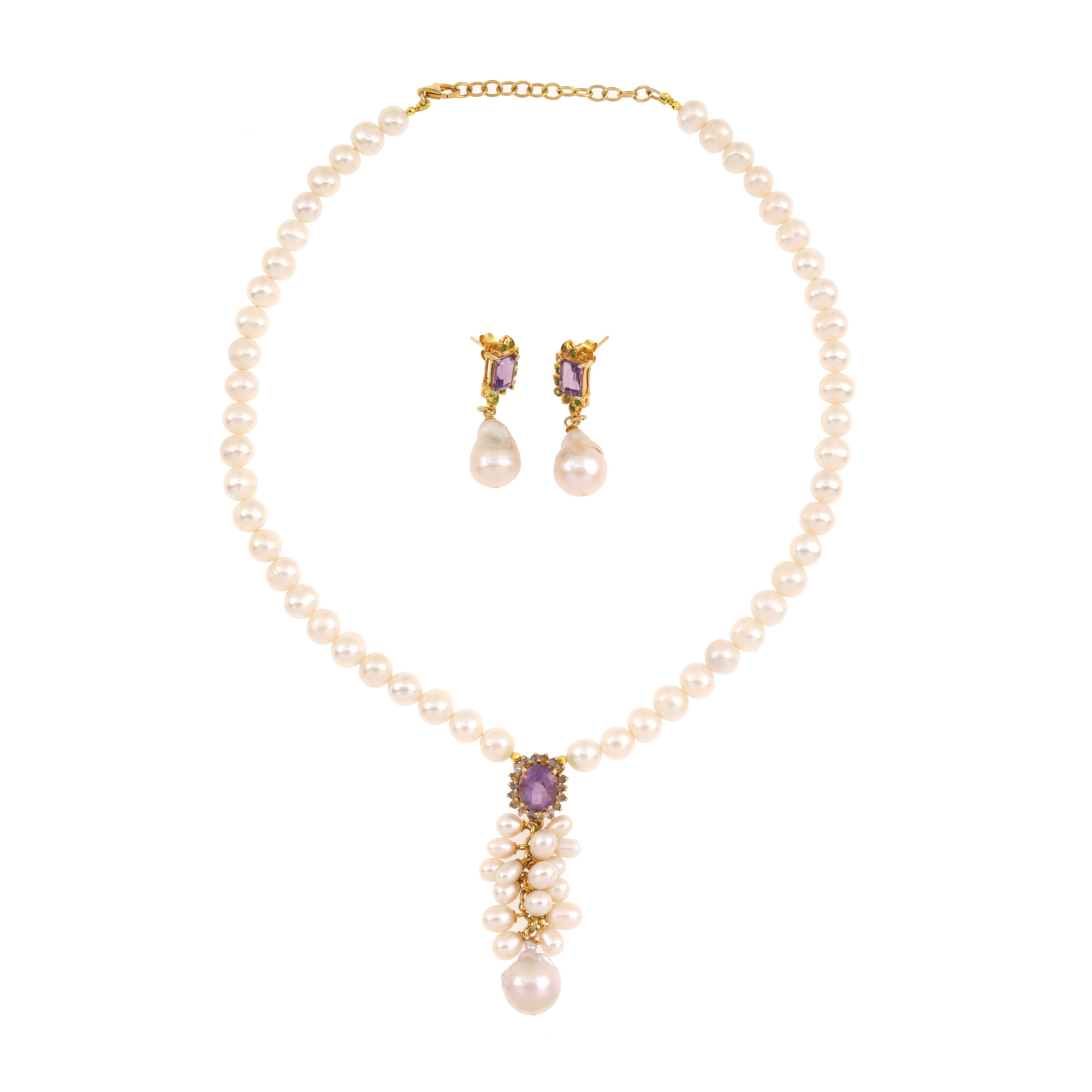 46. Set format din colier și pereche de cercei, din argint aurit și perle, decorat cu ametiste, tanzanite și crom-diopside