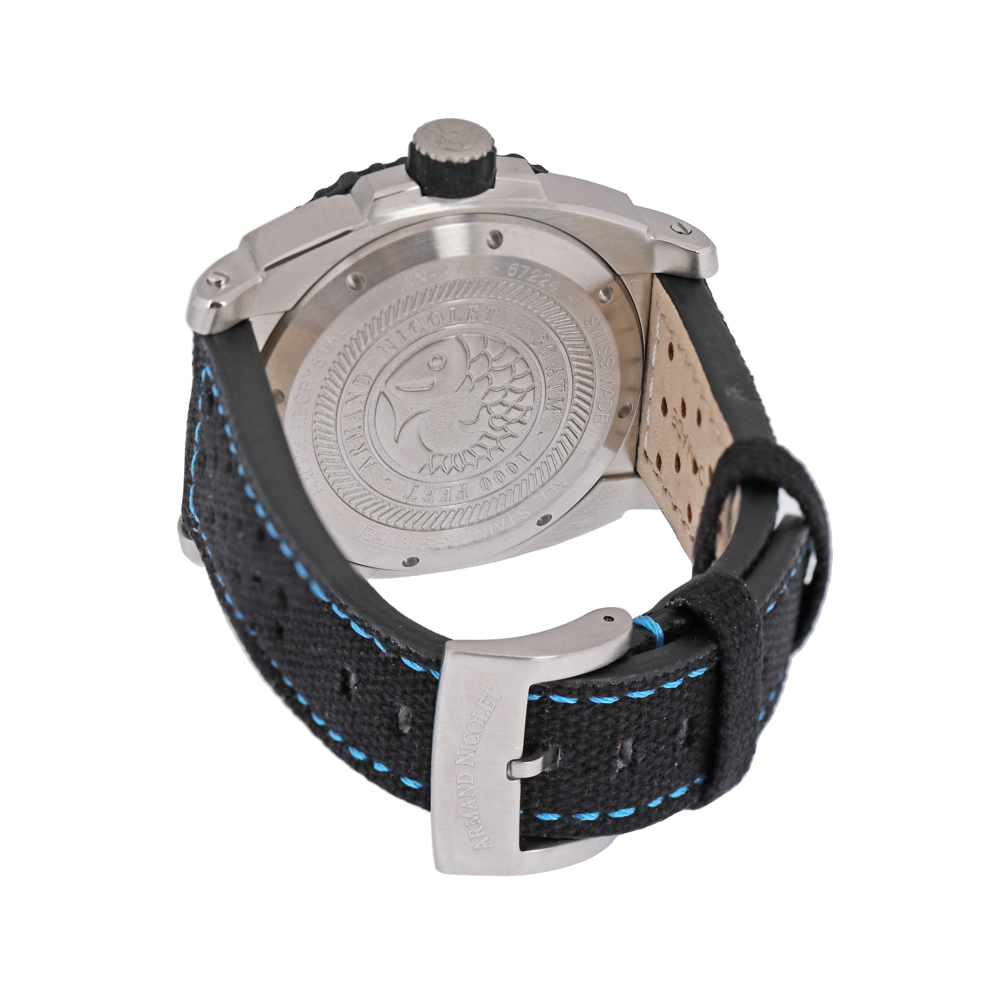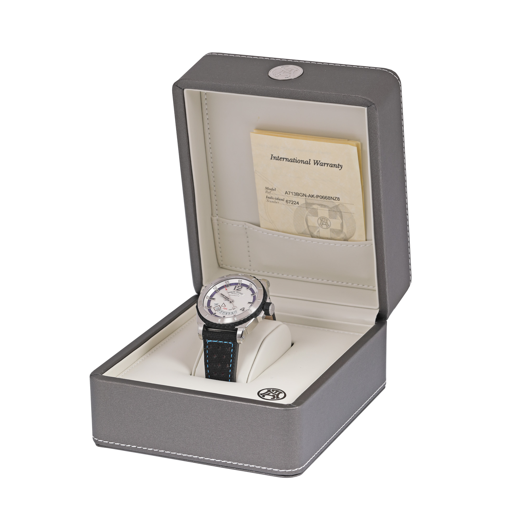 Ceas Armand Nicolet Tramelan, de mână, bărbătesc, nou, referință A713BGN-AK-P0668NZ8. Mecanism automatic calibrul AN 2846-9. Cadran de culoare gri deschis, indici numerale arabe pentru orele 12 și 4, baghete pentru restul orelor, registru pentru dată desfășurat între orele 4 și 8. Curea din material textil și cauciuc, de culoare neagră, cu sistem de închidere clasic cu cataramă. Accesorii: cutia originală, certificat de garanție.
