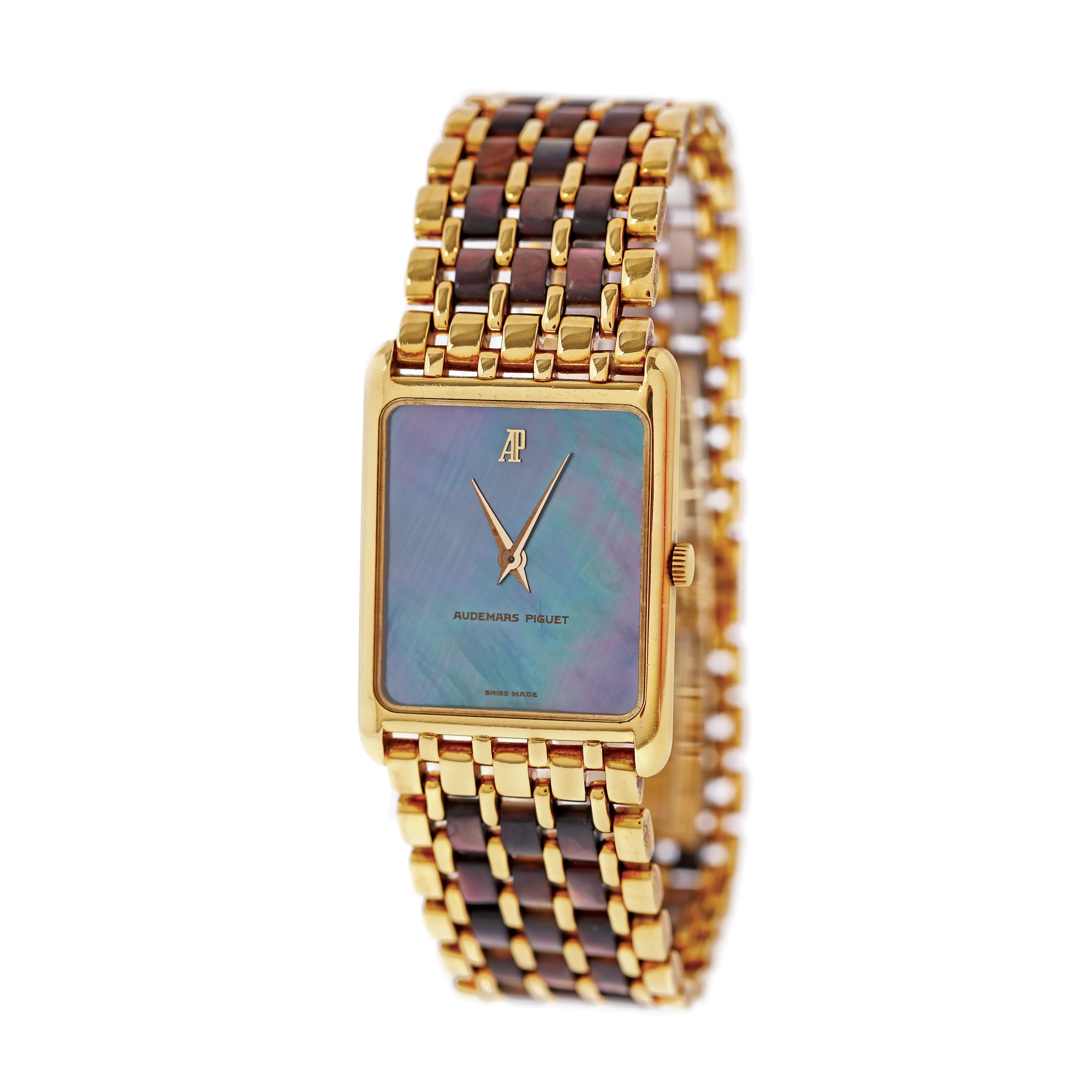 Ceas Audemars Piguet, foarte rar, din aur și sidef, de mână, unisex. Mecanism cu armare manuală. Cadran din sidef, fără indici. Brățară originală, din aur și sidef cu sistem de închidere de tip deployant.