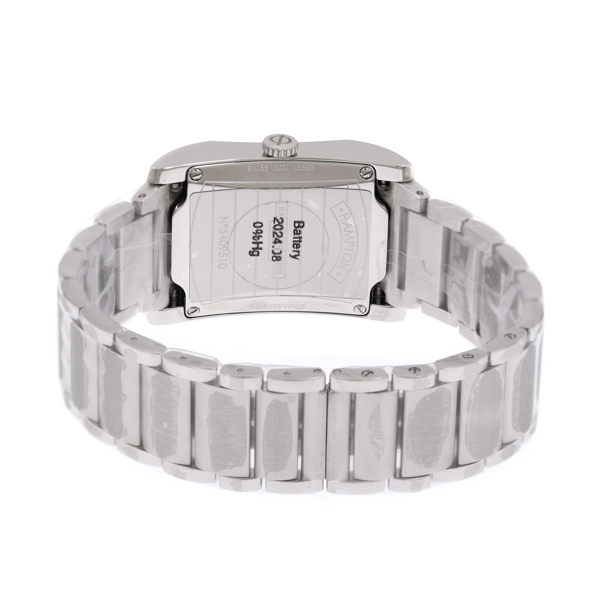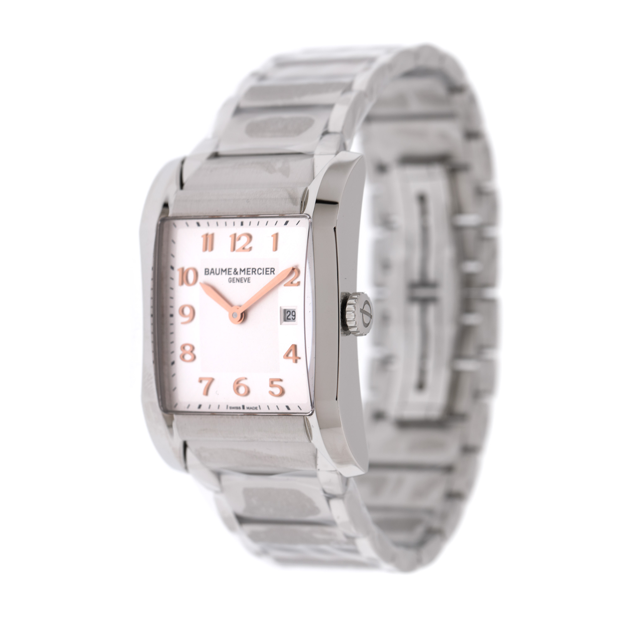 Ceas Baume & Mercier Hampton, de mână, de damă, nou, referință M0A10020. Mecanism quartz, calibrul 8111. Cadran de culoare alb, indici cu numerale arabe, cu registrul pentru dată în dreptul orei 3. Brățară originală din oțel inoxidabil, cu sistem de închidere de tip deployant. Accesorii: cutia originală, card de garanție.