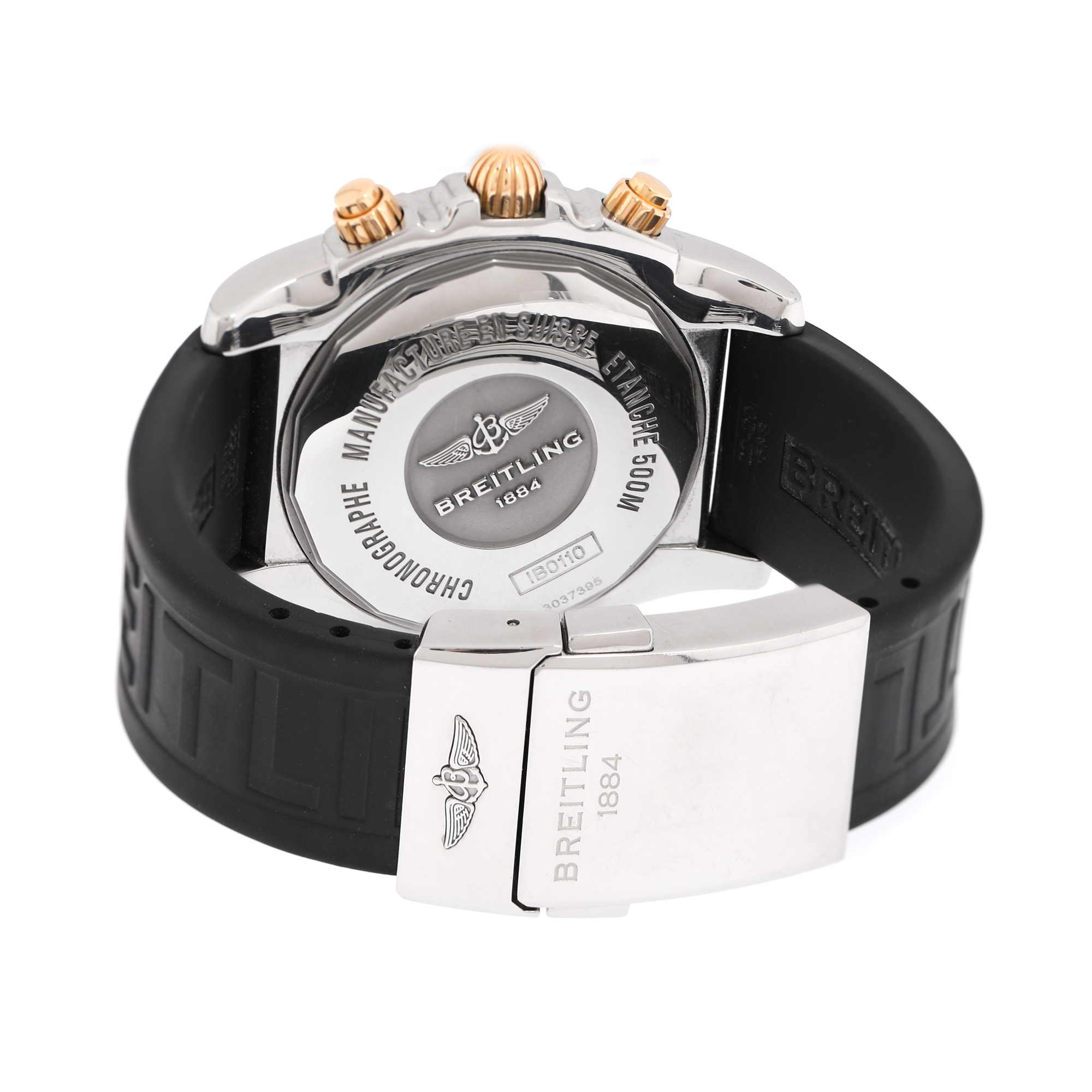 Ceas Ceas Breitling Chronomat, din aur și oțel, de mână, bărbătesc, referință IB0110. Mecanism automatic, calibrul B01, cu funcție de chronograph, bezel rotativ unidirecțional. Cadran de culoare negru, indici baghetă, cu registrul pentru dată între orele 4 și 5, două registre pentru funcția de chronograph în dreptul orelor 3 și 6 și registrul pentru secundar în dreptul orei 9. Curea originală din cauciuc, de culoare neagră, cu sistem de închidere de tip deployant.