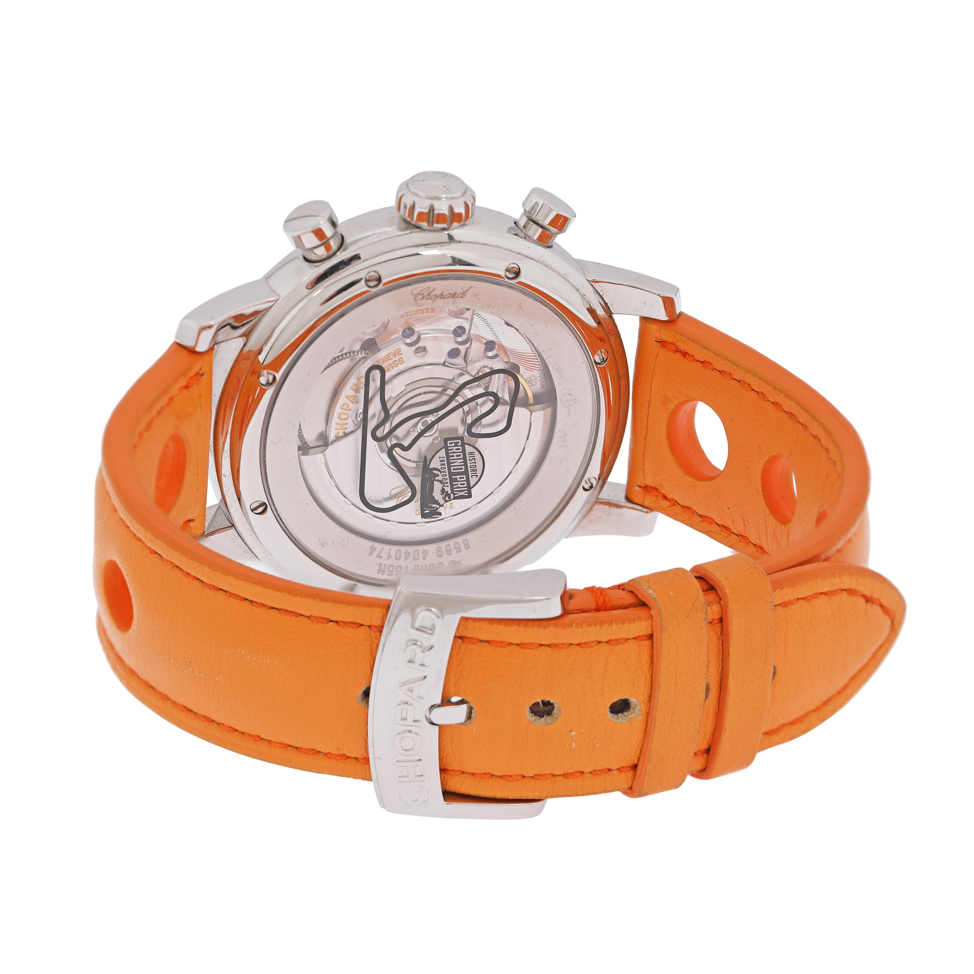 Ceas Chopard Mille Miglia Zandvoort, de mână, bărbătesc, referință 168589-3002. Mecanism tip automatic, cu funcție de cronograf, anterior vitrat. Cadran de culoare negru, indici cu numerale arabe, cu registrul pentru secundar în dreptul orei 3 și două registre pentru funcția de conograf în dreptul orelor 6 și 9. Curea originală, din piele, de culoare portocaliu, cu sistem de închidere de tip clasic.