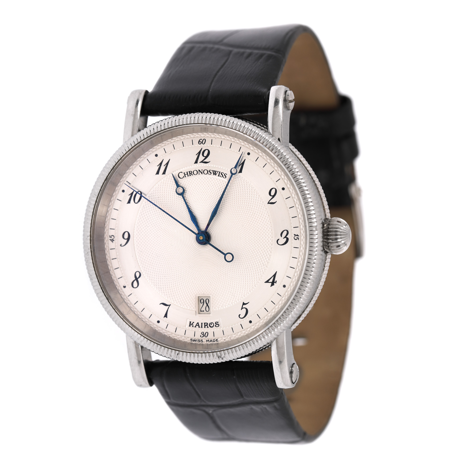 Ceas CronoSwiss Kairos, de mână, bărbătesc, referință CH 2823. Mecanism automatic, calibrul C 2892, anterior vitrat. Cadran de culoare albă, în două tonuri, indici cu numerale arabe și registrul de dată în dreptul orei 6. Curea adăugată aftermarket din piele, de culoare neagră, cu sistem de închidere de tip clasic.