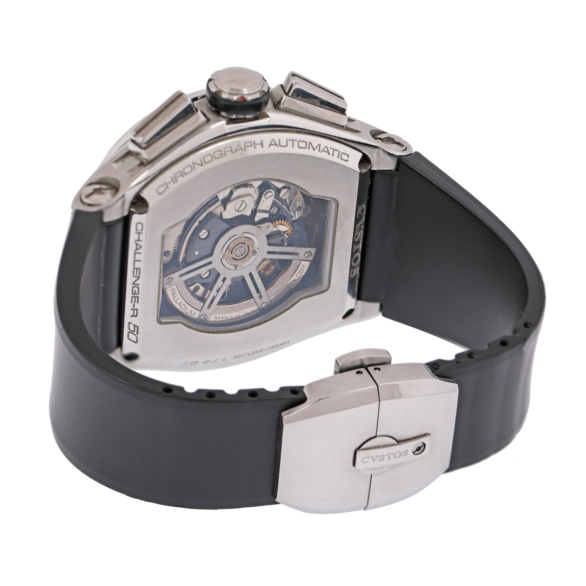 Ceas Cvstos Challenger 50, de mână, bărbătesc, referință CVQPRNSTGR. Mecanism automatic, calibrul 557 Auto, cu funcție de chronograph, anterior vitrat. Cadran de culoare neagră, indici baghetă, cu registrul pentru dată între orele 4 și 5, un registru pentru autonomia mecanismului în dreptul orei 3, două registre pentru funcția de chronograph în dreptul orelor 12 și 6 și un registru pentru secundar în dreptul orei 9. Curea originală din cauciuc, de culoare neagră, cu sistem de închidere de tip deployant.