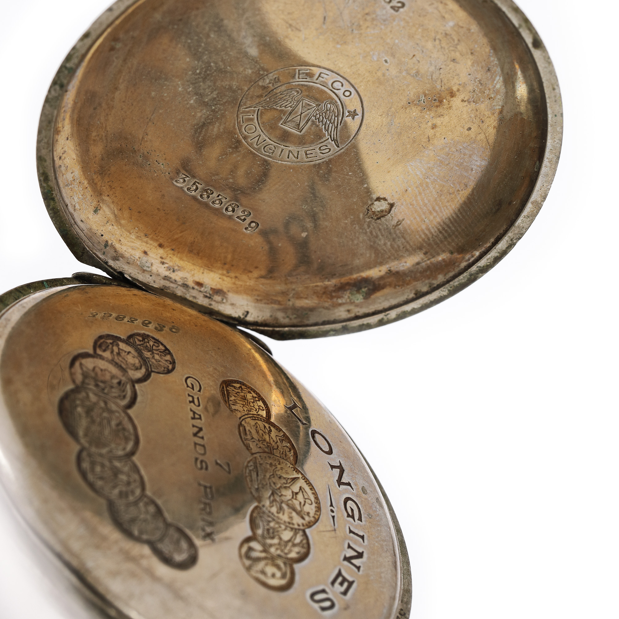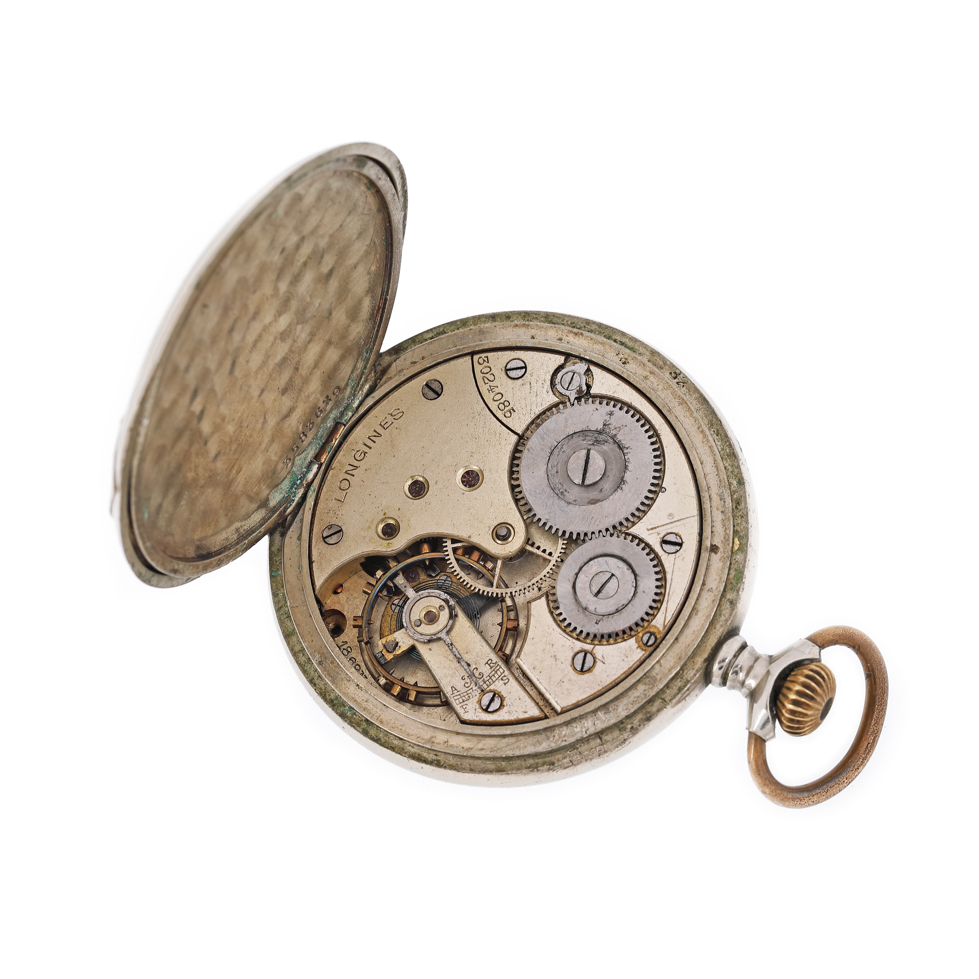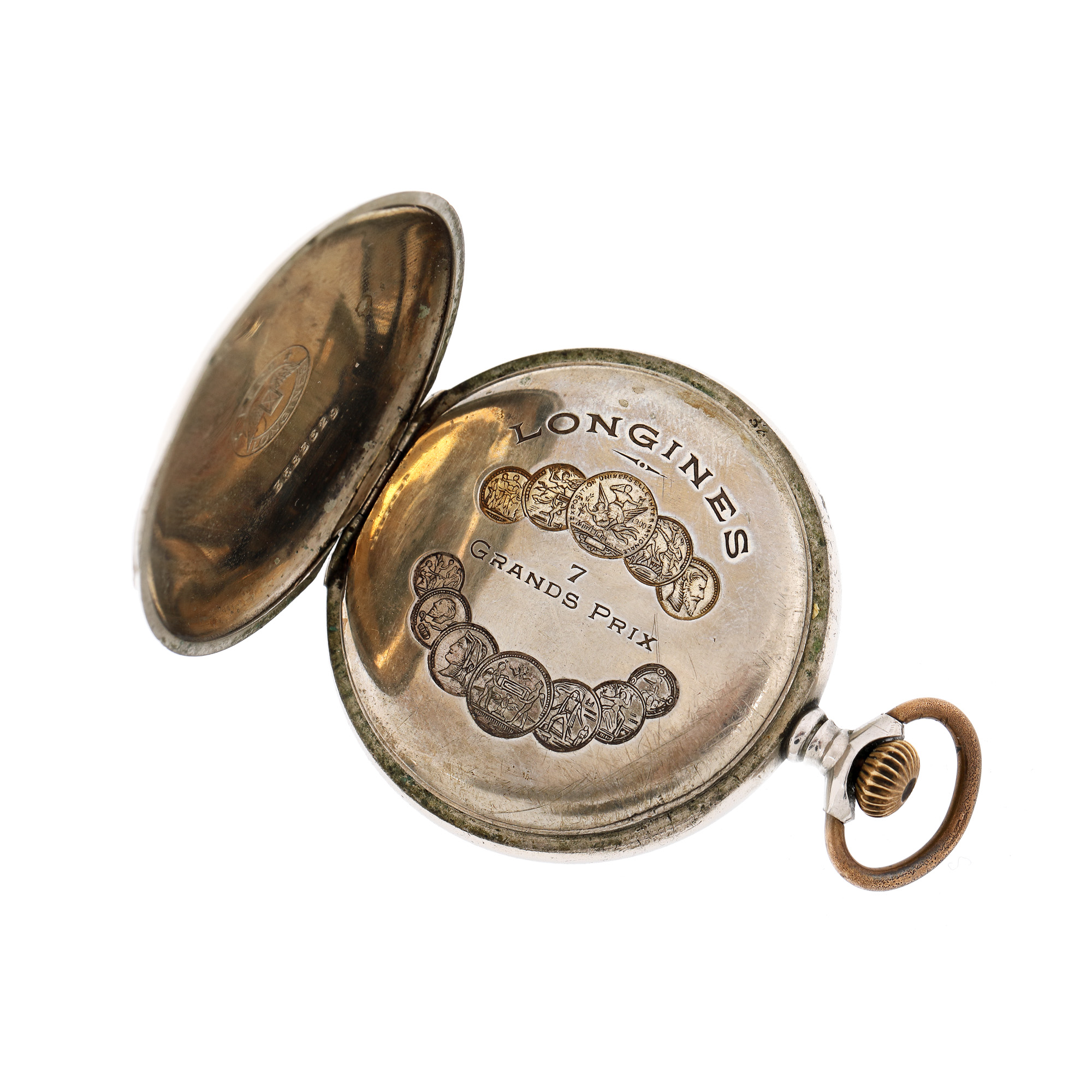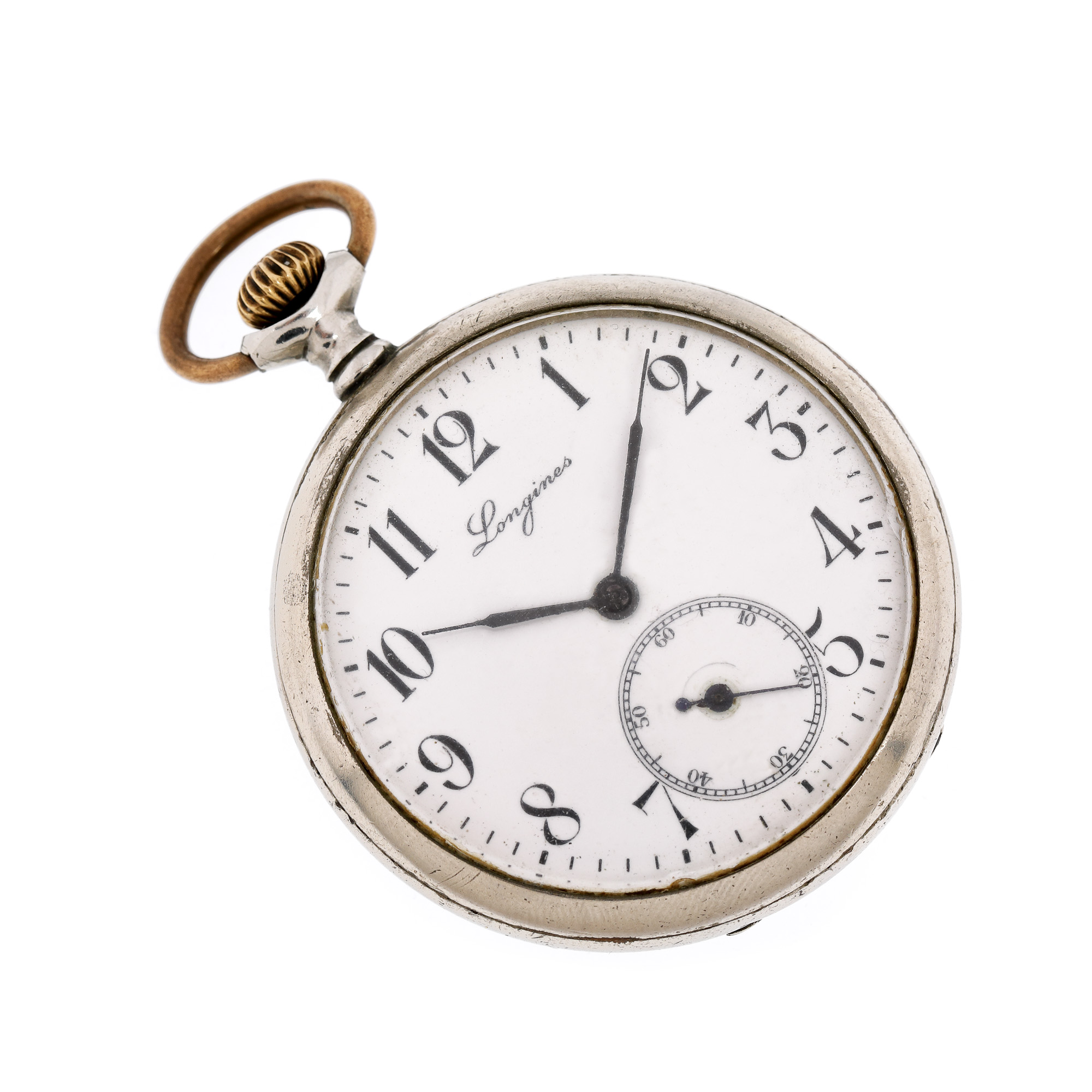 Ceas Longines Grands Prix, de buzunar, bărbătesc. Mecanism cu armare manuală, cadran de culoare alb, indici cu numerale arabe, cu registrul de secundar în dreptul orei 6.