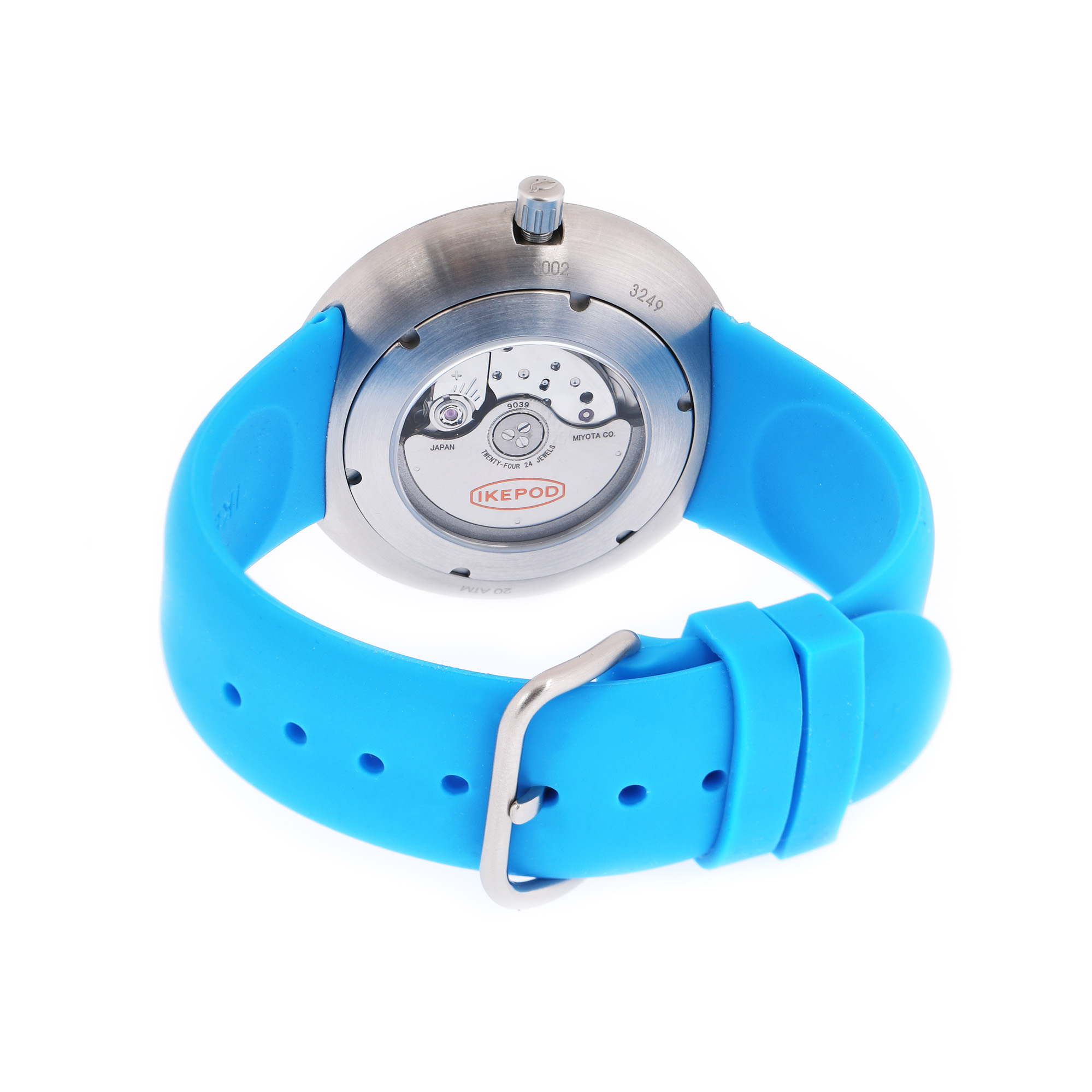 Ceas Ikepod Seapod, de mână, unisex, nou, referință S002. Mecanism automatic, calibrul Miyota 9039, cu 24 de rubine, bezel mobil, unidirecțional, anterior vitrat. Cadran de culoare negru, indici orari puncte luminiscente dublați de numerale arabe pentru minute. Curea originală, din silicon, de culoare albastră, cu sistem de închidere clasic cu cataramă. Accesorii: cutia originală, certificat de garanție.
