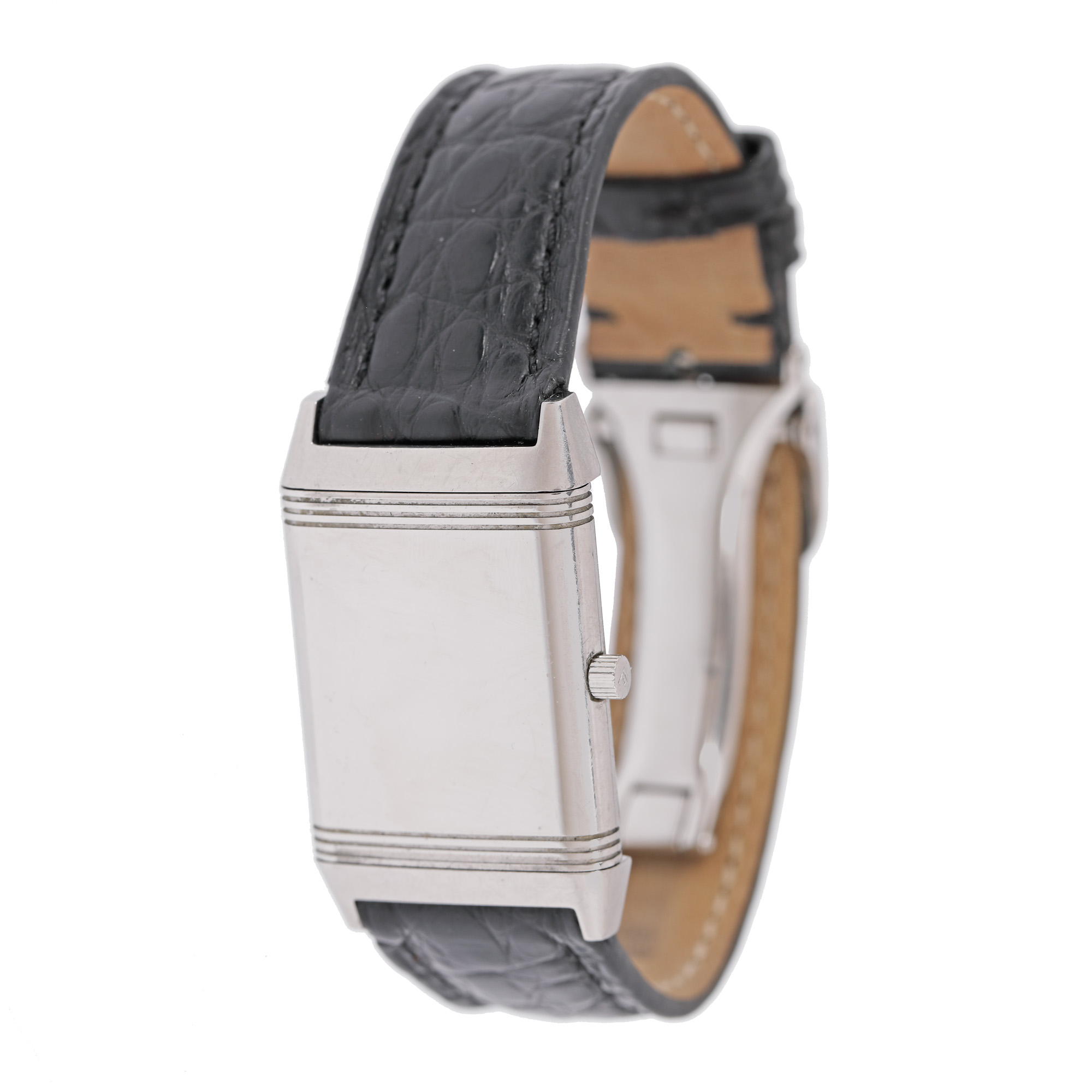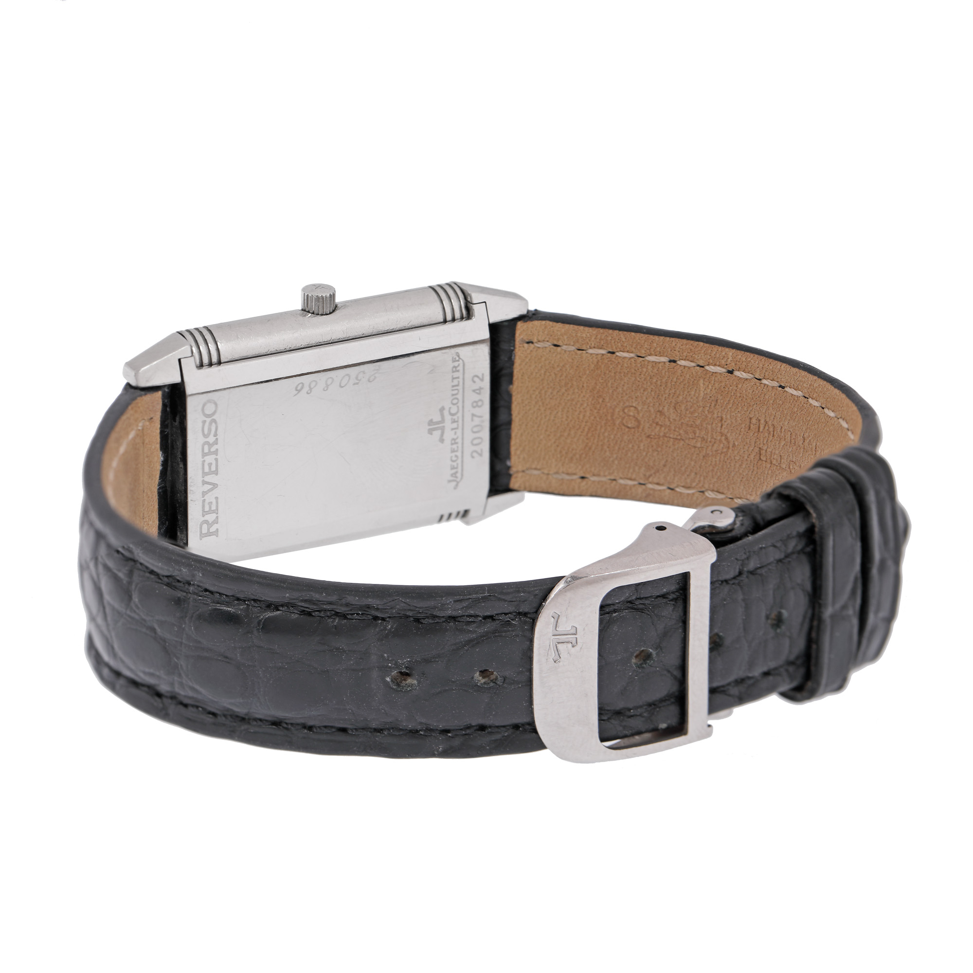 Ceas Jaeger LeCoultre Reverso Classique, de mână, unisex, referință 2007842. Mecanism cu armare manuală, carcasă reversibilă. Cadran de culoare argintiu, indici numerale arabe. Curea adăugată aftermarket, din piele, de culoare neagră, cu sistem de închidere de tip deployant, original.