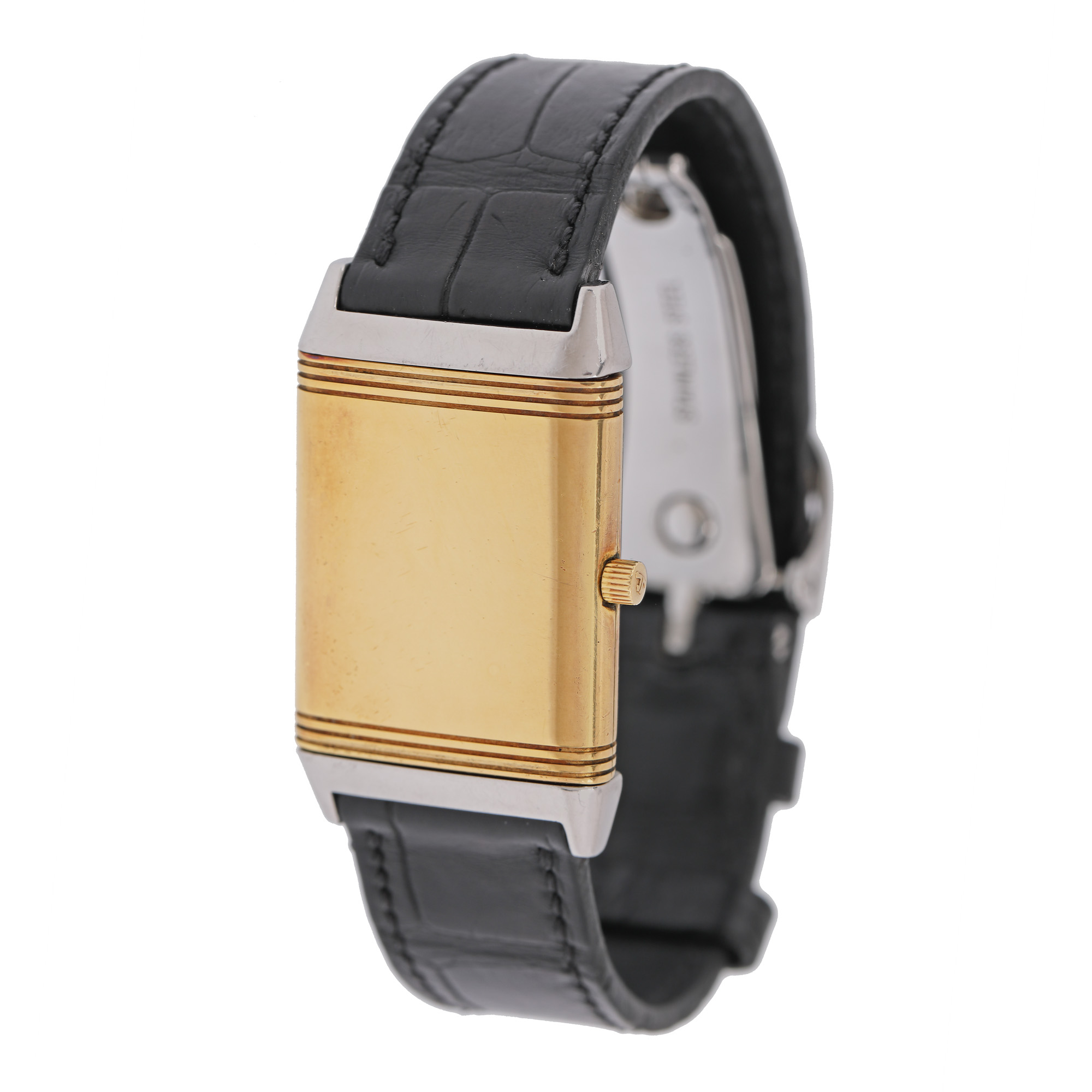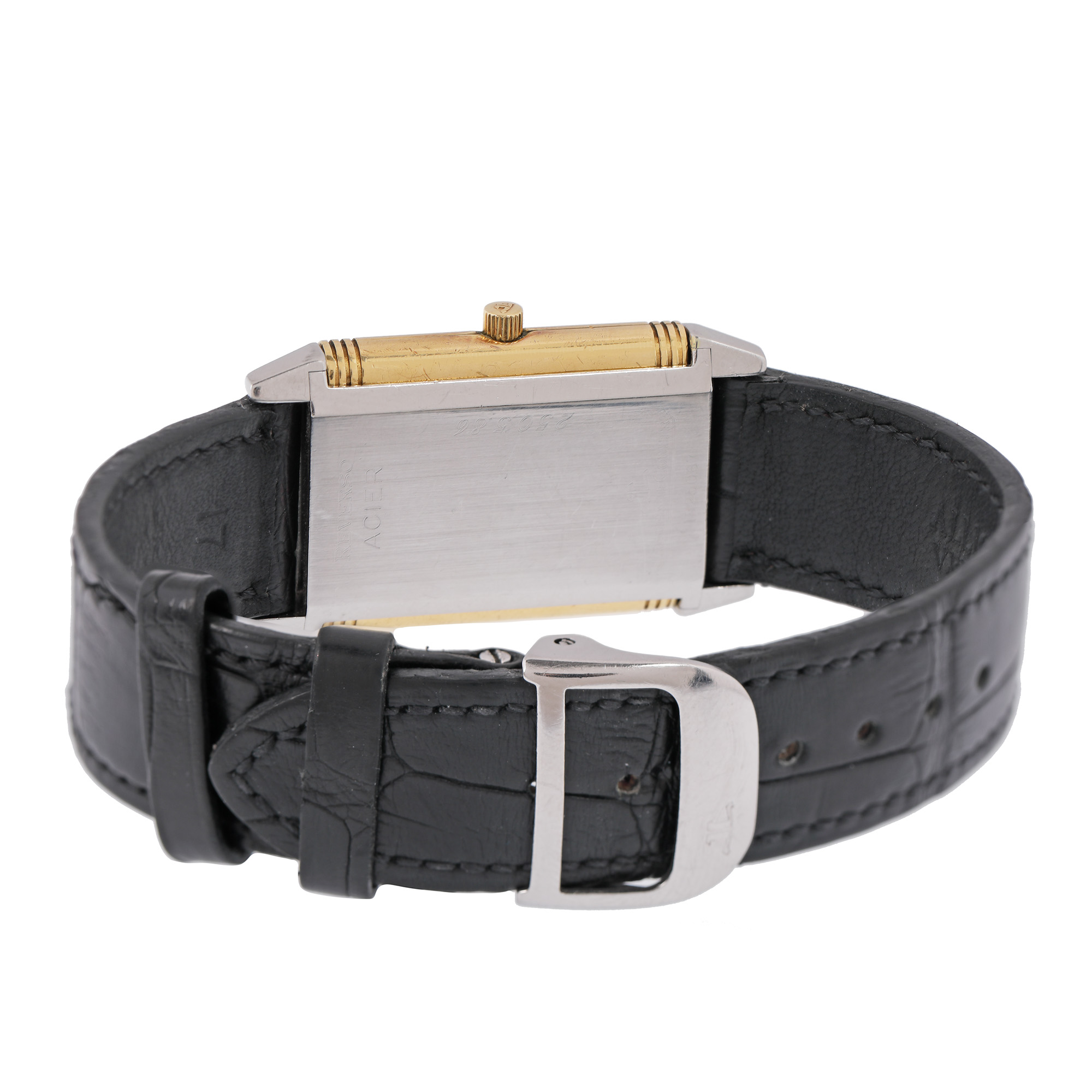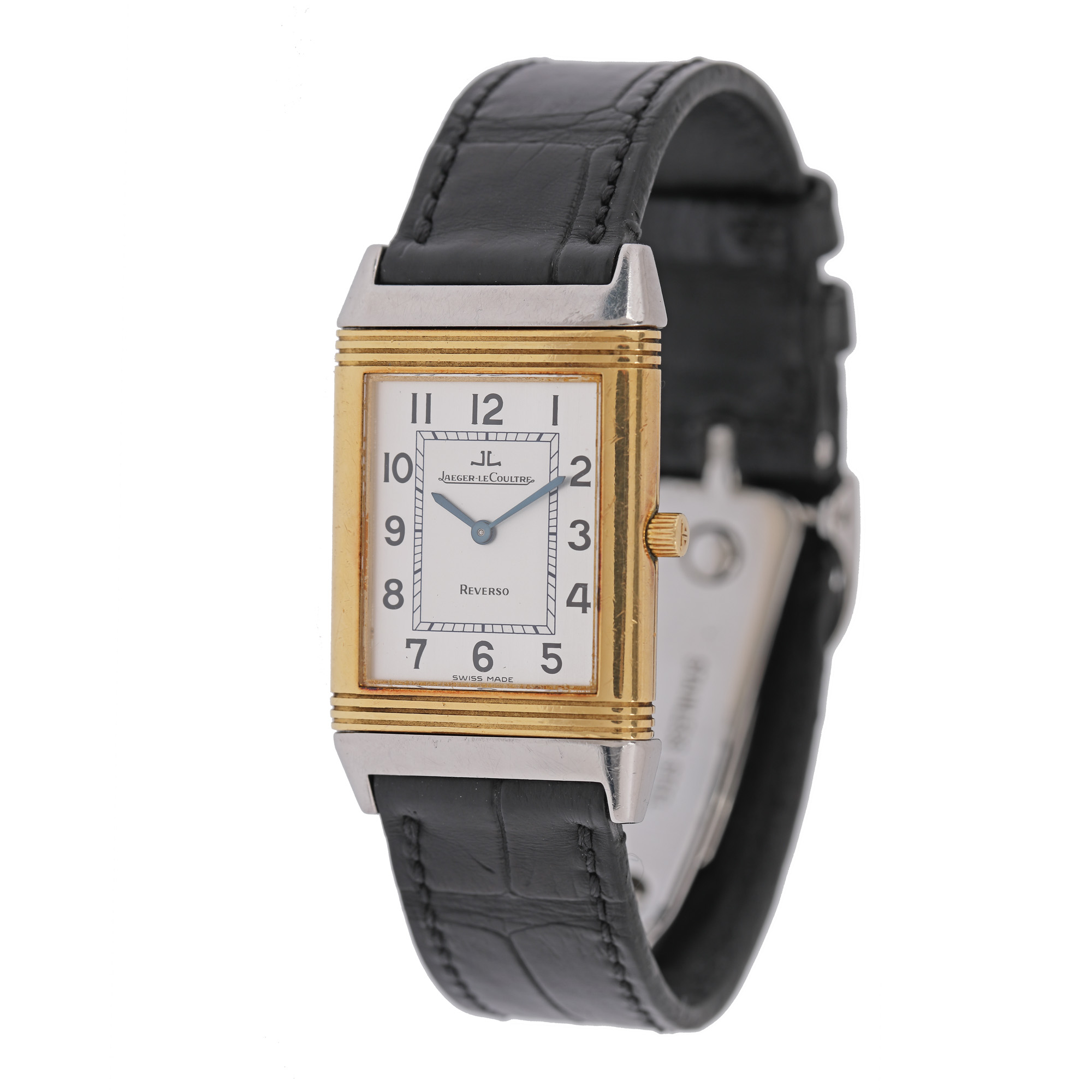 Ceas Jaeger LeCoultre Reverso Classique, din aur și oțel, de mână, unisex, referință 1825037. Mecanism cu armare manuală, carcasă reversibilă. Cadran de culoare argintiu, indici numerale arabe. Curea adăugată aftermarket, din piele de aligator, de culoare neagră, cu sistem de închidere de tip deployant, original.
