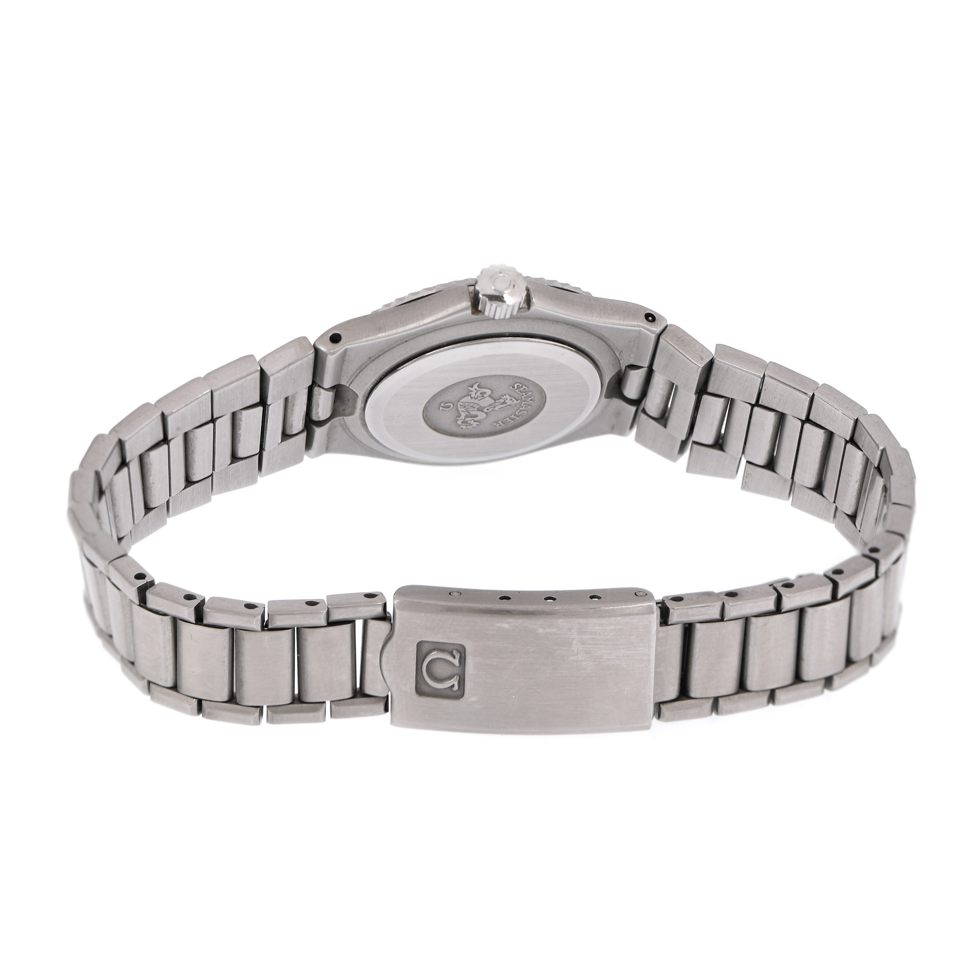 Ceas Omega Seamaster Lady, de mână, de damă, referință 1380. Mecanism quartz, calibru 1380, bezel rotativ unidirecțional. Cadran de culoare argintiu, indici-baghetă de culoare neagră, cu registrul de dată în dreptul orei 3. Brățară originală, din oțel inoxitabil, cu sistem de închidere de tip deployant.