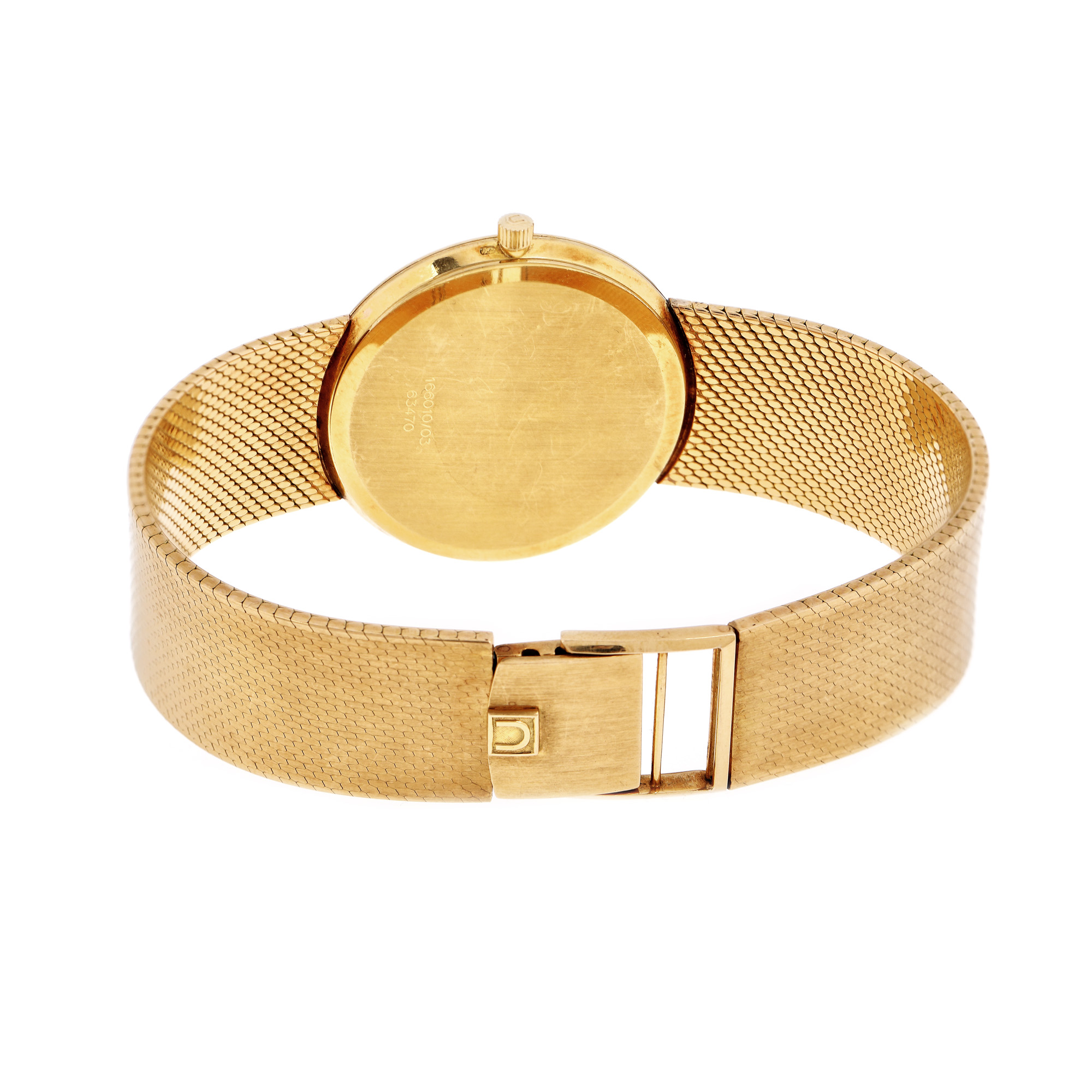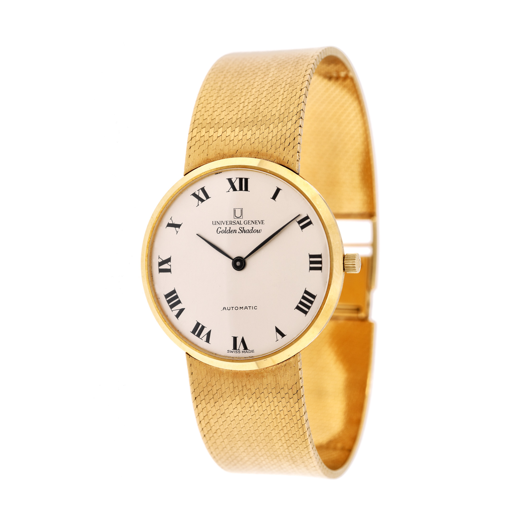 Ceas Universal Geneve Golden Shadow, din aur, de mână, unisex. Mecanism automatic, cadran de culoare albă, cu numerale romane. Brățară originală, din aur, cu sistem de închidere cu clemă.