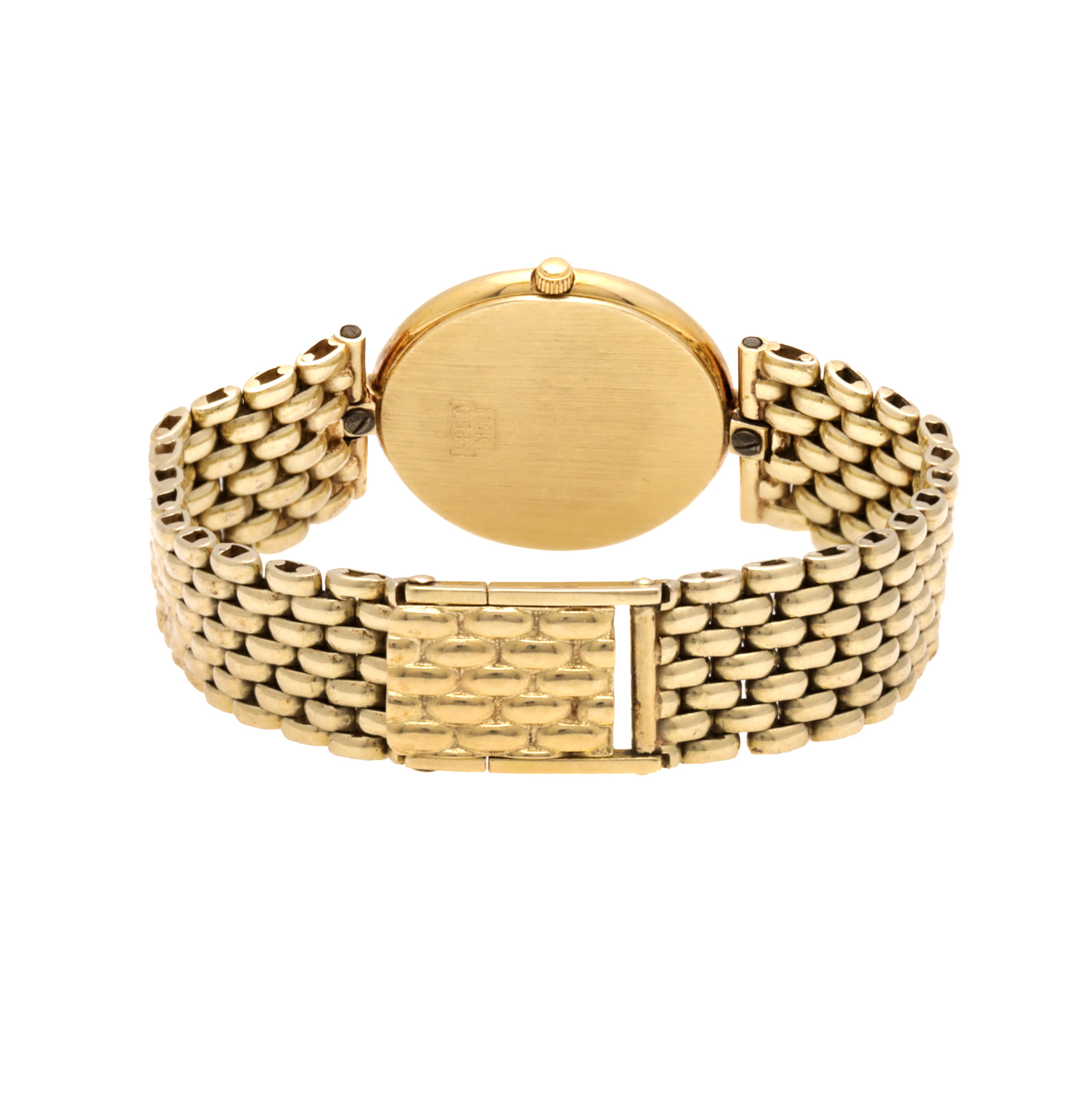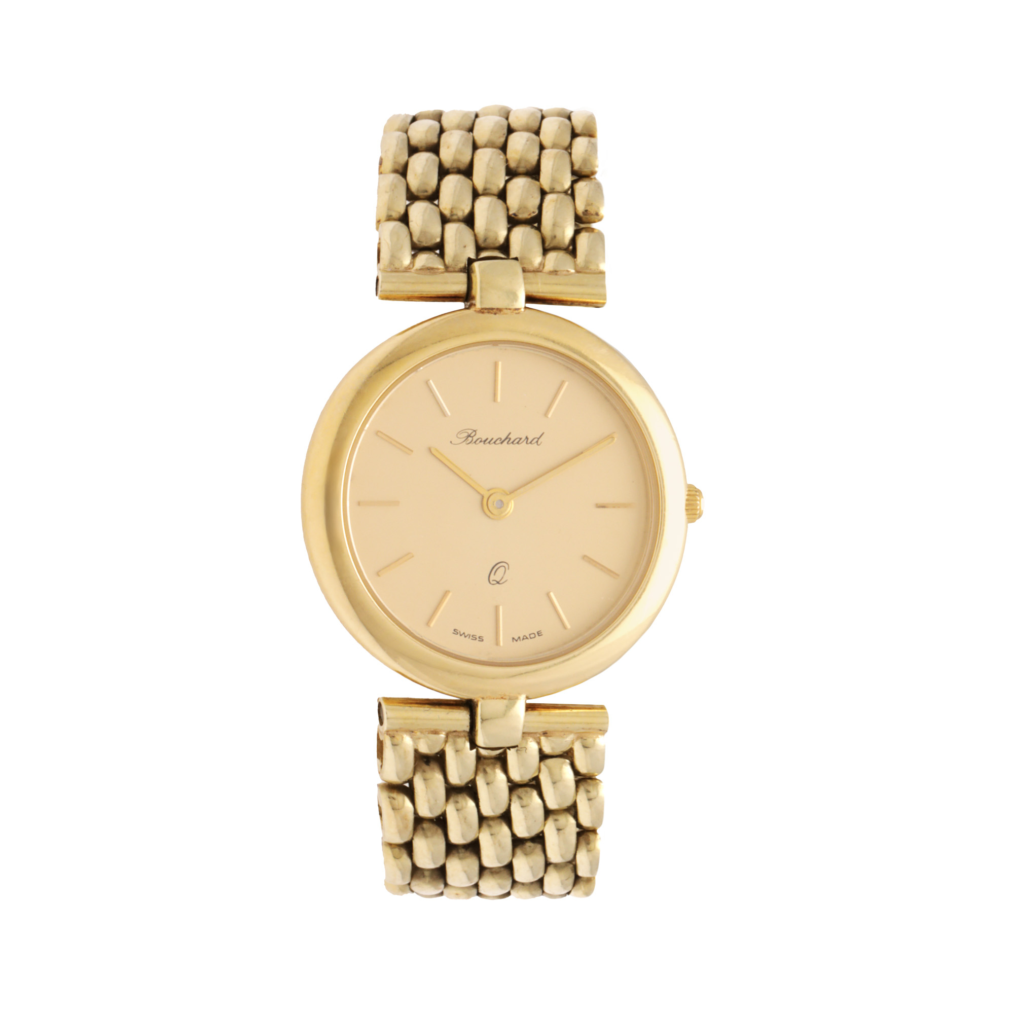Ceas Bouchard, din aur, de mână, de damă. Mecanism quartz. Cadran de culoare auriu, indici baghete. Brățară originală, din aur, cu sistem de închidere de tip clemă. Accesorii: cutia originală, două zale suplimentare și certificat de garanție