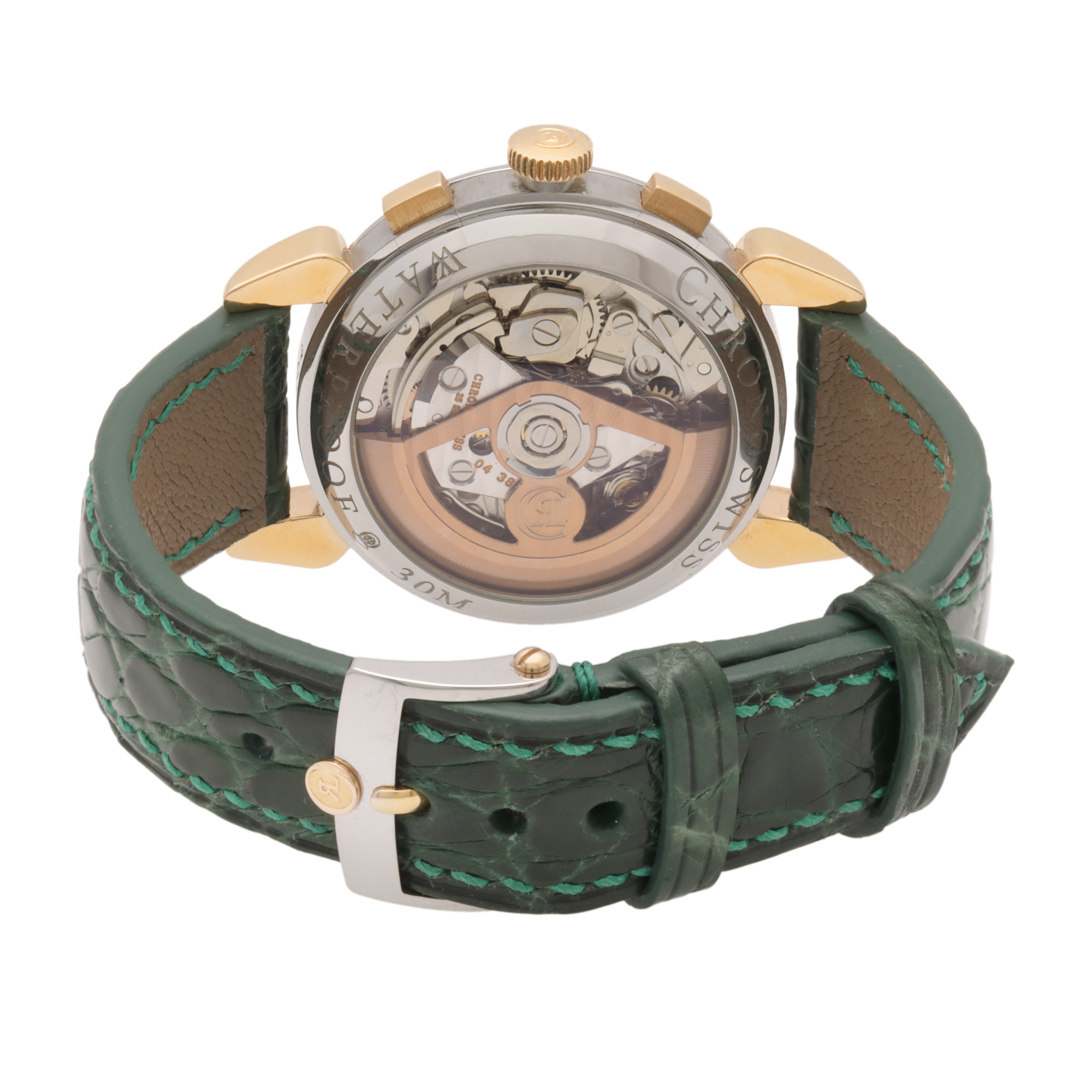 Ceas Chronoswiss Klassik, din aur și oțel, de mână, bărbătesc, referință 7404. Mecanism automatic, calibrul 7750, cu funcție de chronograph, anterior vitrat. Cadran de culoare auriu, indici aplicați cu numerale romane pentru orele 1, 5, 7, 11, indici aplicați cu puncte pentru orele 2, 4, 8, 10, cu două registre pentru funcția de chronograph în dreptul orelor 12 și 6, un registru pentru dată în dreptul orei 3 și un registru pentru secundar în dreptul orei 9. Curea adăugată aftermarket, cu închizățoare originală.