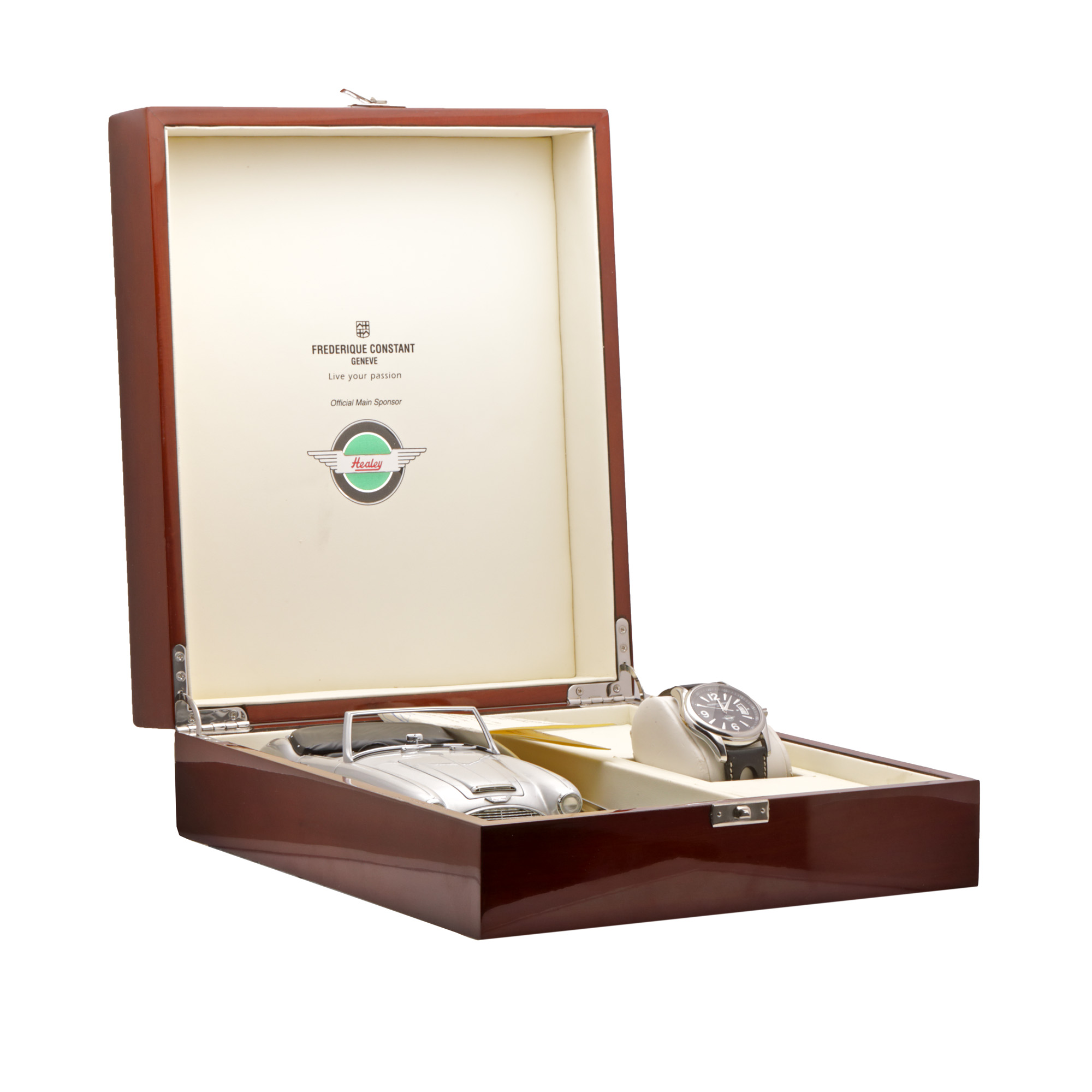 16. Ceas Frederique Constant Healey, de mână, bărbătesc, însoțit de cutia originală, manual de instrucțiuni, machetă mașină Austin-Healey [2010]