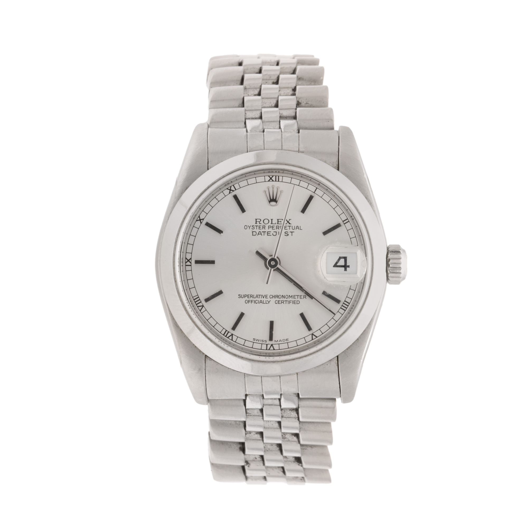 Ceas Rolex Datejust, de mână, de damă, referință 179160. Mecanism automatic, calibrul 2235. Cadran de culoare argintiu irizat, indici baghete, cu un registru pentru dată în dreptul orei 3. Brățară originală "presidential", din oțel, cu sistem de închidere de tip deployant.