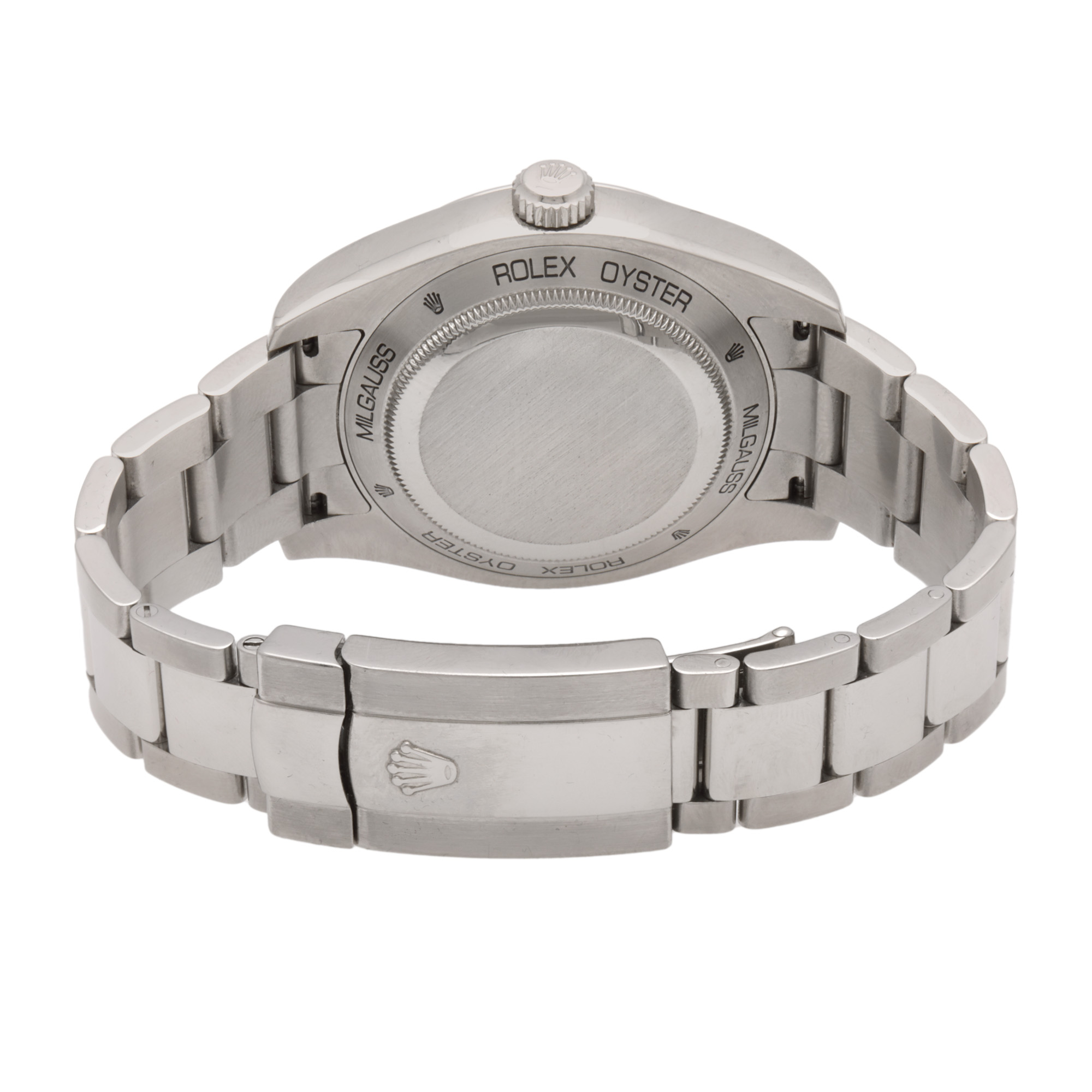 Ceas Rolex Milgauss, de mână, bărbătesc, referință 116400. Mecanism automatic, calibrul 3131. Cadran de culoare alb, cu indici baghetă. Brățară originală, din oțel inoxidabil, cu sistem de închidere de tip deployant.