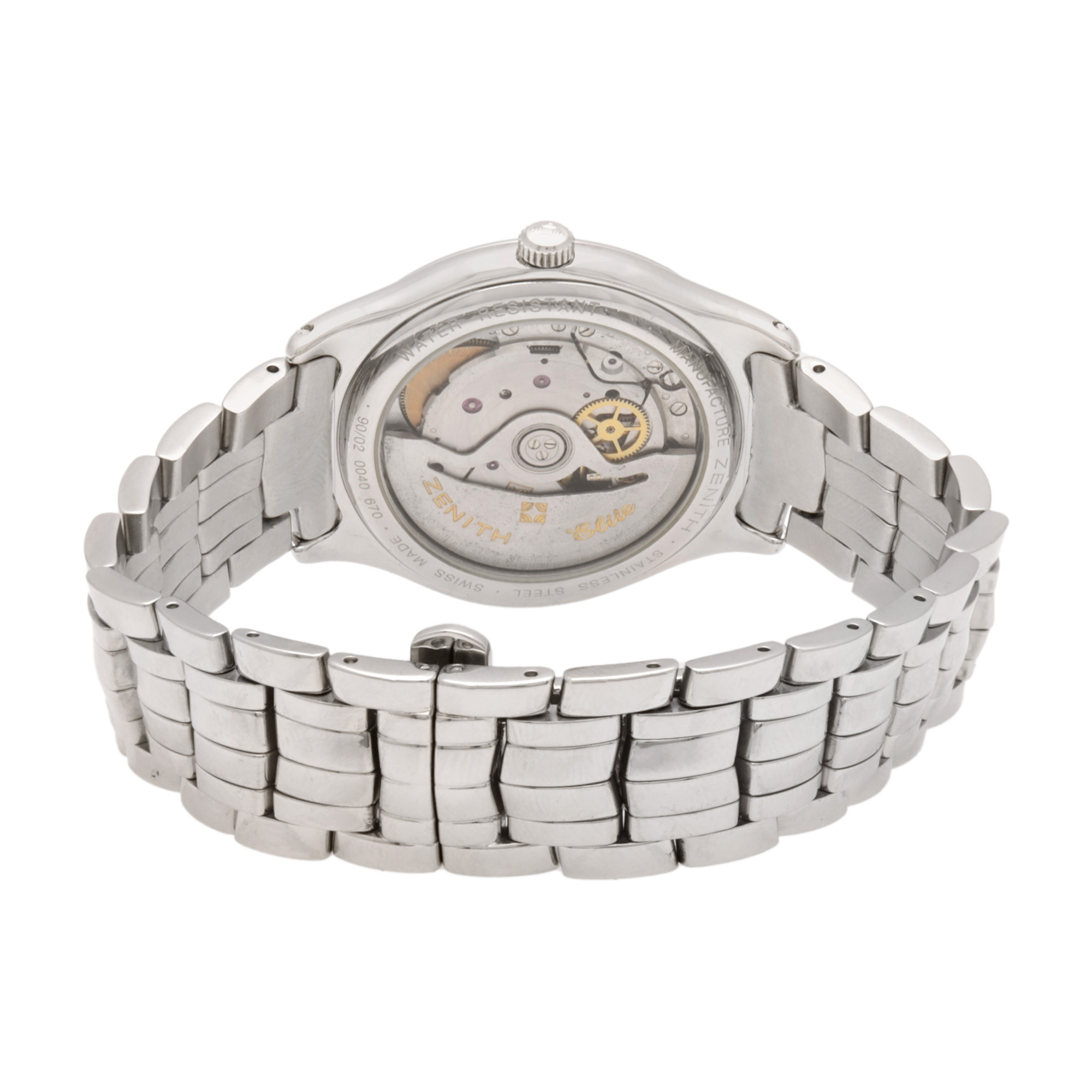 Ceas Zenith Elite, de mână, bărbătesc, referință 90/01.0040.670. Mecanism automatic, calibrul Zenith 670, cu 27 de rubine, anterior vitrat. Cadran de culoare argintiu, indici săgeți, regisru pentru dată între orele 4 și 5. Brățară originală, din oțel, cu sistem de închidere de tip deployant.