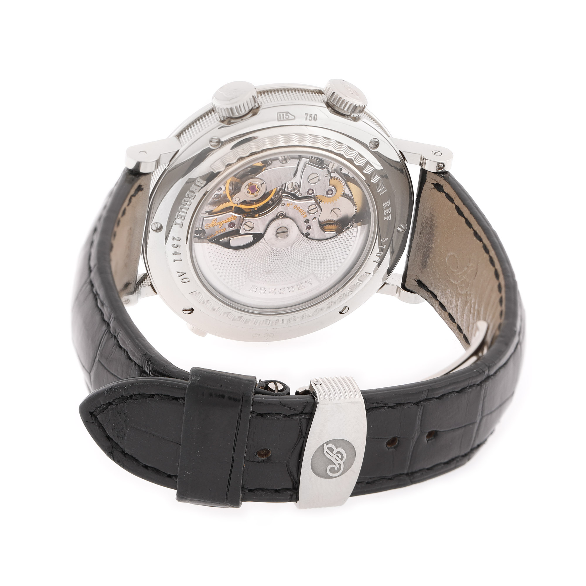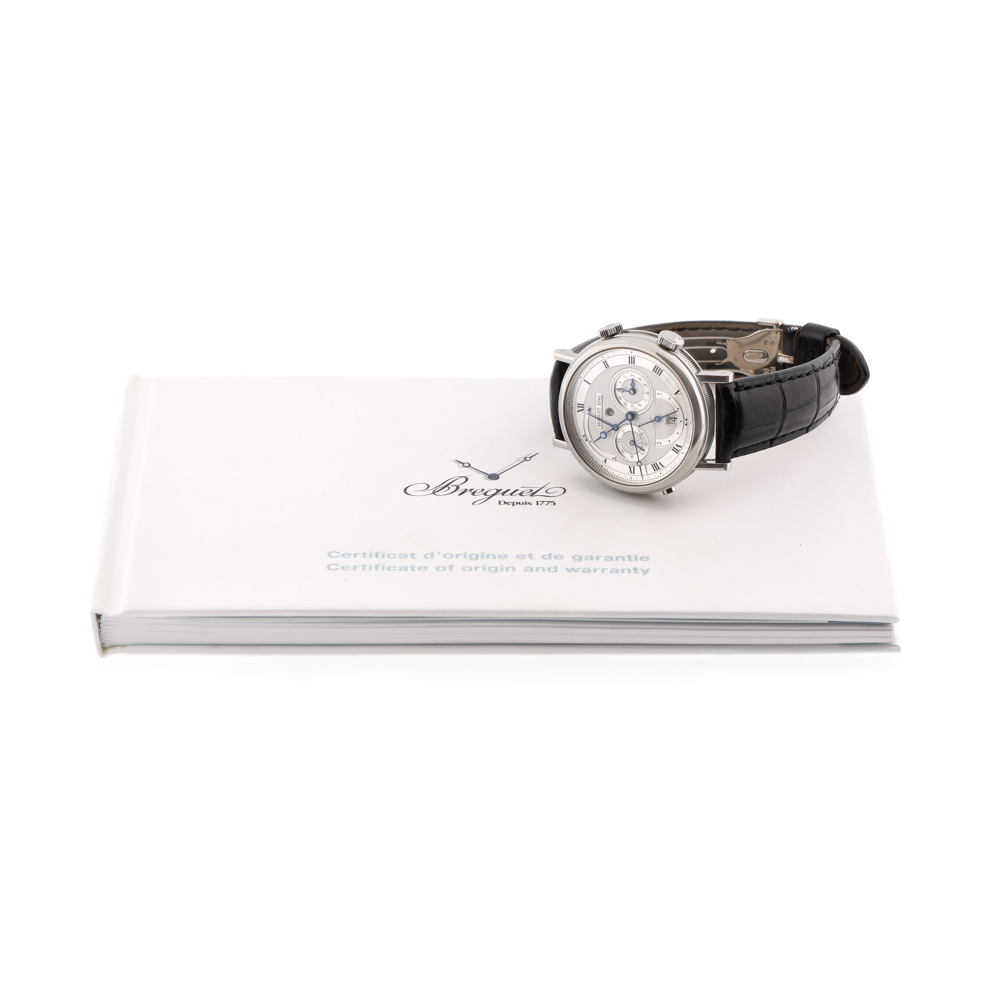 Ceas Breguet Classique Le Réveil du Tsar, din aur alb, de mână, bărbătesc, referință 5707, calibru 519F, rezervă de timp 45 h, anterior vitrat. Cadran de culoare argintiu, decorat în tehnica guilloché, cu numerale arabe, cronograf tri-compax, registru pentru rezervă de timp, registru pentru dată în dreptul orei 6 și registru pentru alarmă în dreptul orei 12. Curea din piele de aligator, de culoare neagră, cu cataramă, originale. Accesorii: certificat de garanție nesemnat, nedatat, ștampilat cu ștampila retailer-ului