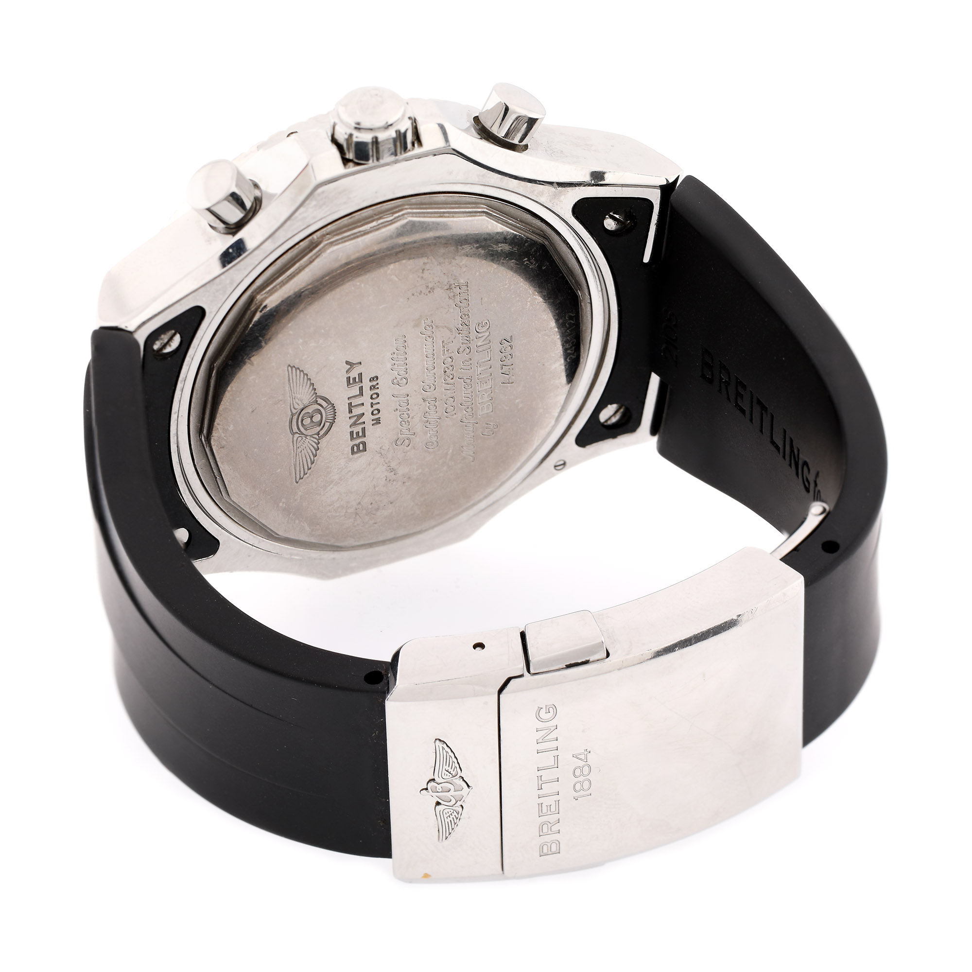 Ceas Breitling for Bentley, de mână, bărbătesc, referință A47362, mecanism automatic. Cadran de culoare negru, trei registre, numerale arabe, scală tahimetrică și registru pentru dată în dreptul orei 6. Curea din silicon, de culoare neagră și sistem de închidere tip deployant, originale.