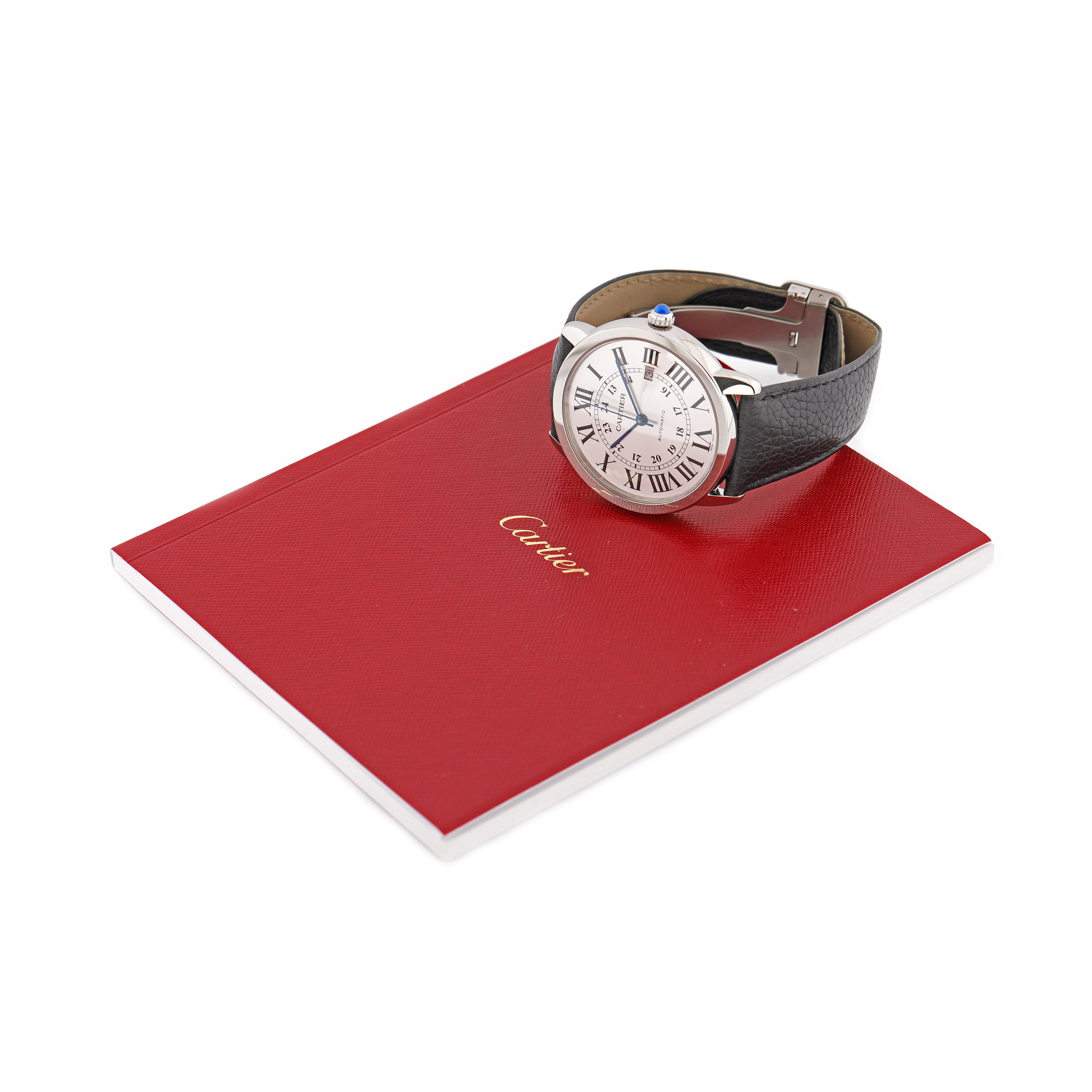Ceas Cartier Ronde Solo, de mână, bărbătesc, referință W6701010, mecanism automatic, calibru 049, rezervă de timp 42 h. Cadran de culoare alb, cu numerale romane, indicator pentru 24 h cu numerale arabe și registru pentru dată în dreptul orei 3. Curea din piele de vițel, de culoare neagră, cu sistem de închidere tip deployant, originale. Accesorii: certificat de garanție ștampilat cu ștampila retailer-ului, datat 04.09.2019
