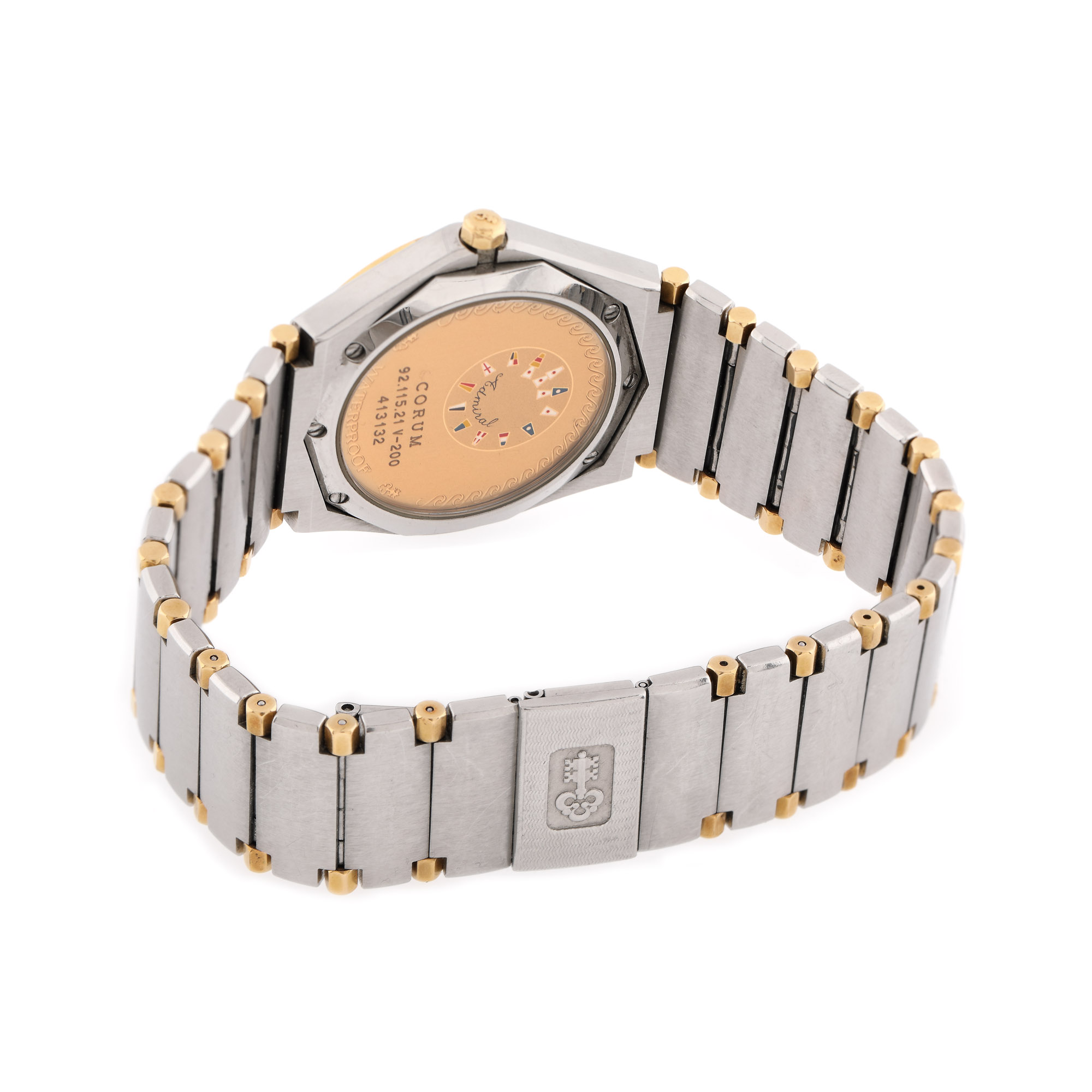 Ceas Corum Admiral Triple Date, de mână, bărbătesc, referință 92.115.21, mecanism quartz, calibru V-200. Cadran de culoare alb, cu indici orari din aur, registru pentru zi, dată, lună și 24 h. Curea cu sistem de închidere tip deployant din oțel inoxidabil și aur, originale. Accesorii: cutie originală; manual de utilizare.