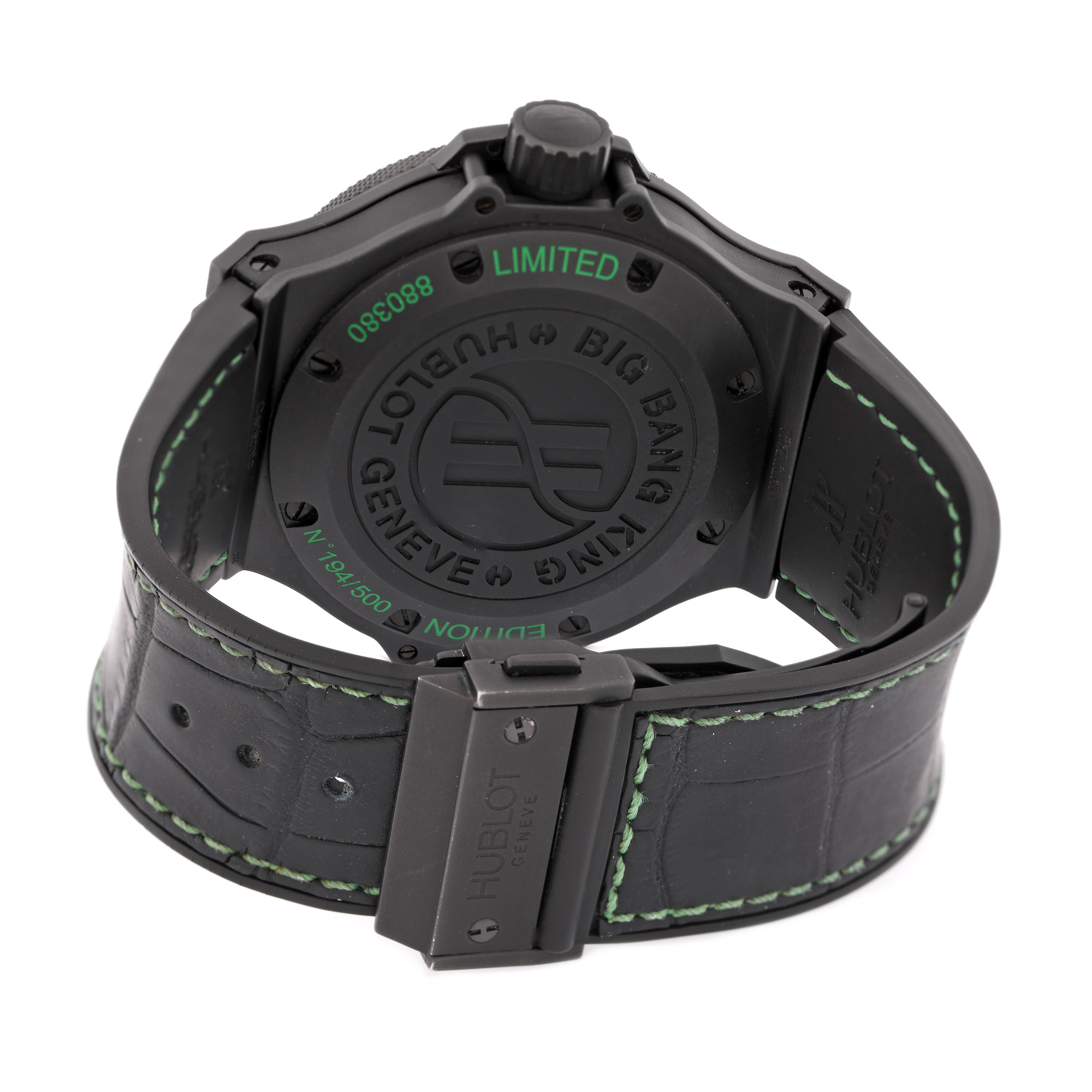 Ceas Hublot Big Bang King All Black Green, din ceramică, de mână, bărbătesc, ediție limitată 194/500, referință 322.CI.1190.GR.ABG11, mecanism automatic, calibru HUB 1400, rezervă de timp 42 h. Cadran de culoare negru, cu indici orari verzi și registru pentru dată în dreptul orei 3. Bezel rotativ unidirecțional. Curea din piele de aligator anterior cauciucată, de culoare neagră și sistem de închidere tip deployant, originale.