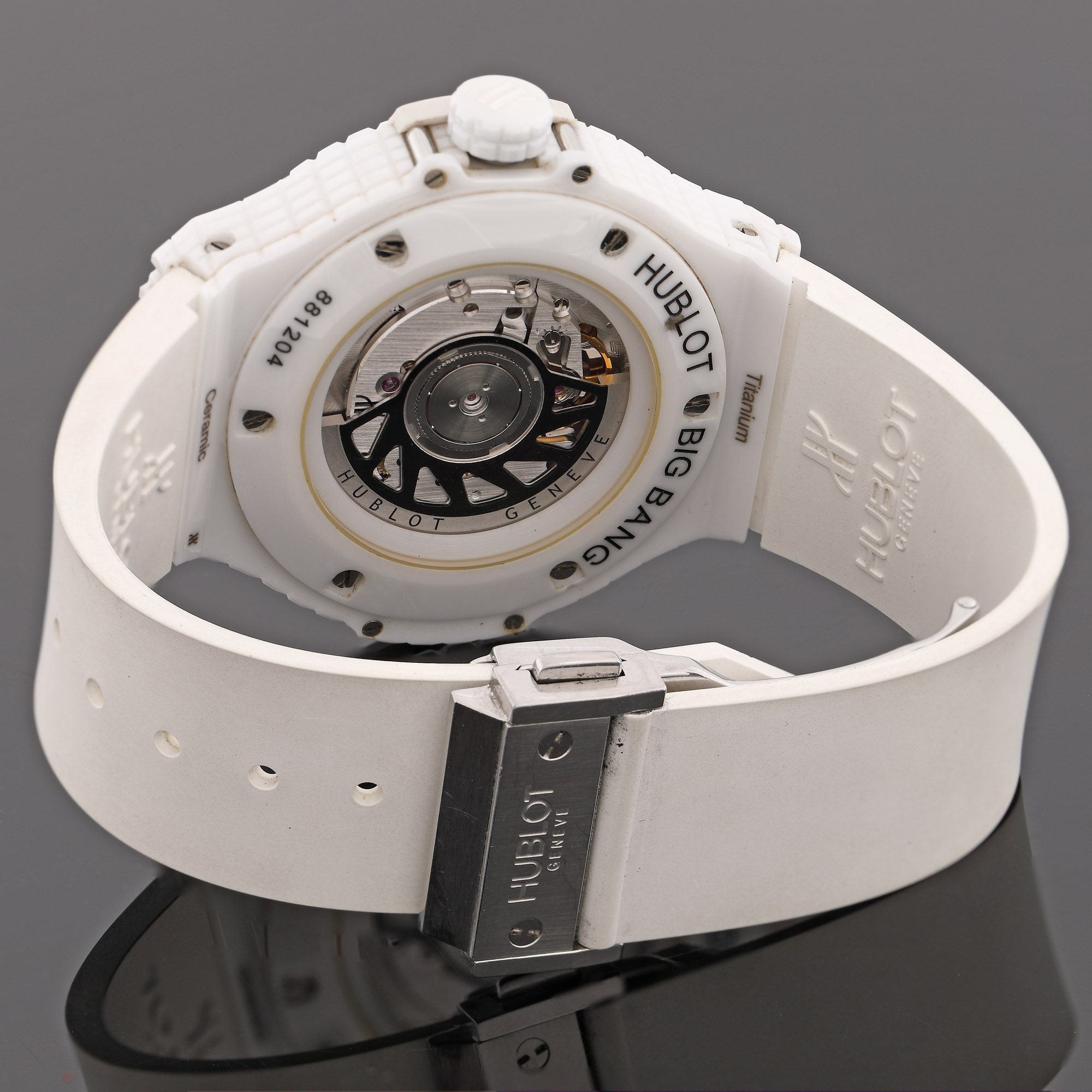 Ceas Hublot Big Bang White Caviar Ceramic, de mână, bărbătesc, referință 346.HX.2800.BR, mecansim automatic, rezervă de timp 42 h, anterior vitrat. Cadran de culoare alb și registru pentru dată în dreptul orei 3. Curea din cauciuc, de culoare alb, și sistem de închideret tip deployant, originale.
