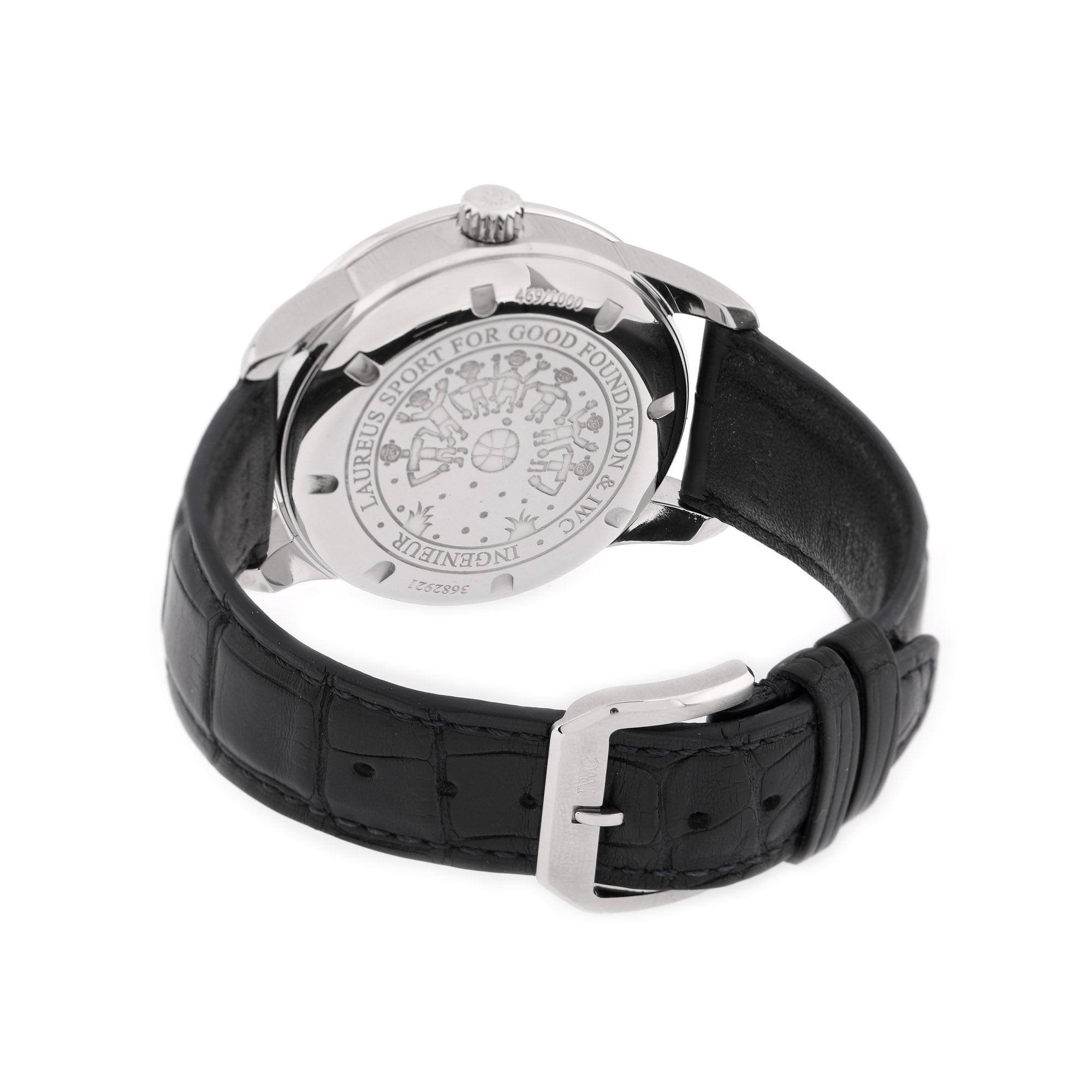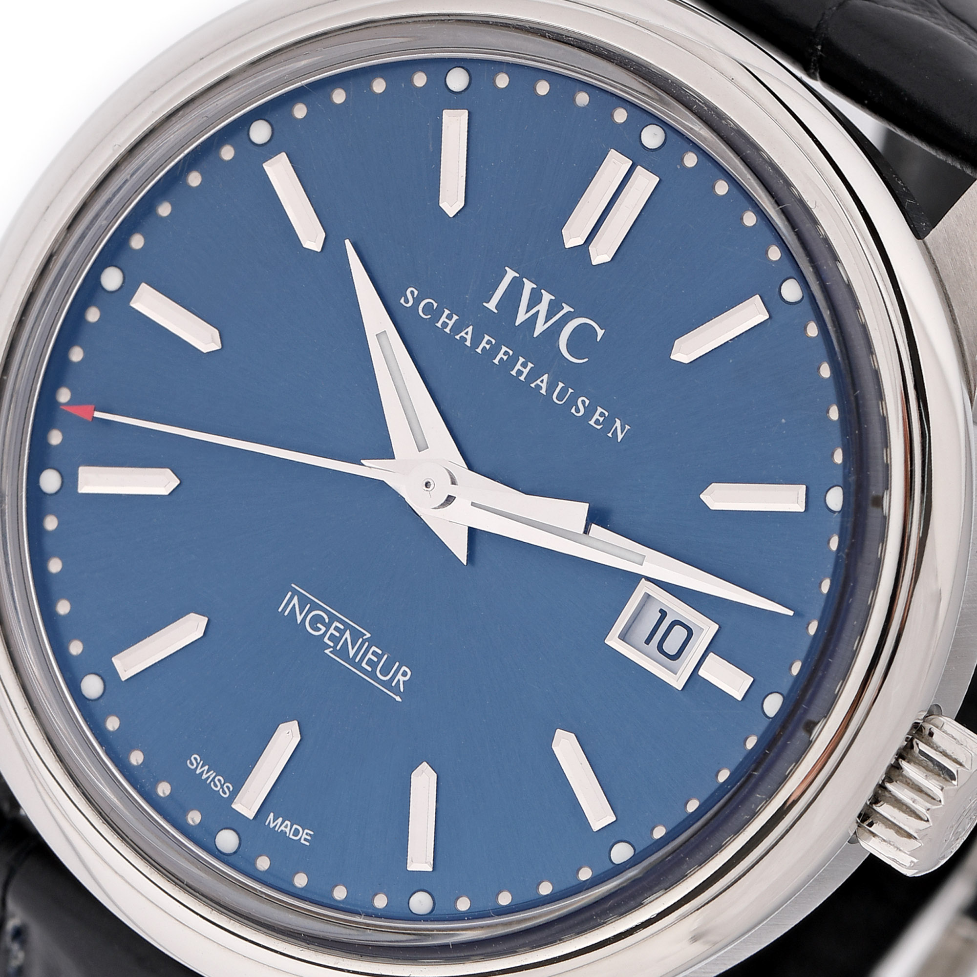 Ceas IWC Ingenieur, de mână, bărbătesc, referință IW323310, mecanism automatic. Cadran de culoare bleumarin, indici orari din oțel inoxidabili și registru pentru dată în dreptul orei 3. Curea din piele de aligator, de culoare bleumarin și cataramă din oțel inoxidabil, originale.