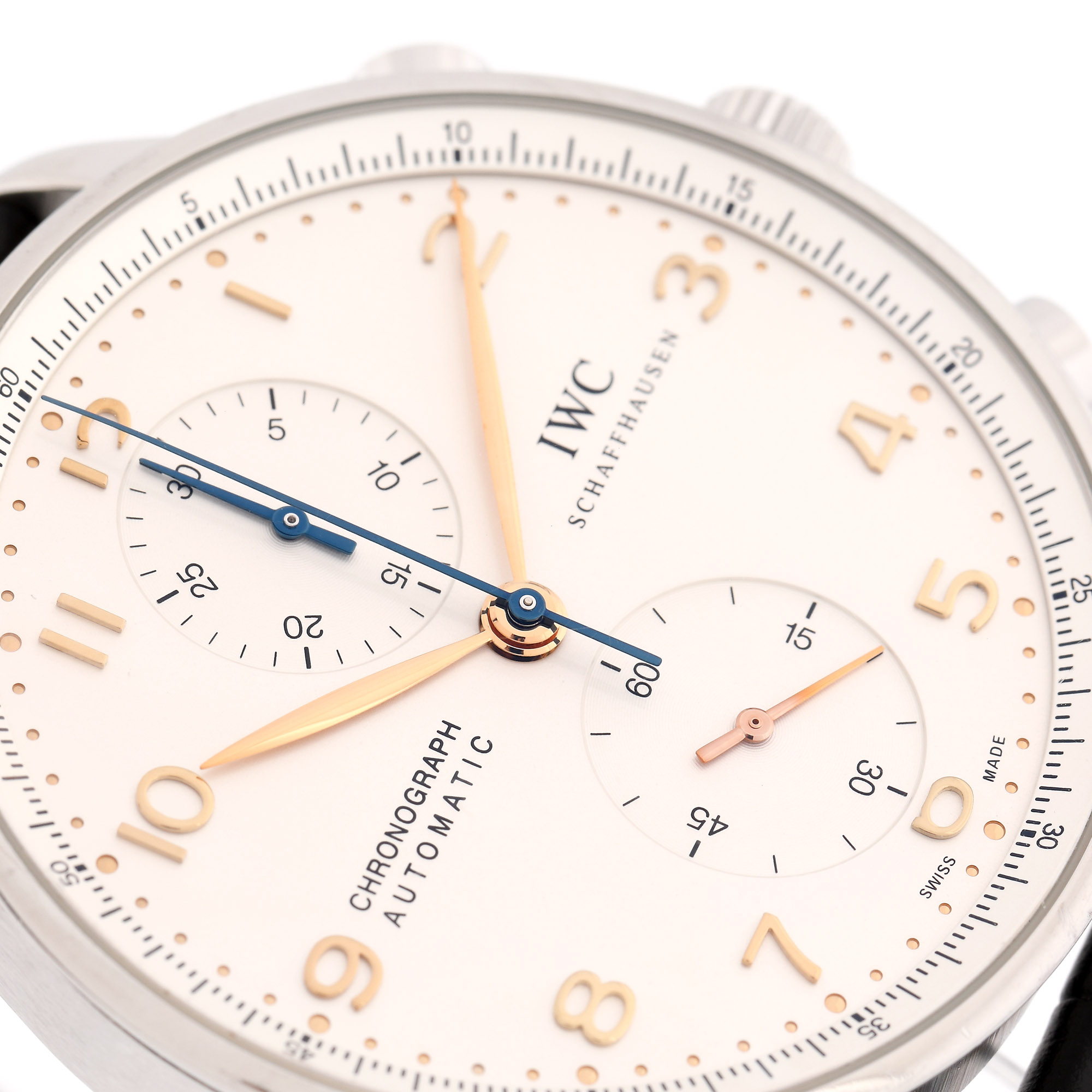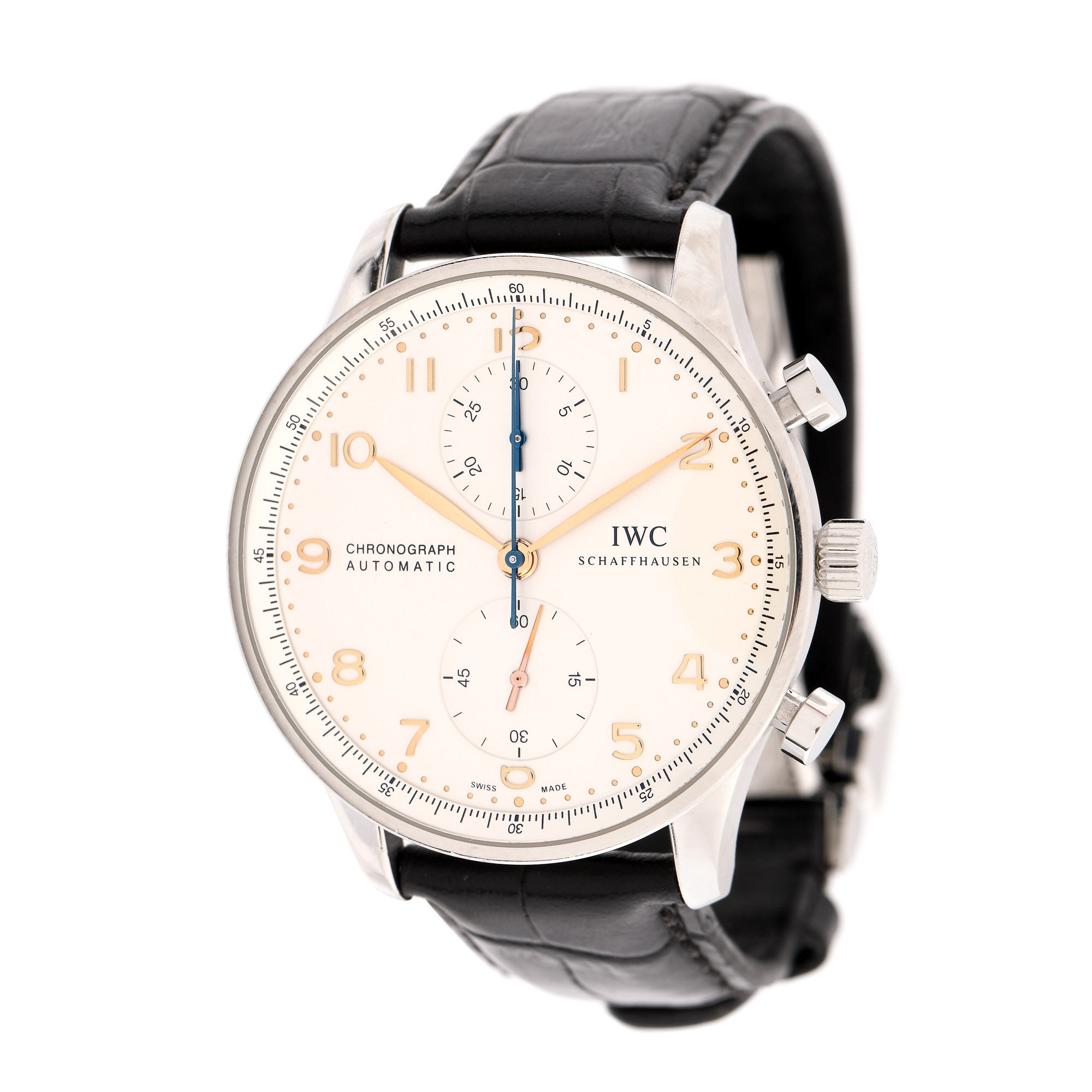 Ceas IWC Schaffhausen Portugieser Chronograph, de mână, bărbătesc, referință IW371445, mecanism automatic, calibru 79350, rezervă de timp 44 h. Cadran de culoare alb, indicatori orari din aur galben, numerale arabe și cronograf bi-compax. Curea din piele de aligator, de culoare neagră, adăugată aftermarket și sistem de închidere tip deployant, original.