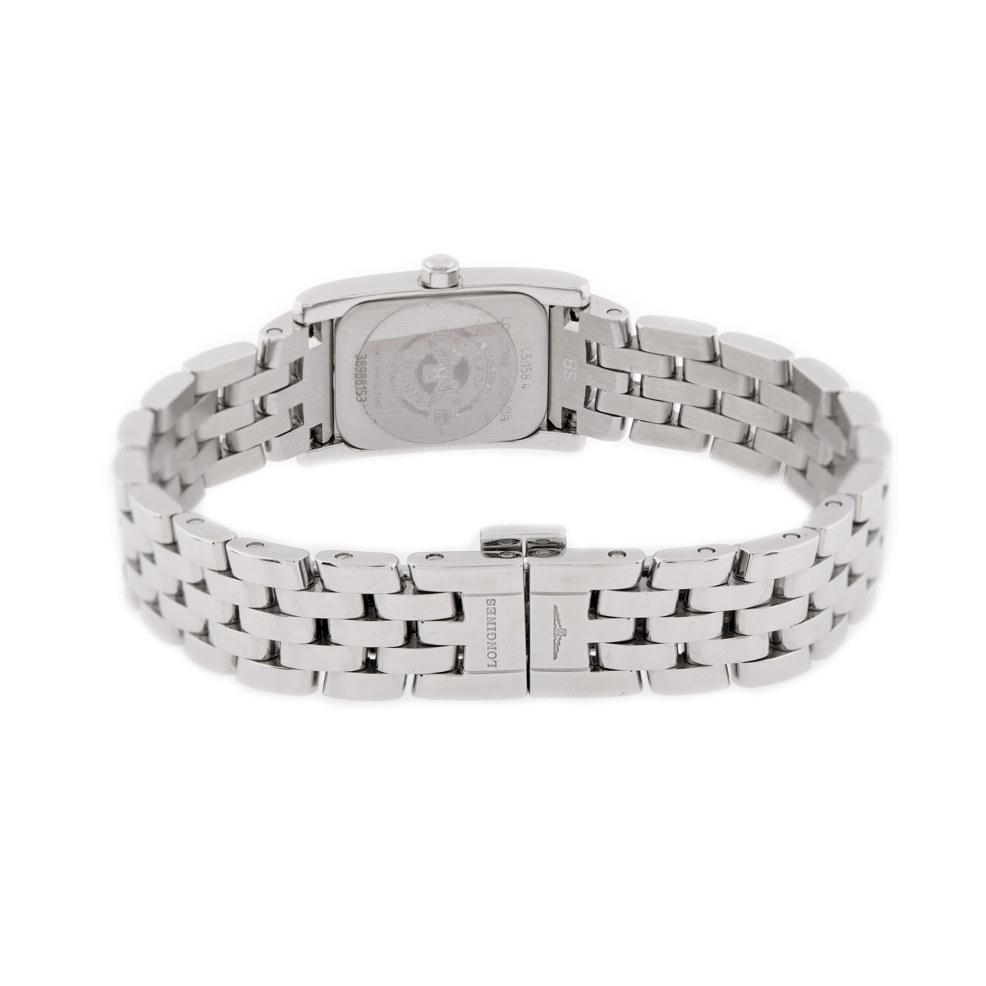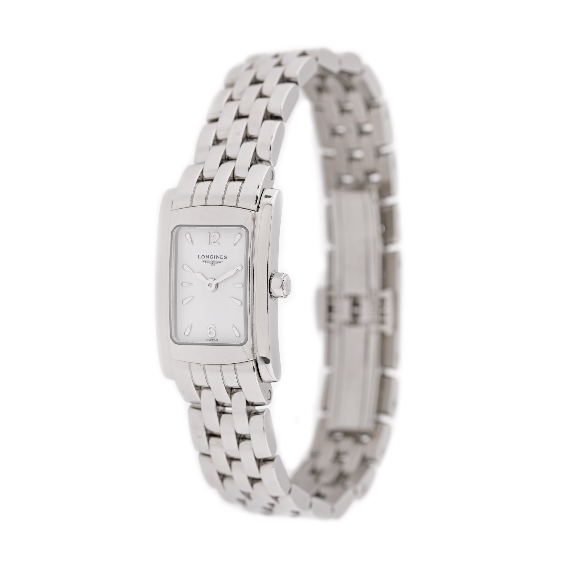 Ceas Longines DolceVita, de mână, de damă, referință L5.158.4, mecanism quartz. Cadran de culoare alb și numerale arabe. Brățară și sistem de închidere tip deployant, originale.