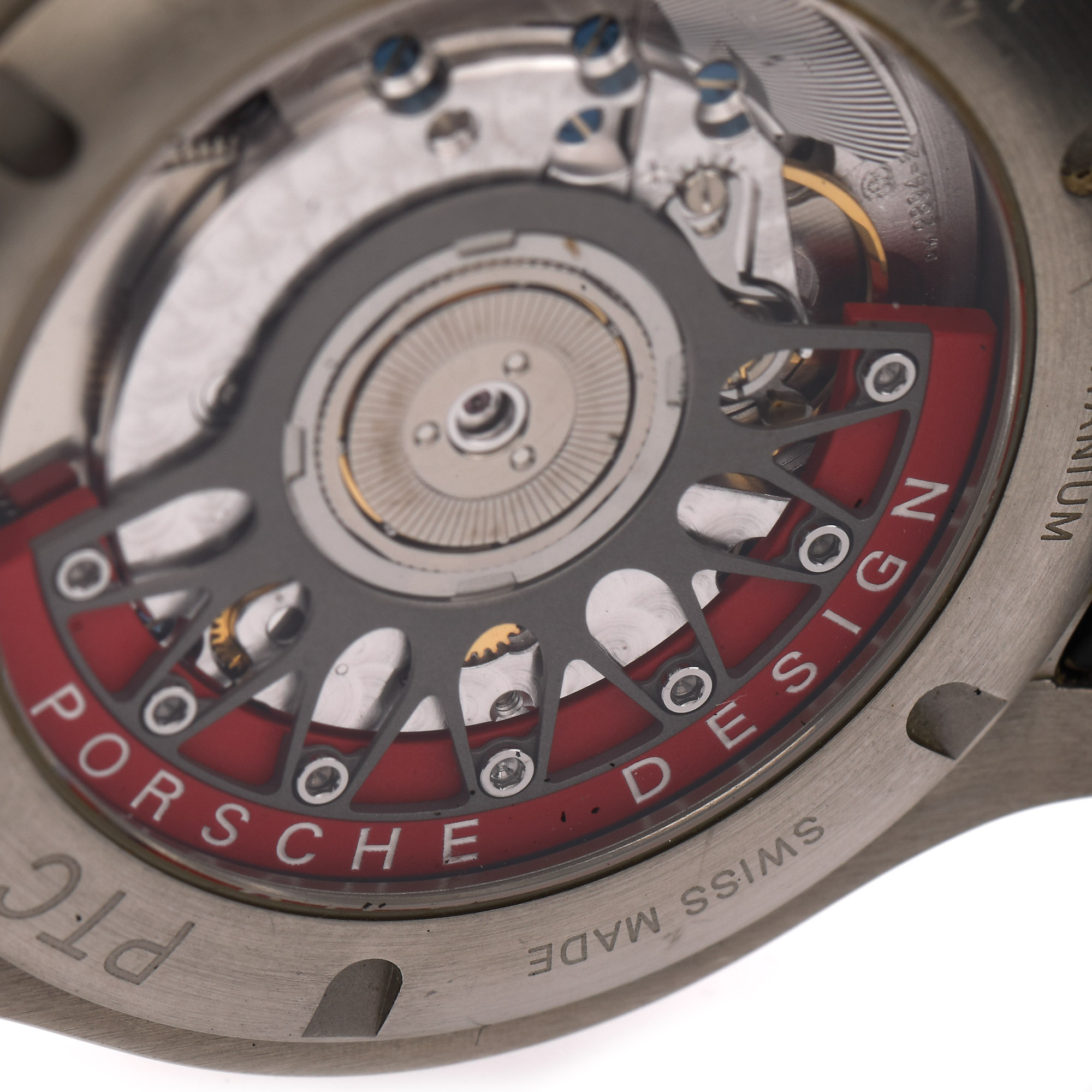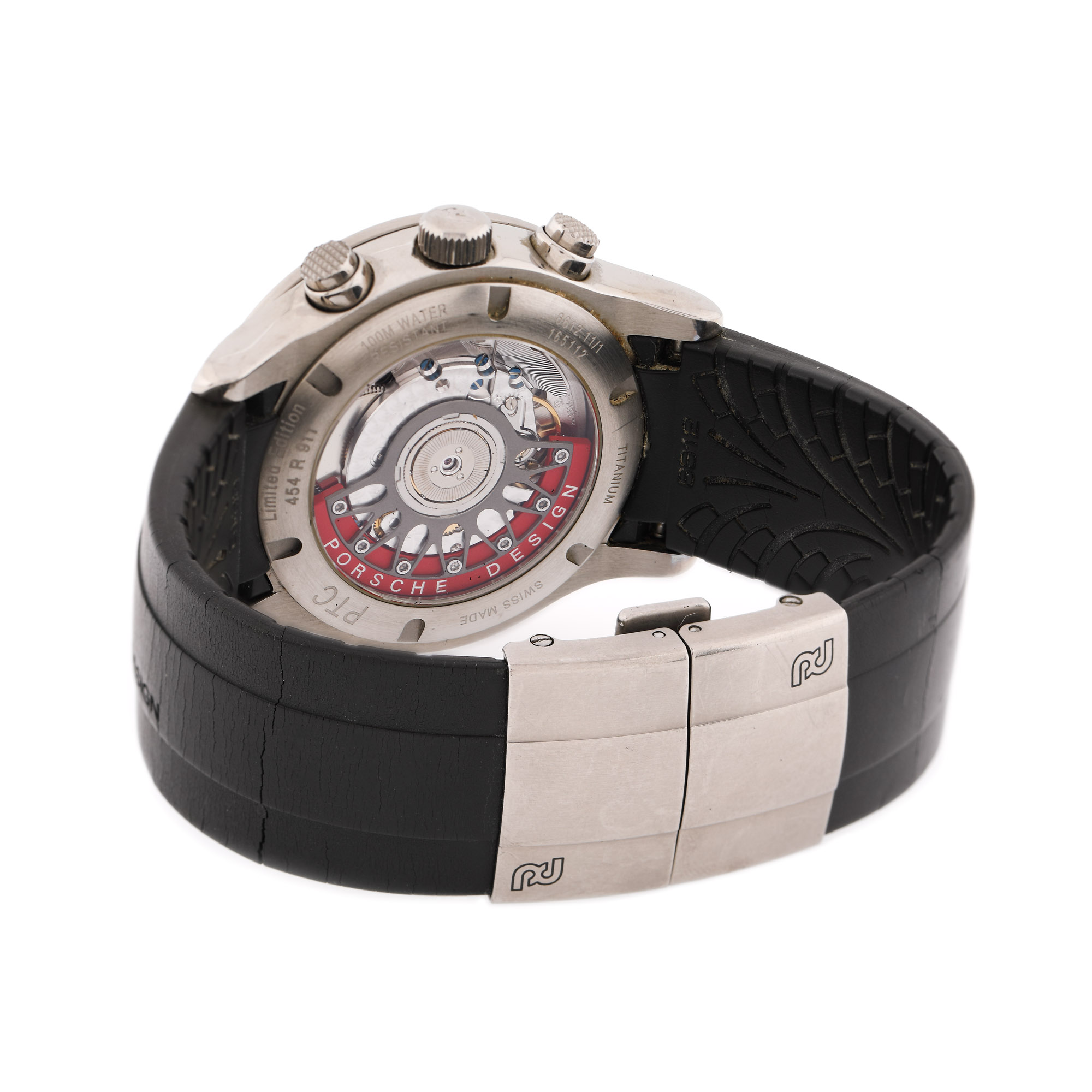 Ceas Porsche Design Chronograph de mână, bărbătesc, ediție limitată, referință P 6612, mecanism automatic, anterior vitrat. Cadran de culoare roșu, indici orari luminescenți, trei registre, scară tahimetrică și registru pentru dată între orele 4 și 5. Curea din silicon, de culoare neagră și sistem de închidere tip deployant, din titan, originale. Accesorii: cutie originală; manual de instrucțiuni, machetă Porsche 911 Carrera.