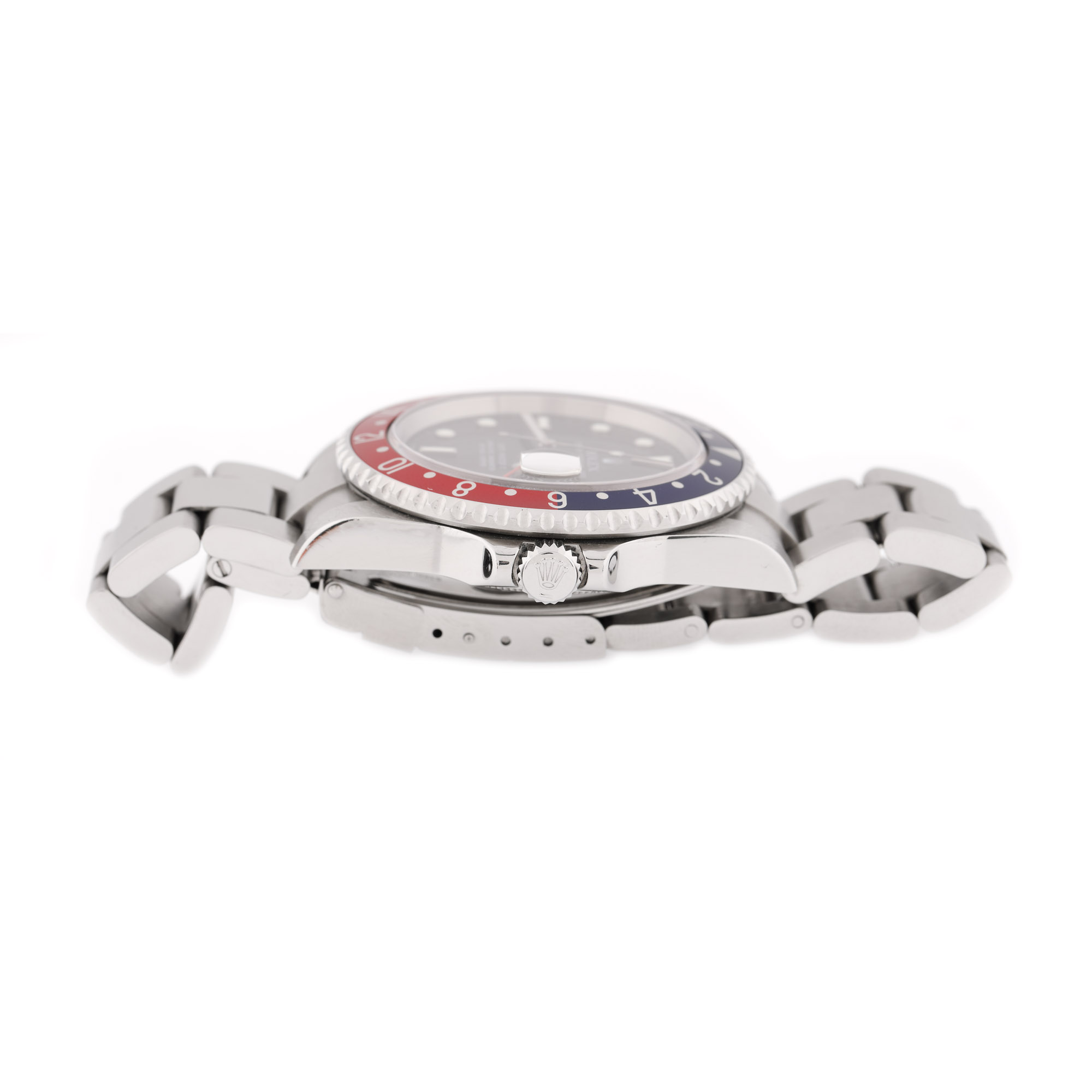 Ceas Rolex Pepsi GMT Master II, de mână, bărbătesc, referință 16700, mecanism automatic, calibru 3175, rezervă de timp 48 h. Cadran de culoare negru, cu indici orari luminescenți și registru cu lupă pentru dată, în dreptul orei 3. Bezel rotativ bidirecțional. Brățară din oțel și sistem de închidere tip deployant, originale. Accesorii: manual de utilizare; act de garanție datat 28/10/2007; o zală suplimentară.