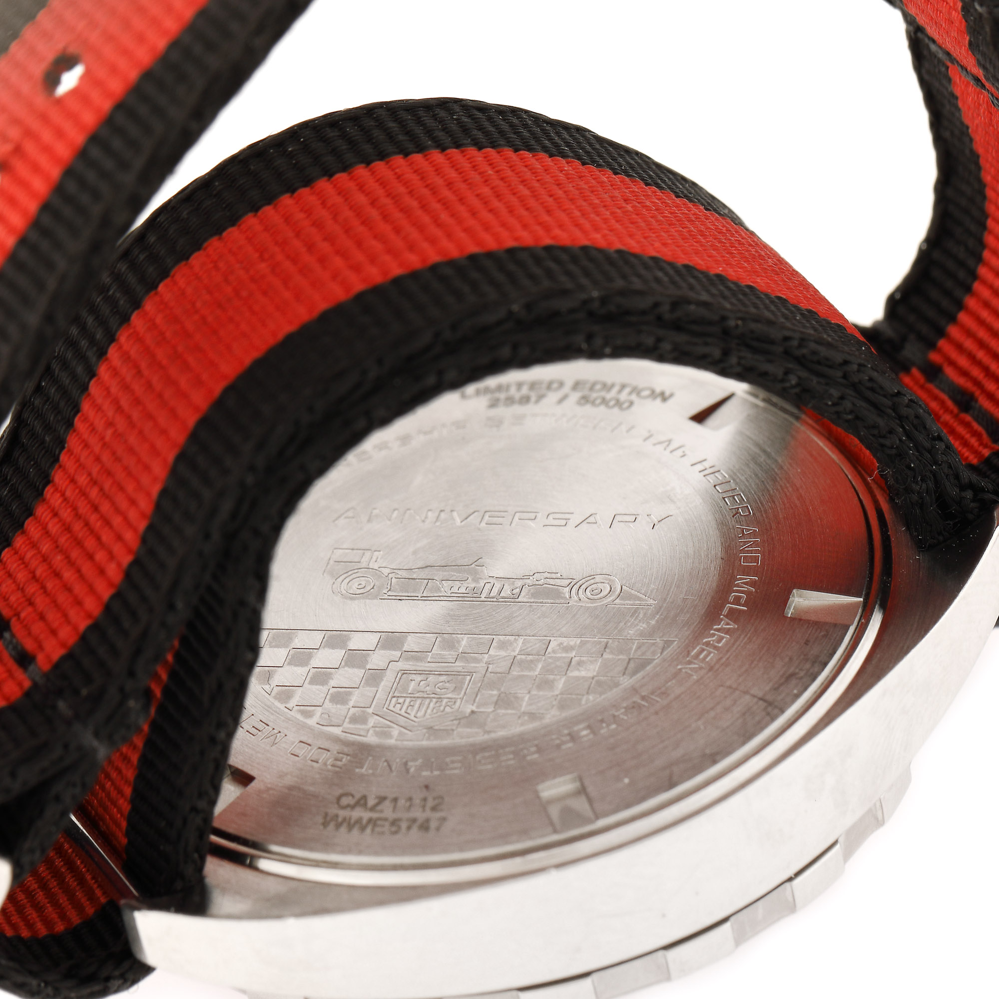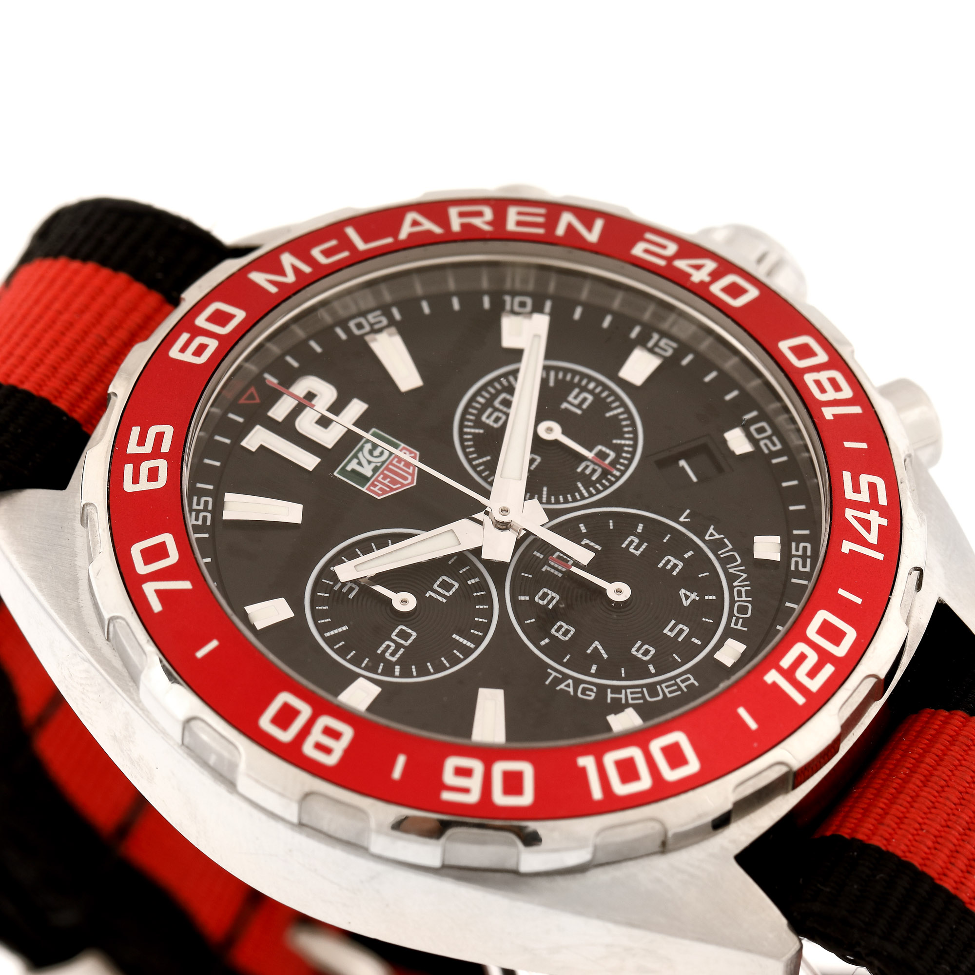 Ceas Tag Heuer Formula 1 McLaren, de mână, bărbătesc, ediție limitată 2587/5000, referință CAZ1112.FC8188, mecanism quartz. calibru 5040D. Cadran de culoare negru, cu numerale arabe și indici orari luminescenți, cronograf tri-compax și scală tahimetrică. Bezel rotativ unidirecțional. Curea NATO din material textil, de culoare negru și roșu, cu cataramă, originale.