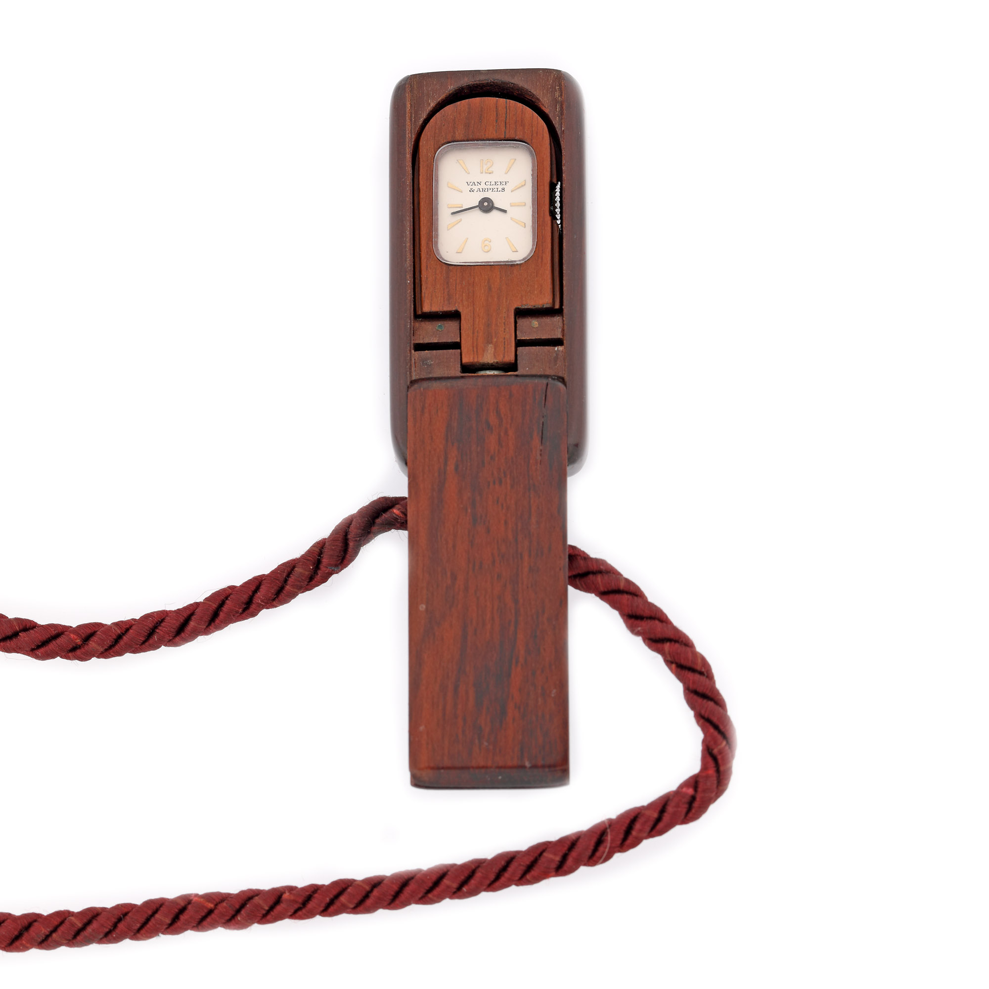 Ceas Van Cleef & Arpels Domino vintage, pentru călătorie, cu șnur, mecanism manual. Carcasă din lemn, cadran de culoare crem și numerale arabe.
