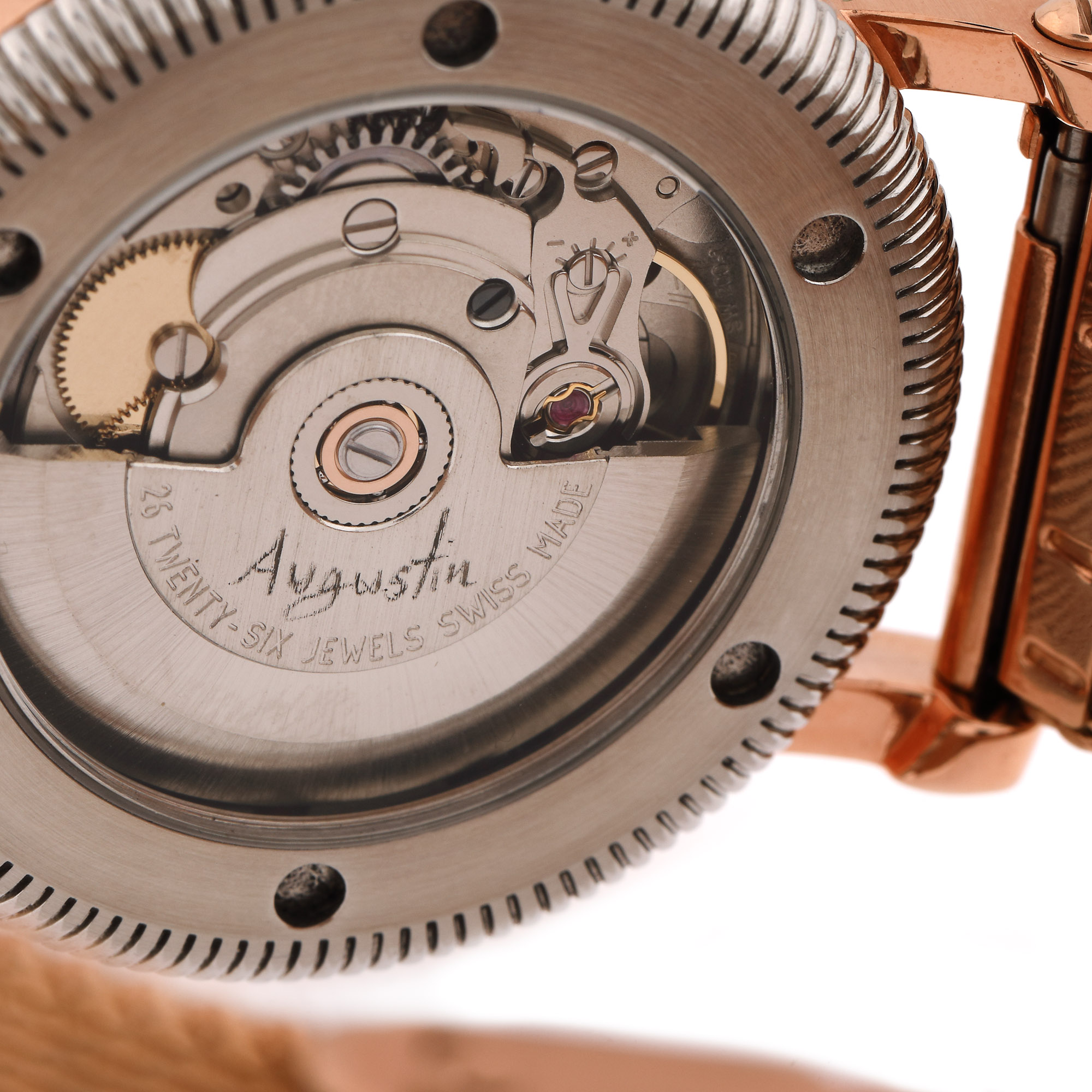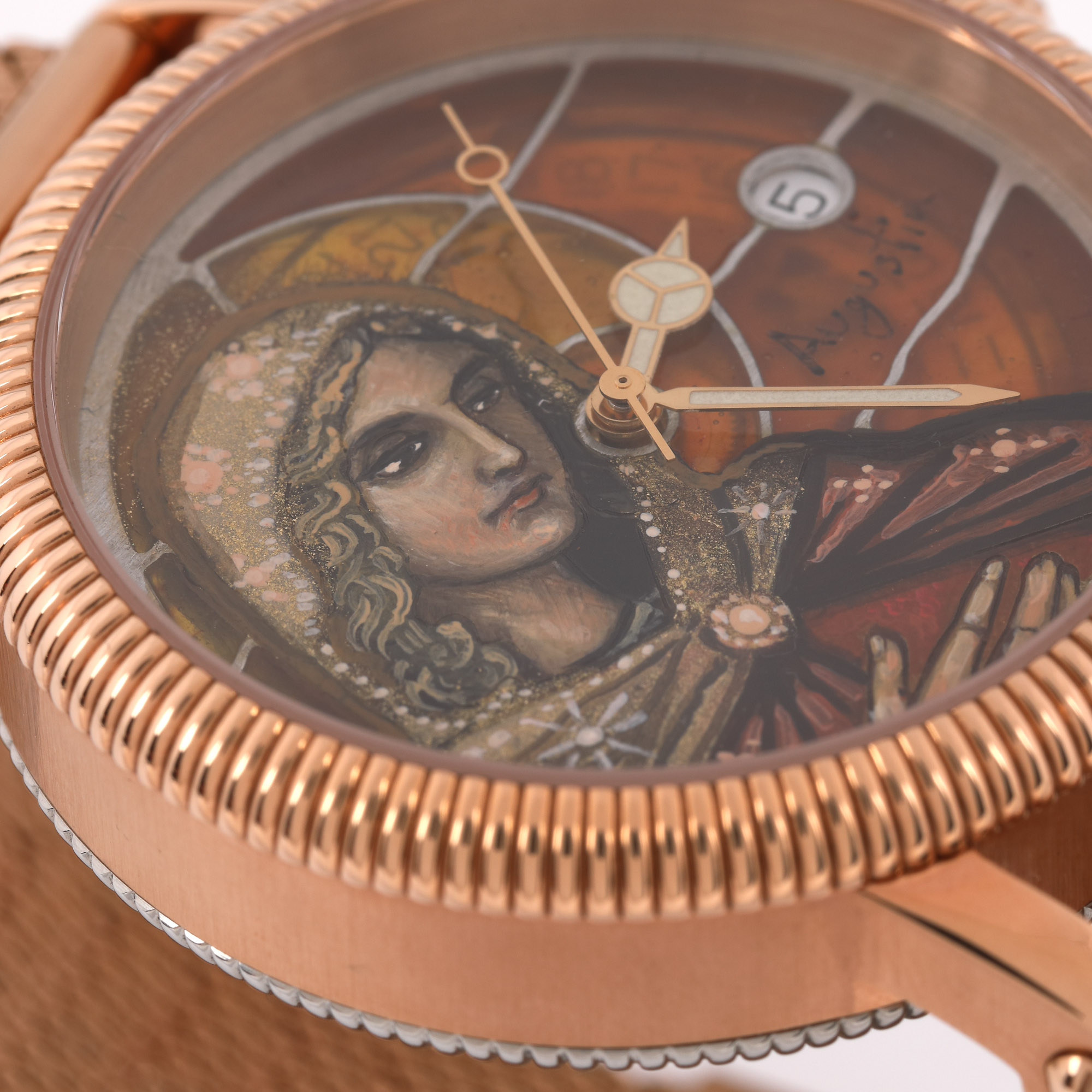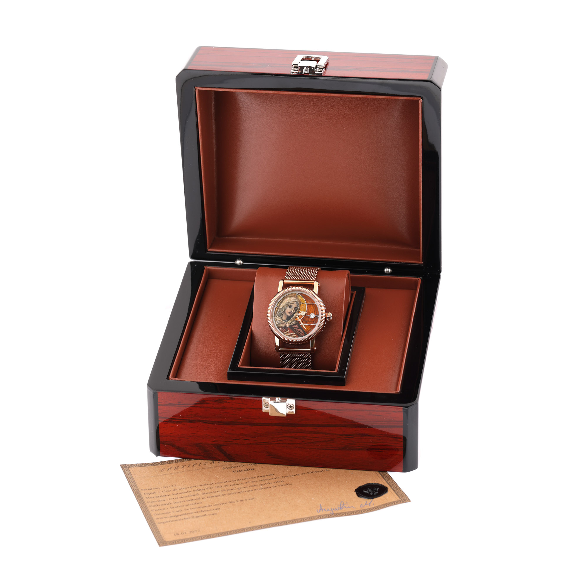 Ceas de mână, de damă, personalizat, executat în Atelierele Augustin. Mecanism cu întoarcere manuală și dată în dreptul orei 3. Cadran lucrat manual, în tehnici de micro-pictură, în sistem de vitraliu. Brățară metalică, aurită roz. Accesorii: cutie originală și certificat de autenticitate semnat de autorul piesei și datat 18.01.2022.