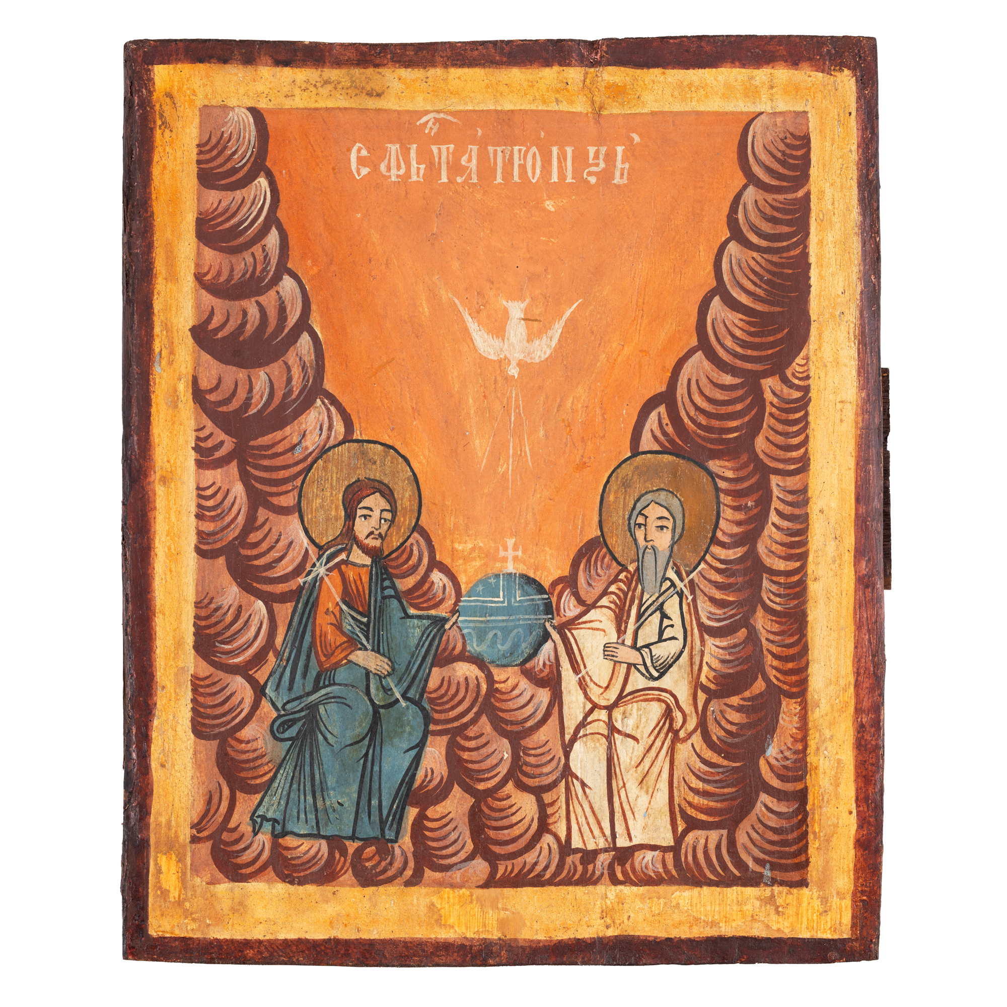 35. Icoană pe lemn, ”Sfânta Treime”, școală românească, sfârșitul sec. XVIII-începutul sec. XIX