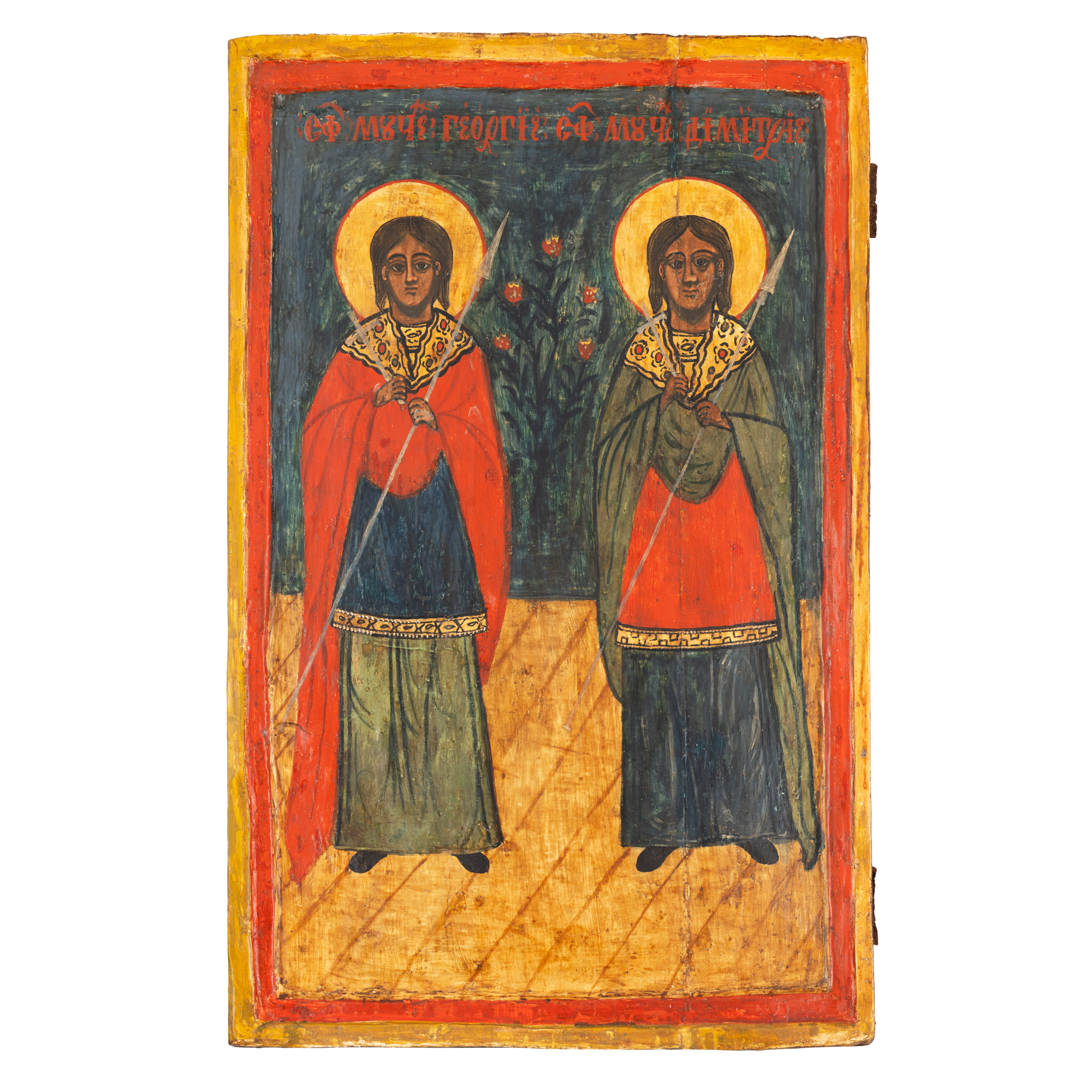 33. Icoană împărătească pe lemn, ”Sfinții Mucenici Gheorghe și Dimitrie”, școală post-brâncovenească, probabil atelier din Banat, sfârșitul sec. XVIII