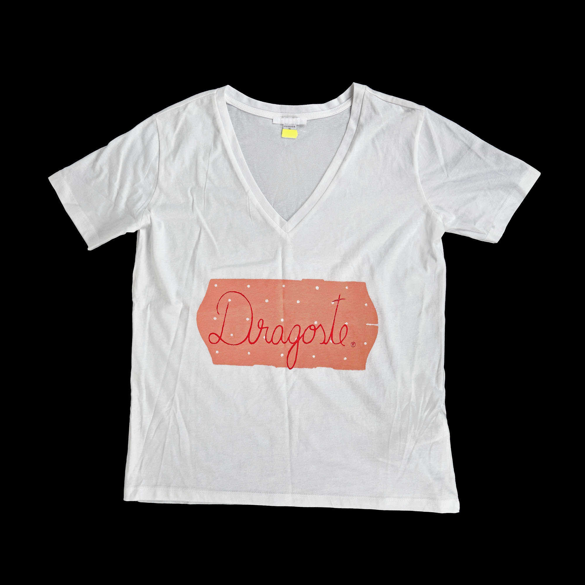 "Era într-o noapte de 4 octombrie 2019 când, după ce am făcut dragoste cu iubita mea, am avut un imbold să mă scol din pat și să scriu cu spray-ul, Dragoste, pe o placă de rigips rezemată de perete, ce se târa de prin 2009, de la construcția atelierului, așteptând să fie desenată. Chiar o chituisem recent cu intenția de a o desena pe iubita mea. Ea adormise între timp și a doua zi când s-a trezit să meargă la lucru m-a pus să-i zic că o Iubesc și să o strâng în brațe fără să bănuiesc ce avea ea în minte de fapt. Mi-a zis mai încolo că testa să vadă dacă mai simte ceva pentru mine și atunci s-a convins că nu. Drept dovadă la câteva ore după, când ne-am întâlnit să luam micul dejun la Petit Paris, mi-a zis că am două săptămâni să-mi treacă de ea, apoi s-a ridicat și a plecat lăsându-mă în urmă nemaiuitându-se înapoi la rugămințile mele. Am rămas doar cu lucrarea, care în timp a căpătat două semnificații. Prima e dată de iubita cu care am făcut ultima oară dragoste și a doua este dată de timpul trecut din 2019 când a fost ultima dată când am făcut Dragoste. Pe 28 februarie, la 4 zile după Dragobete, am expus la Galeria Dragoste primul tricou. Era un tricou pe care am desenat un pansament ca să-mi pansez simbolic rana cauzată de părăsire. Eram la cel mai jos nivel de suferință și apoi a venit pandemia și am fost forțat de carantină să închid galeria în martie și să mă izolez acasă. Ceea ce până la urmă s-a dovedit benefic pentru că am avut timp să-mi ling rănile și să mă recuperez. Și atunci am aflat că Andreea Esca a contractat virusul și mâhnit de ura oamenilor, adepți ai conspirațiilor care nu o credeau și îi reproșau că a luat bani ca să inducă în eroare opinia publică, i-am trimis tricoul cu Dragoste ca să simtă că este iubită și să îi treacă buba de la virus, simbolic. Ea a fost cea care a decis să îl poarte în timpul interviului în prime time de la ora știrilor, poate ca să transmită Dragoste tuturor care manifestă ură și să ne aducă aminte să ne iubim aproapele. Apoi a scris pe rețelele sociale că Dragostea e pansamentul pentru orice. Tricoul a devenit instant faimos și tot restul anului n-am făcut decât tricouri, iar acesta din licitație e ultimul rămas din acea serie și energie a pandemiei."