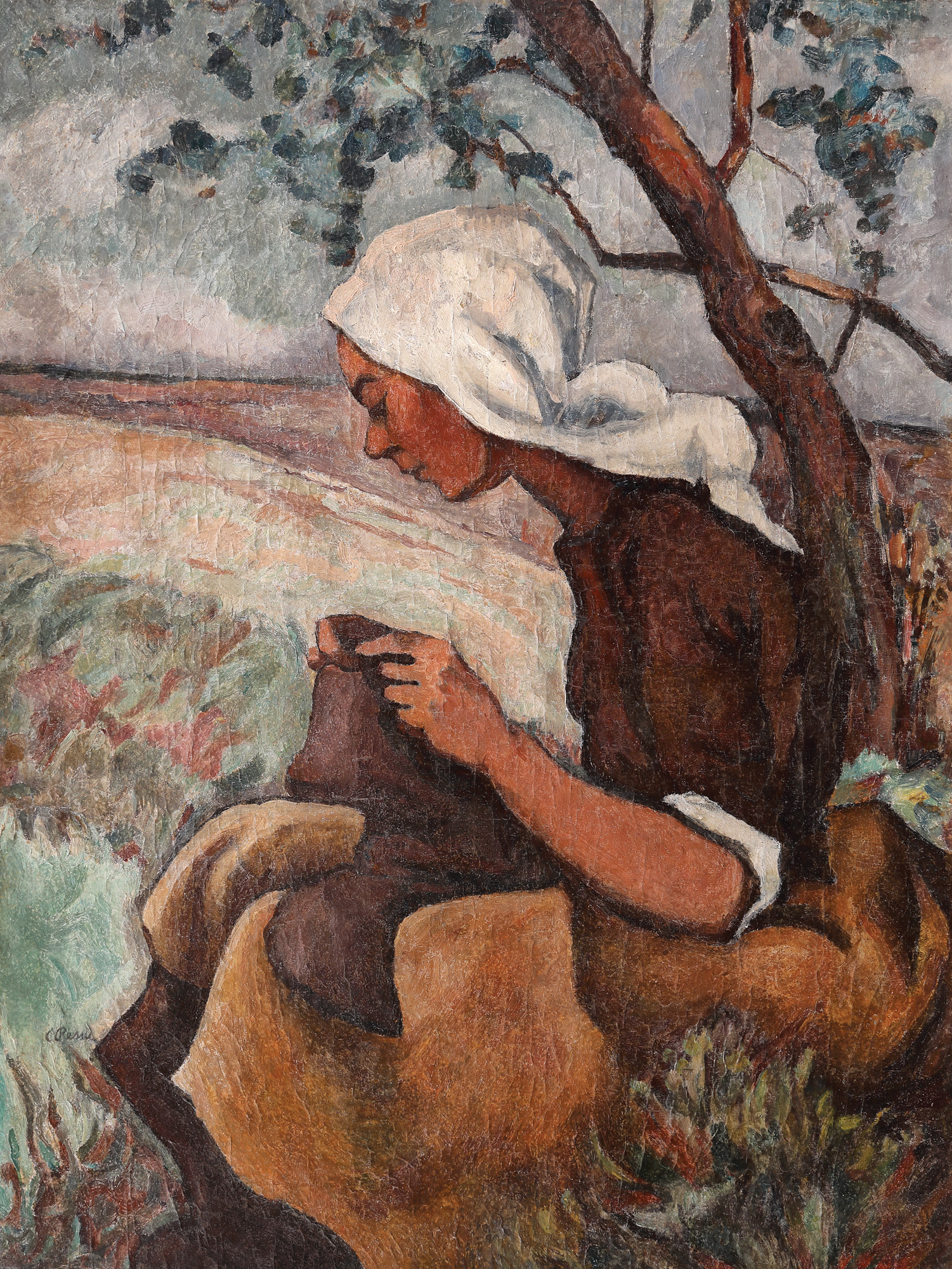 Parisul îi oferă cadrul ideal pentru aprofundarea tehnică a desenului. Sub îndrumarea lui Jean Paul Laurens, învață cum să ofere acuratețe grafică liniei, cum să respecte proporțiile anatomice și își dezvoltă, de asemenea, predilecția către tematicile inspirate din viața la sat. La invitația teoreticianului și colecționarului Alexandru Bogdan-Pitești, petrece câțiva ani în satul Vlaici-Olt, unde va realiza o amplă serie de portrete și scene înfățișând viața rurală. De-a lungul timpului, și-a împărțit existența între viața urbană și experiențele prolifice pe care i le oferea viața la sat. Astfel, a putut utiliza contactul nemijlocit cu țărănimea pentru dezvoltarea unei viziuni profund subiective. În opera lui Ressu, figura umană domină negreșit pânza, fiind așezată mai presus de natură sau orice alt element pe care artistul îl include în creația sa. Depășește preceptele pe care i le insuflă academismul din anii de studiu, perfecționează tehnica și realizează o operă monumentală. Mizează pe expresivitatea figurilor pe care le zugrăvește și oferă personajelor sale trăsături fizice proeminente. După cum putem observa și în lucrarea de față, utilizează forme și proporții consistente în plasarea personajului feminin pe fundalul peisajului de câmpie. Desenul său este ferm, riguros, însă se asociază melodios echilibrului cromatic. Uneori, ipostazele statuare în care artistul își surprinde modelele sunt întrerupte de folosirea liniei care sugerează mișcarea, așa cum se întâmplă și cu Bretona pe care artistul o imortalizează în timp ce coase. Pentru Camil Ressu, portretul a ocupat un rol deosebit în creație. A lucrat inițial în creion, realizând schițe sumare, și a evoluat până la realizarea în detaliu a unor ample portrete în ulei.