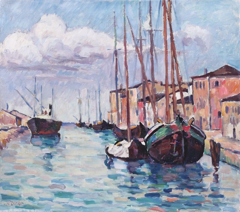 În anul 1908, Nicolae Dărăscu se stabilește într-un mic oraș portuar de pe Coasta de Azur. Atmosfera solară și plenitudinea naturii îl inspiră să creeze o serie de lucrări în care surprinde vasele pescărești, casele mici cu grădini bogate, piețele încărcate sau întinderile nesfârșite de albastru. Dărăscu nu pictează valul și mișcarea acestuia, ci marea liniștită. Marea devine, de asemenea, un simbol al călătoriei. În lucrarea de față, artistul își construiește formele cu exactitate, își așează tușele calculat, însă nu ezită să folosească și suprapuneri. Își desfășoară pânzele într-o paletă restrânsă, utilizând doar câteva culori. Cromatica portului, a corăbiilor și a clădirilor se prelungește în reprezentarea mării, al cărei albastru capătă și accente de roșu, galben sau verde.