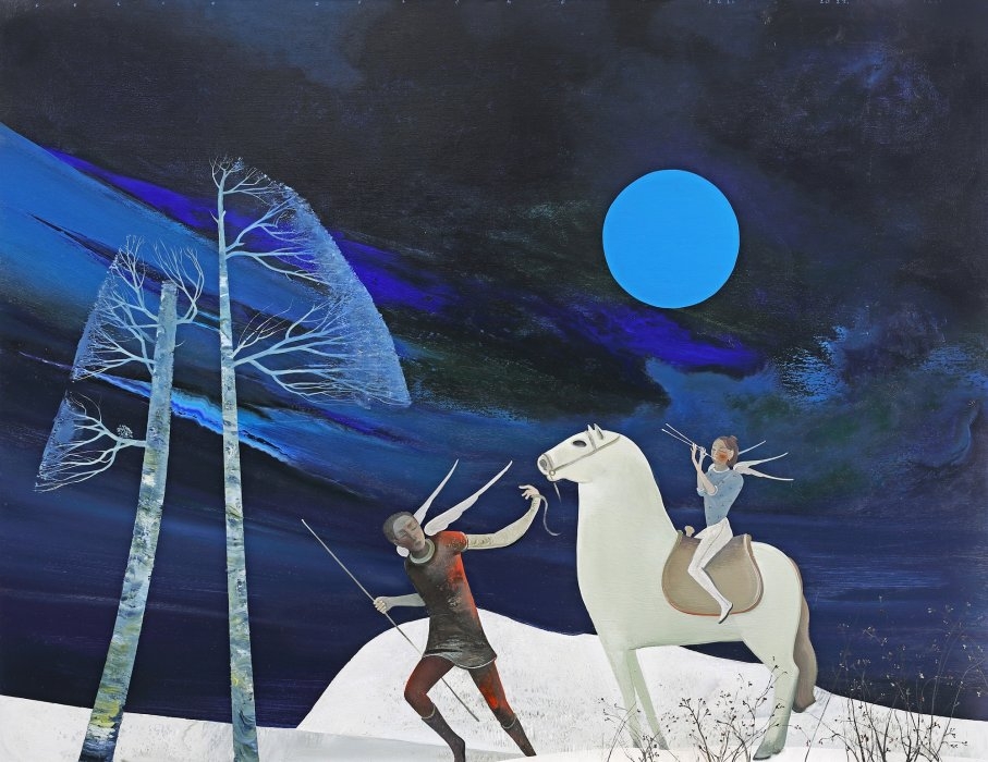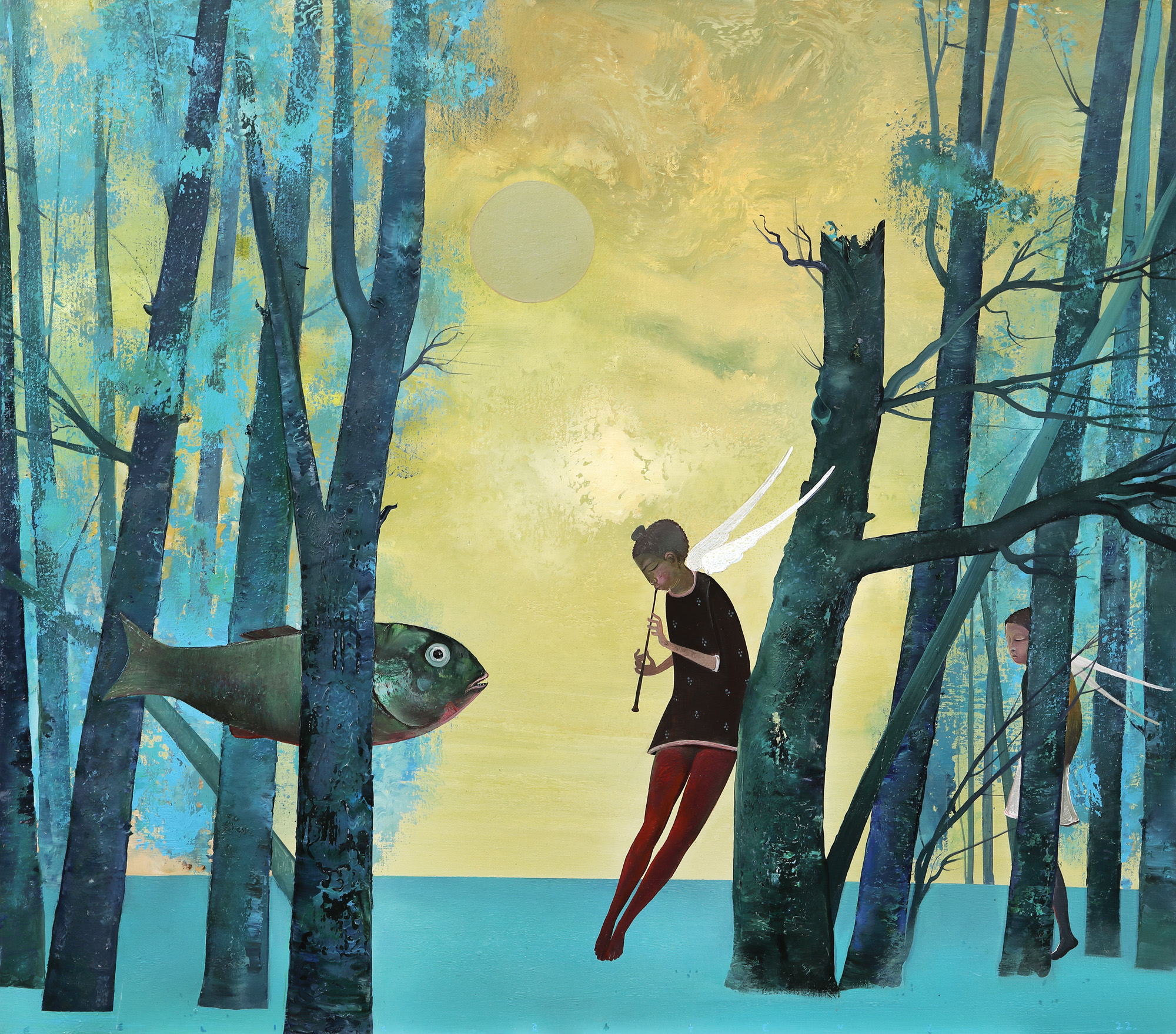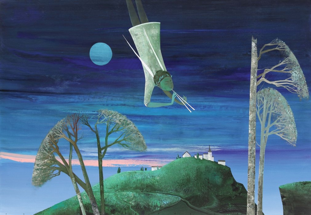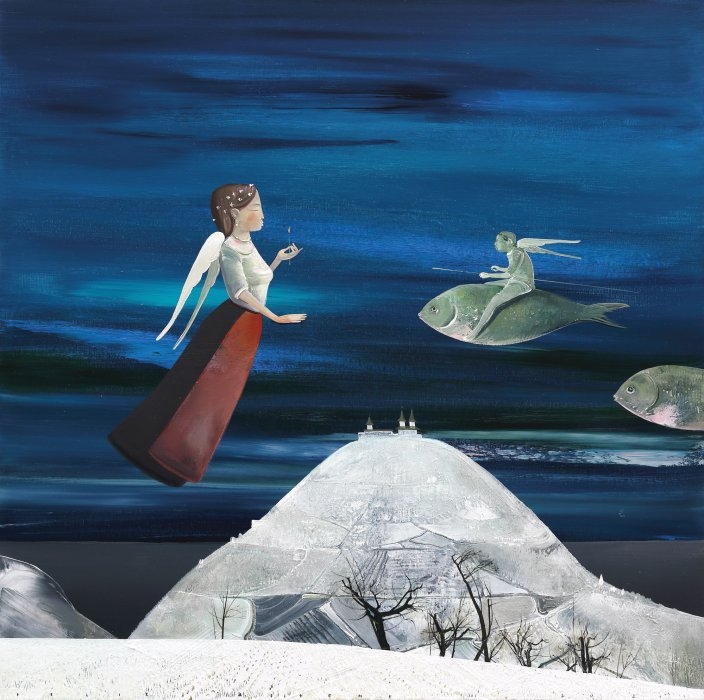 Lucrările lui Felix Aftene descriu o lume hibridă populată de o amplă categorie de personaje alegorice. ”Cartea ființelor imaginare” scrisă de Jorge Luis Borges îl inspiră în conturarea unor caractere arhetipale ce populează adesea subconștientul uman. Artistul răsfoiește prin jurnalul său de inspirație infantilă și așterne, de această dată pictural, pagini întregi de vise sau amintiri. Este un colecționar de simțuri ce pot fi transpuse în artă și un vizionar metafizic ce tinde să încastreze în pânzele sale un univers atemporal. Surprinde mai cu seamă ”valențele spirituale ale omului – omul și muzica, omul și teatrul” și propune o descifrare în cheie mitologică a ființelor postmoderne pe care le ilustrează. Aftene este artistul aflat în permanență în căutarea unor forme și linii noi, respingând astfel clasicismul care doar i-ar oxida pânzele. Reușește o magistrală sondare a abisului și surprinde trupul uman ca templu. Lungește, lărgește sau turtește siluetele protagoniștilor săi și acordă omului un loc primordial în pictura sa. Lucrările lui Aftene sunt îmbogățite adesea și de prezența regnului animal, Pești, păsări sau melci coexistă în perfectă armonie cu figurile umane sau cele serafice. Personajele sale apar ca niște călători care cutreieră neîncetat printr-o existență efemeră. Folosește din abundență nuanțele de albastru. Zona geografică a copilăriei sale revine, astfel, în creația artistică, prin trimiterile la albastrul de Voroneț. Albastrul apare la Aftene printr-o asociere oximoronică dintre zbor și cădere, și prin alăturarea antitetică a energiei și entuziasmului accentelor electrizante cu tușele mai potolite care abundă în calmitate și melancolie. ”Vestitorul” este parte dintr-o serie mai amplă, bogată în semnificații, pe care artistul a dezvoltat-o în timp, studiind complexitatea ființei umane și a simbolurilor arhetipale reprezentate.