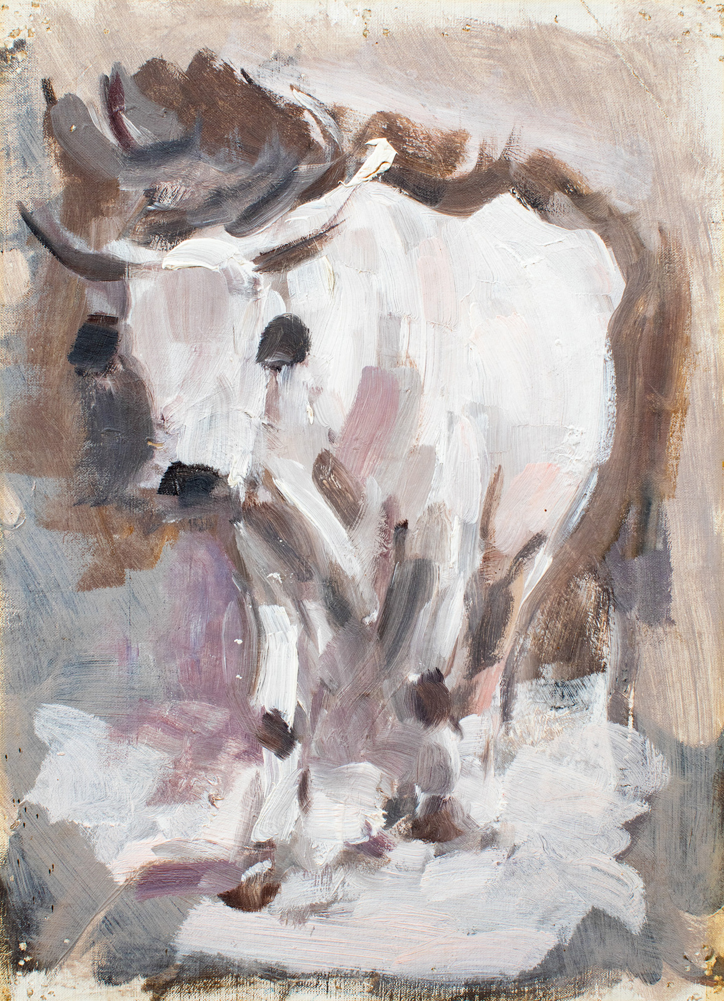 ”Avea, într-o vară, la Câmpina, un bou frumos moldovenesc, îi zicea ”Ghiocel”, și, blând, se desprinsese că venea singur dimineața la pozat, în mijlocul curții [...] și sta așa frumos, parcă știa ce taină mare se petrece-n ceasul acela. Seara, când pictorul se plimba gânditor, cu mâinile la spate, de la un capăt la altul al curții, Ghiocel se ținea după el, cu o atingătoare prietenie pentru omul acela bun și tăcut.”. Astfel îl descrie Alexandru Vlahuță pe Ghiocel, protagonistul operei de față, dar și al mai multor studii și crochiuri realizate de către Nicolae Grigorescu în creion ori cărbune și al numeroaselor eboșe și opere finite în ulei. Artistul preia pictura animalieră drept motiv predilect în opera sa și reiterează motivul de-a lungul mai multor lucrări, însă mai cu seamă în etapa de maturitate. Va săvârși, de-a lungul vieții, un studiu consecvent al reprezentantului din familia bovinelor și îl va include pe tovarășul de muncă și de suferință al omului de la sat în multe dintre lucrările sale. Va cerceta boii cu o răbdare extraordinară și îi va zugrăvi cu o veritabilă simpatie în pânzele sale. Va picta șiruri pitorești nesfârșite, turme întoarse de la câmp, grupuri surprinse în timp ce se aproprie sau în momentul îndepărtării lor din prim-plan. După succesul răsunător al expoziției sale personale de la Paris, de la sala Marinet, Grigorescu revine definitiv în țară în anul 1887. Va locui inițial la București, urmând ca din anul 1891 să se așeze la Câmpina. Aflat în mijlocul naturii și al oamenilor, încojurat de bogăția vegetației și de numeroasele viețuitoare de la țară, artistul va transcrie peisaje, chipuri și siluete de țărani, dar și portrete ale boilor, reprezentanți ai muncii, blânzi, cu o deosebită putere de a îndura. Așa cum amintește Alexandru Vlahuță în volumul pe care i-l dedică pictorului, peisajul apare, în opera lui Grigorescu, drept ” o fereastră deschisă larg în lumina de afară”. De la Barbizon și până la Câmpina, preocuparea principală a artistului român va gravita în jurul naturii. Valea Prahovei se va dovedi a fi prolifică în economia creației lui Grigorescu, oferindu-i numeroase motive picturale. Animalul domestic din imediata apropiere a gospodăriilor țărănești va căpăta statutul de latimotiv al operei și va întruchipa, de-a lungul secolelor, acel ”specific național” despre care se vorbește atunci când este evocată personalitatea lui Grigorescu. Interesat de anatomia viețuitoarelor, va întreprinde un amănunțit studiu al mușchilor și al oaselor, un joc al încordării și al relaxării ce vor avea drept rezultat o panoplie de lucrări închinate motivului. În opera artistului, boii se bucură de o mare libertate de exprimare. Regăsim adesea boii care se plimbă domol, boii desjugați ori boii care nu trag la deal – dovadă clară a grijei și atenției față de animal. Reprezentativ pentru pictura în plein-air, Ghiocel transpare în opera de față într-o redare cvasi sintetizată într-un studiu în care întrezărim în mod cert răsfrângerile solare. Predomină nuanțele de alb, cărora pictorul le împrumută din tonurile cenușii ori brune ale umbrelor și marcării detaliilor. Protagonistul este surprins în mișcare, pășind către un topos incert, situat în afara limitelor pânzei. Răpus de pneumonie în anul 1907, va fi condus către locul odihnei sale veșnice exact așa cum a descris el obiceiul în picturile sale – ”într-un car cu patru boi” (după cum notează N. Petrașcu în albumul dedicat lui Grigorescu).