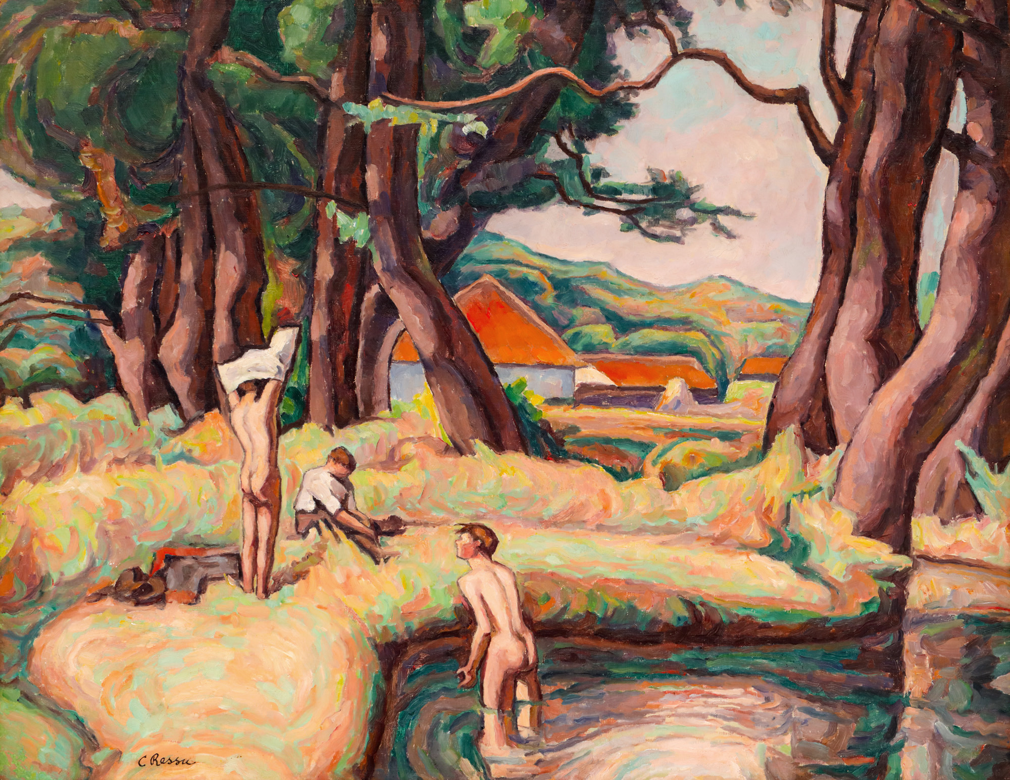 Una dintre influențele majore asupra operei sale o va constitui întâlnirea cu micul sat din județul Olt în care va reveni adesea. La Vlaici va ajunge la începutul secolului trecut, la invitația colecționarului Alexandru Bogdan-Pitești. Inițial, efectuează studii și desene pe care le va transpune, mai apoi, în ulei pe pânză. Depășește preceptele academismului dobândite în cele câteva luni petrecute la München și își construiește propria semantică plastică, elocventă și bine închegată. Revine constant la Vlaici, astfel că existența sa va fi împărțită, de-a lungul vremii, între uniformitatea vieții urbane și experiențele prolifice pe care i le oferă traiul la sat. Va utiliza contactul nemijlocit cu țărănimea pentru dezvoltarea unei viziuni profund subiective. Artistul insistă să pătrundă mai adânc în psihologia personajelor reprezentate, astfel că el va isca discuții și va insista să își cunoască modelele. Identifică, în acest fel, adevăratele aspecte ale traiului rural, pe care le va transpune și în lucrările în care nu se mai axează pe conturarea personajelor. Artistul își organizează compozițiile pe orizontală și realizează veritabile fresce ale satelor din Olt, Moldova, Vrancea sau Ardeal. Compune echilibrat și păstrează proporțiile reale; își construiește desenul cu minuțiozitate și supune acestuia culoarea. Utilizează un ritm preponderent liniar și o cromatică luminoasă în încercarea de a sublinia elementele predominante din lucrările sale. Operele artistului exemplifică viața, munca și obiceiurile lumii rustice, însă ne dezvăluie, uneori, și momentele de răgaz. În peisaje, Camil Ressu se va concentra cu precădere asupra naturii pitorești, schițând contururi sinuoase de arbori și dealuri, dar va reda și frumusețea caselor rurale cu pereți albi și acoperișuri colorate. Realismul lapidar pe care și-l asumă Ressu ni se relevă cu precădere în tonurile reci scăldate în lumina soarelui, în suprafețele largi de lumini și umbre și în redarea veridică a volumelor și a ritmurilor. Dacă în majoritatea operelor care alcătuiesc acest ciclu tematic predomină scenele de lucru sau frescele rurale în care accentul alunecă asupra naturii; de această dată avem de-a face cu o scenă ludică, de relaxare, în care un grup de ștrengari este surprins într-o zi toridă la scăldat. Compoziția dinamică surprinde graba și nerăbdarea protagoniștilor înaintea întâlnirii cu apa. Sub auspiciul zilei caniculare cu soare toropitor, cei trei băieți vor renunța complet la veșmintele care le-ncarcă inutil trupurile și se vor avânta fulgerător către oaza menită să-i răcorească. Cel dintâi băiat ajuns în apă pare să-i îndemne pe tovarășii săi să se aventureze mai vioi alături de el. Blocate în mânecile bluzelor ori în șireturile pantofilor, personajele rămase pe mal își croiesc planul de atac și încep să-l pună în aplicare în ritmul propriu. Întreaga compoziție devine revelatorie pentru zilele lungi de vară, în care activitățile năstrușnice iau locul muncii zilnice și dau frâu liber imaginației copiilor.