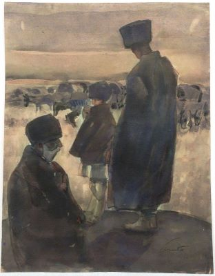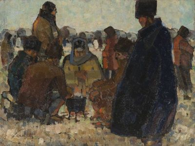 Debutul artistic al lui Francisc Șirato este profund legat de arta grafică. În primele decenii ale secolului trecut, artistul colaborează cu gazetele vremii și realizează desene satirice. Îi va cunoaște, astfel, pe Iosif Iser și Ary Murnu, pe ale căror concepții despre artă și viață le împărtășește și el. În 1916, pe fondul conflictului izbucnit deja de doi ani la nivel mondial, publicațiile în cadrul cărora își desfășoară activitatea Francisc Șirato sunt nevoite să își înceteze apariția. Artistul va ajunge acum în postura de supraveghetor al lucrărilor de reparație de la Grajdurile Comunale, fapt ce va sta la baza contactului său dur și direct cu noua realitate - aceea a războiului - realitate pe care o va transpune sugestiv în schițe și desene. Șirato va dedica un ciclu întreg acestui motiv pe care îl va intitula ”Refugiul satelor”. Sub pecetea acestei tematici a luat naștere și opera de față, în primul an al participării României la război. O lucrare asemănătoare, intitulată ”Popas”, realizată însă în ulei, se află în colecția Muzeului Național de Artă al României. Toate operele care au fost create sub egida acestui motiv în care artistul descrie refugiul sătenilor din Oltenia și Muntenia către zona Moldovei, prezintă convoaiele de care, muncitori, îngrijitoare, dar și scenele de popas încărcate de neliniște, așa cum observăm și în opera de față. Cu privirile ațintitite în jos, încărcate de griji și deznădejde, personajele lui Șirato se îngrijesc de ceaunul proptit pe pirostrii și își încălzesc trupurile brăzdate de frig la căldura focului. În depărtare distingem o panoramă a carelor cu boi, oprite pentru o clipă de răgaz. Siluetele monumentale, încremenite în pecetea timpului sunt marcate prin petele ample de laviu și tonurile reci, gri-albăstrui sau galben-ocru. Paleta sobră susține contrastul formelor, care par a fi dispuse în funcție de luminozitatea spațiului. Observator pasiv, artistul abordează dintr-o dublă perspectivă: socială și psihologică, atât personajul izolat, cât și grupurile mai mari de oameni. Anul 1921, anul primei expoziții personale a lui Francisc Șirato, a adus laolaltă pe simeze o serie de acuarele și uleiuri care surprind tumultul zilelor disperate de război. Este foarte probabil, așadar, ca lucrarea de față, realizată în anul 1916, să fi fost părtașă expoziției menționate anterior.