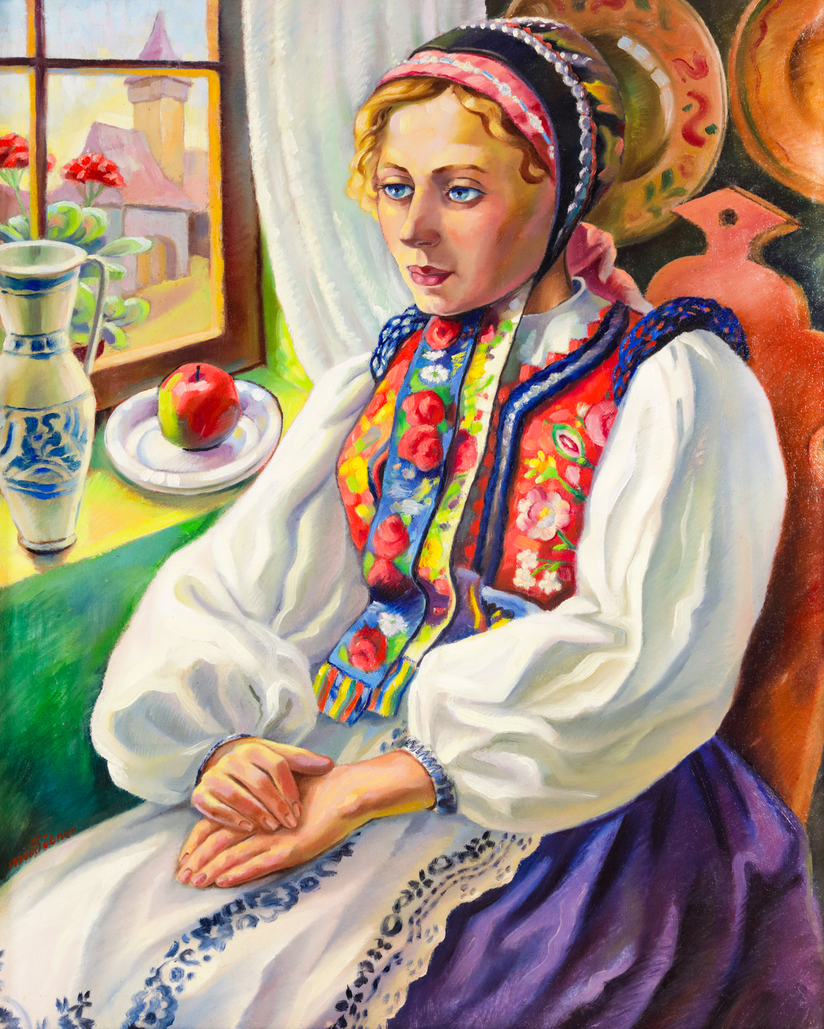 Se naște la Sighișoara, în anul 1902, ca fiu al lui Richard Hübner – funcționar financiar, și al Rosei Honigberger – profesoară de muzică. Filiera vocațională va fi pregnantă cu precădere pe filieră maternă, astfel că mătușile sale, Selma și Helene, vor activa tot în domeniul muzical; în timp ce unchii Ernst și Emil Honigberger vor fi, de asemenea, docți în domeniul muzicii și al picturii. În anul 1906, Carol Hübner se stabilește la Brașov alături de familia sa, așadar în epicentrul vieții culturale germane de la început de secol XX. Începe să prezinte primele sale înclinații artistice în gimnaziu, încurajat fiind de profesorul său de desen. În anul 1926 va merge la Berlin, la invitația mătușii Selma. Ajunge în Germania în plin avânt al expresionismului și al Noii Obiectivități. La întoarcerea sa în România, își va continua studiile la București, acolo unde, cu ajutorul unei burse, al activității de pictor decorator și al celei de ilustrator, va reuși să își regleze situația financiară. Inspirat de realitatea cotidiană, Hübner își construiește opera din portrete, peisaje sau naturi statice cu flori. Se va întoarce la Brașov în anul 1932, urmând ca în 1933 să deschidă aici prima sa expoziție personală. Ecourile demersului său se vor face resimțite prin cronici elogioase în publicații precum Kronstadter Zeitung. Opera de față se desprinde din ciclul portretelor etnografice, vizbil stilizate, cu un ușor caracter geometrizant. Portul tradițional, puternic element identitar, e utilizat de către artist drept artificiu prin care ne sunt oferite detalii cu privire la personalitatea și statutul social al protagonistei. De sorginte săsească, aceasta se remarcă prin somptuozitatea veșmintelor, prin bogăția de broderii, accesorii și podoabe. Cu o cromatică intensă, foarte bine croit, costumul ne indică vârsta tânără a fetei, prin cununa de panglici colorate și mărgele albe atașată accesoriului de pe cap. Protagonista lui Hübner poartă o cămașă albă cu mâneci largi, decorată cu câteva inserții de albastru. Fusta lungă împrumută din nuanțele de albastru ale cămășii, iar șorțul alb, care respectă aceleași detalii cromatice, întregește armonios ținuta. Pieptarul cambrat propune un model floral bogat, cu broderii lucrate manual. Așezată pe un scaun din lemn, în care sunt sculptate motive tradiționale, tânăra cufundată în gânduri devine reprezentantativă pentru efectul de distanțare propus de noul realism. Remarcăm de asemenea vasele tradiționale agățate pe perete, dar și ulciorul din ceramică, decorat cu motive tradiționale, în aceleași nuanțe de albastru. Cu o prezență recurentă în opera artistului, fereastra capătă statutul de laitmotiv al creației și ne oferă o vedere asupra orașului, de cele mai multe ori lăsându-ne să observăm lăcașe de cult și cerul la asfințit. Într-o altă lucrare care datează tot din anul 1936, regăsim același port: cămașa cu mâneci largi, strânse la încheieturi, pieptarul cu detalii ieșite în relief în dreptul umerilor, brâul negru, fusta lungă și șorțul cu model, accesoriul de pe cap, decorat cu mărgele și legat cu panglici lungi, cu motive florale. Hübner își studiază îndelung modelele, reușind să surprindă, dincolo de detaliile vestimentare ori decorative și străfundurile psihologice ale modelelor sale.