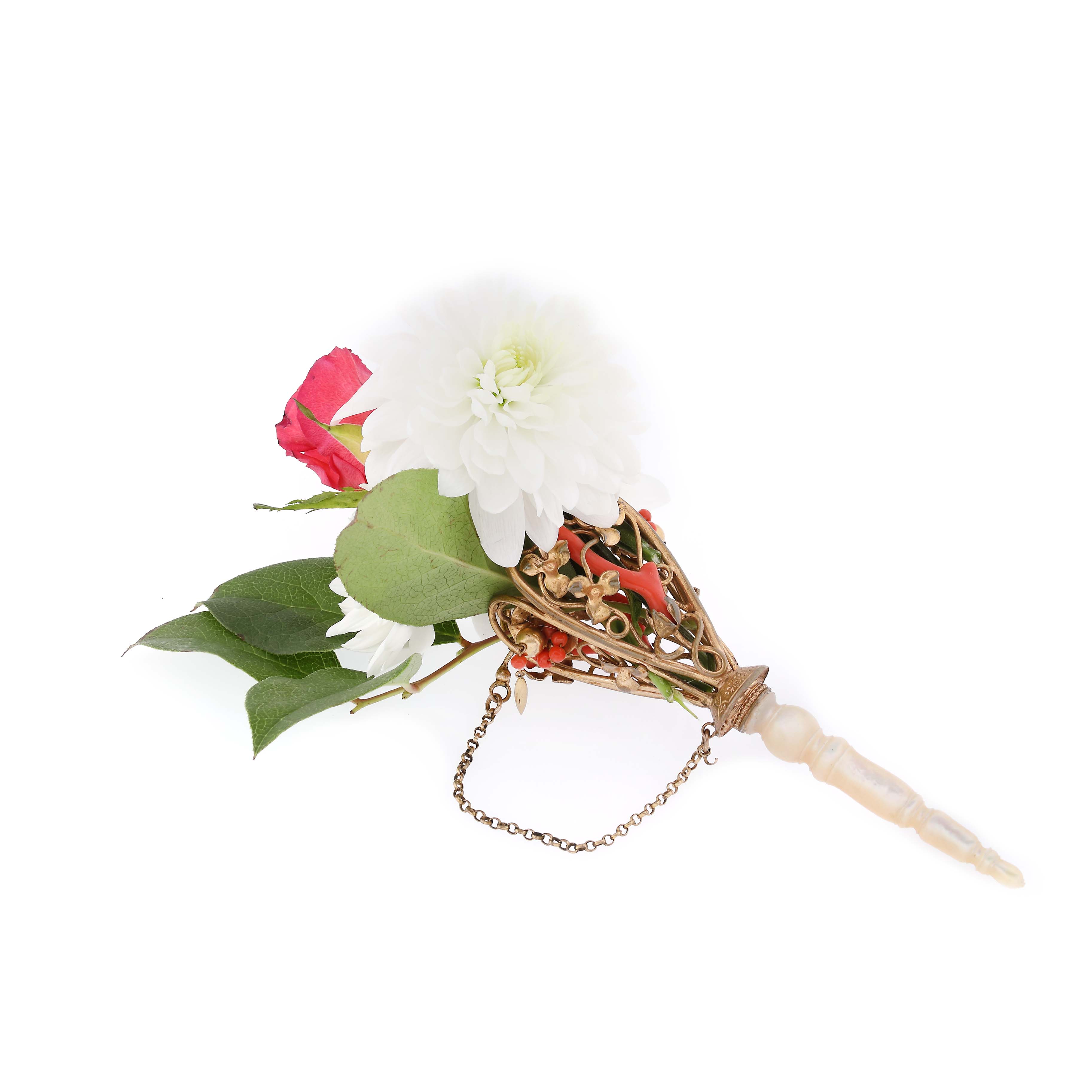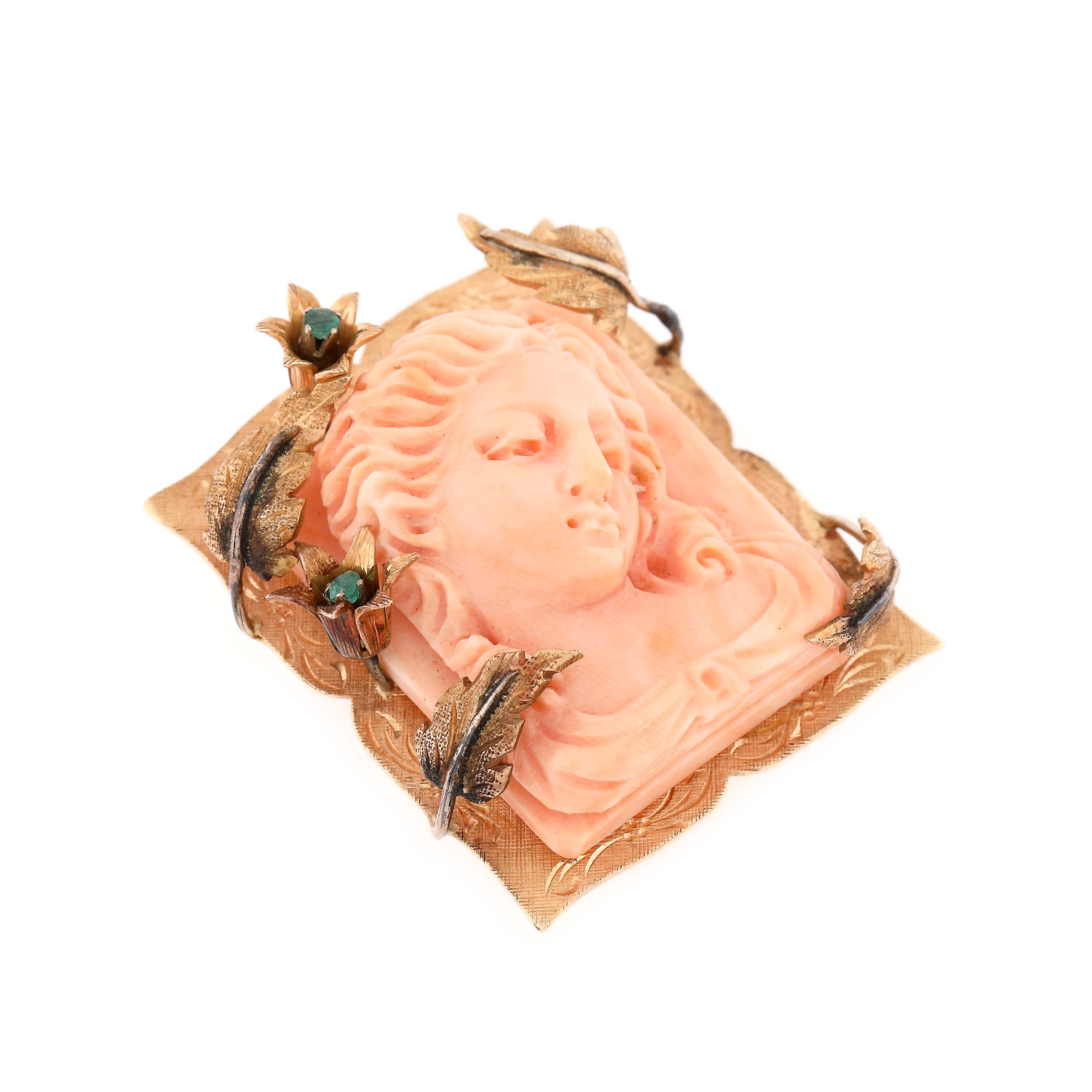 12. Broșă din aur, decorată cu coral sculptat cu profil de femeie și două smaralde