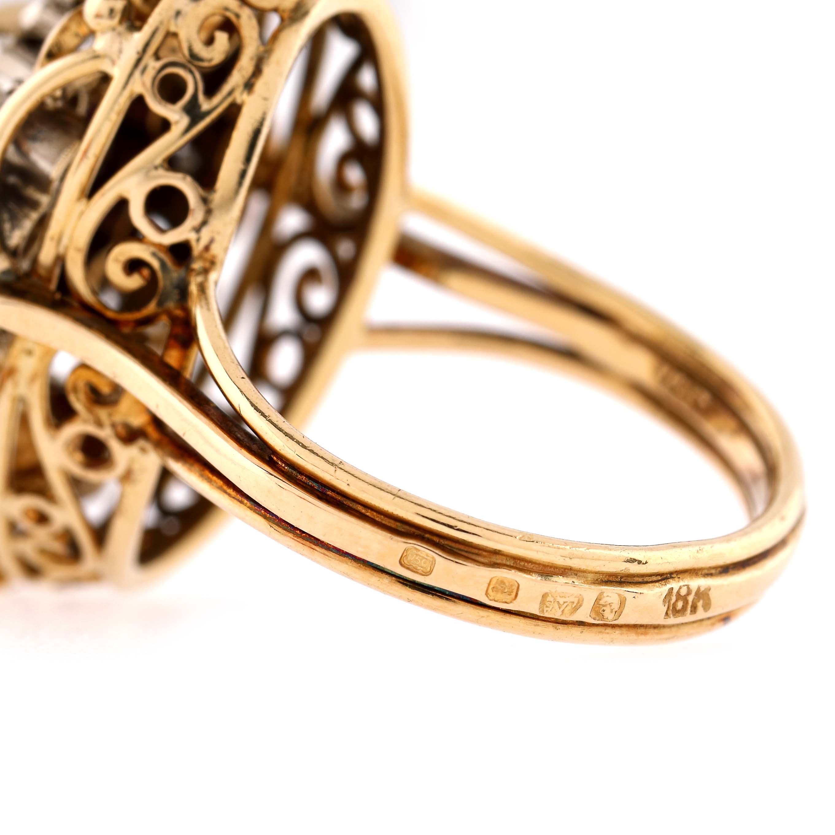 1 ametist oval fațetat, culoare violet, claritate eye-clean, cca. 1 ct., 2 rubine rotund fațetate, culoare roșu, claritate moderately included, cca. 0,15 ct. și 32 diamante rose cut, culoare G-I, claritate VS-I1, cca. 0,13 ct.