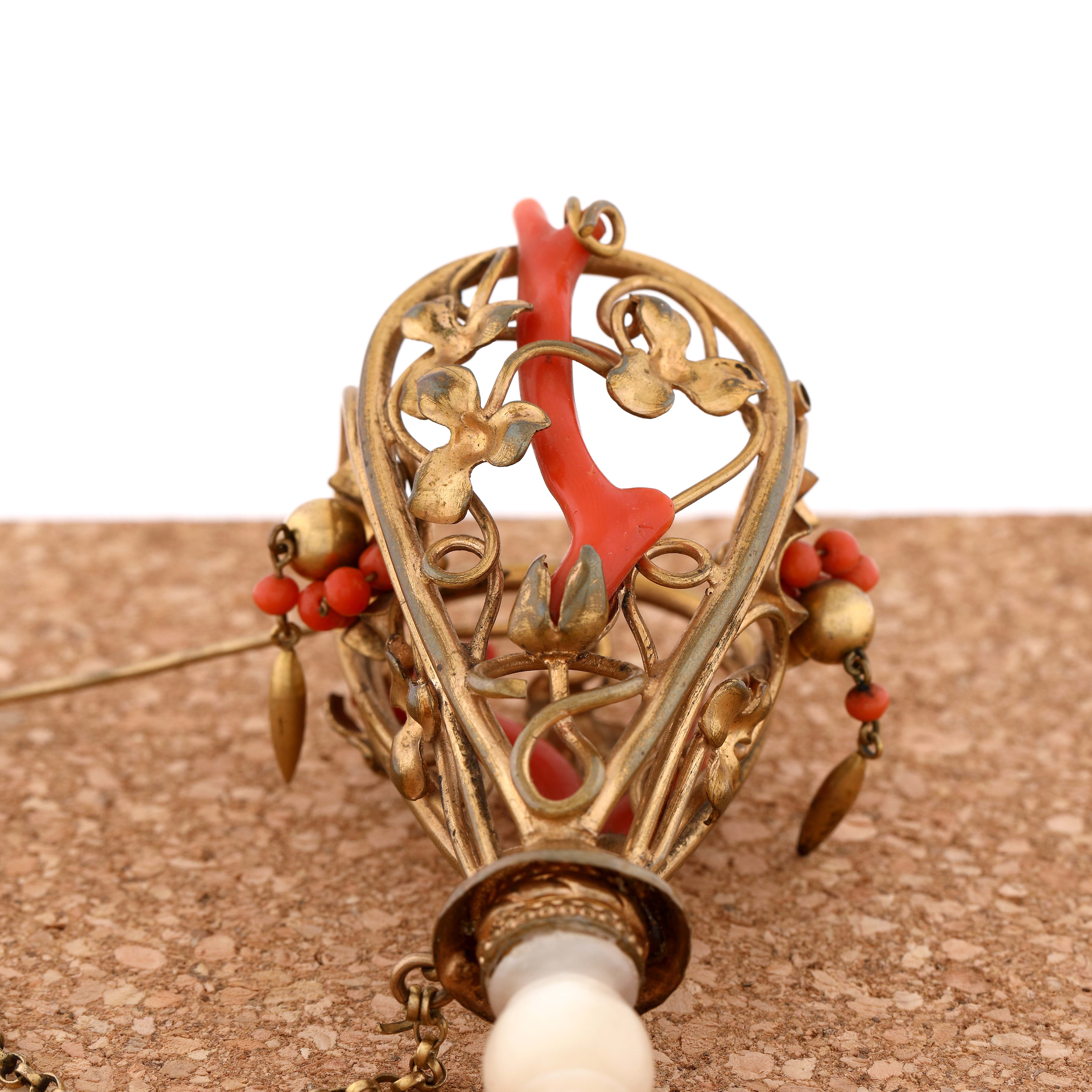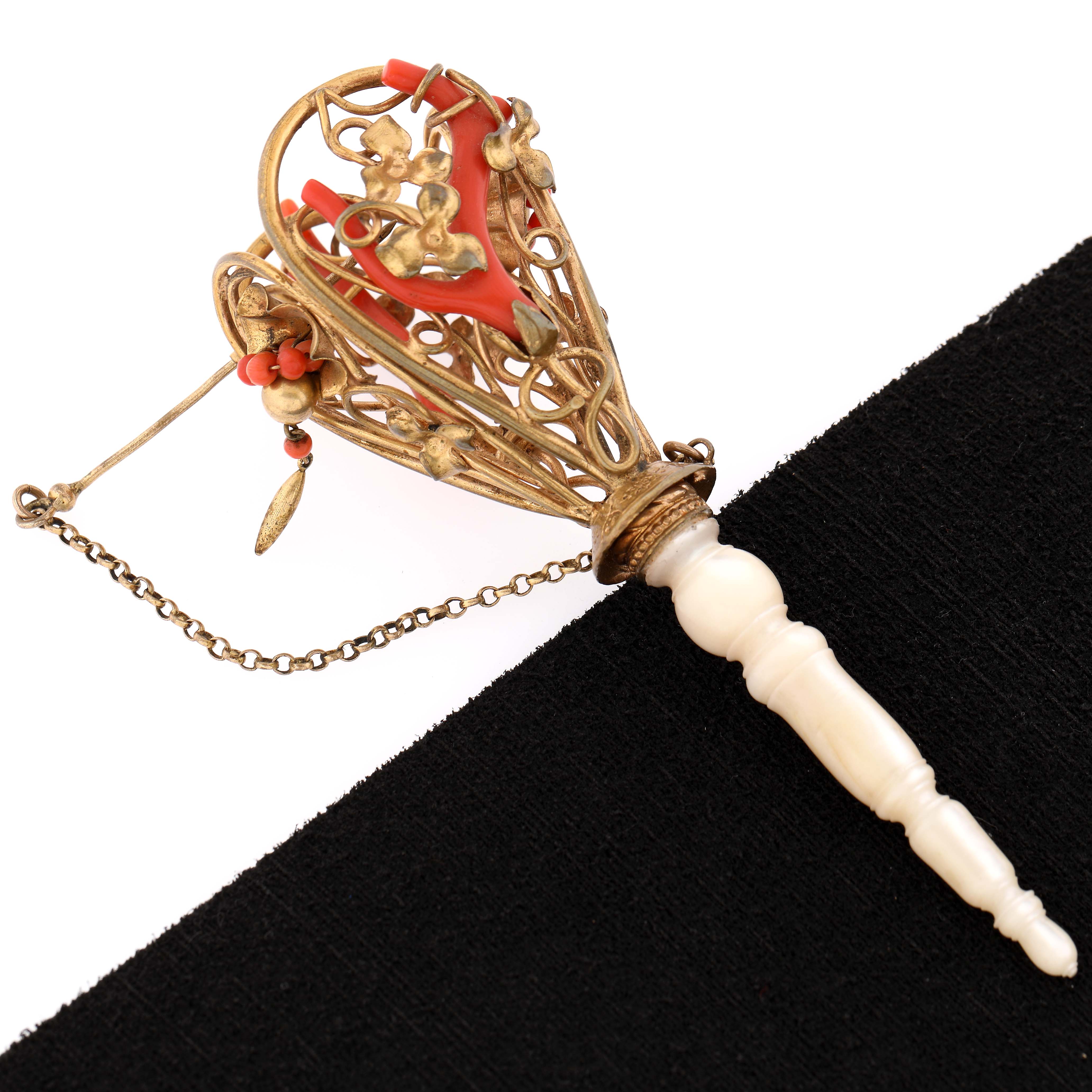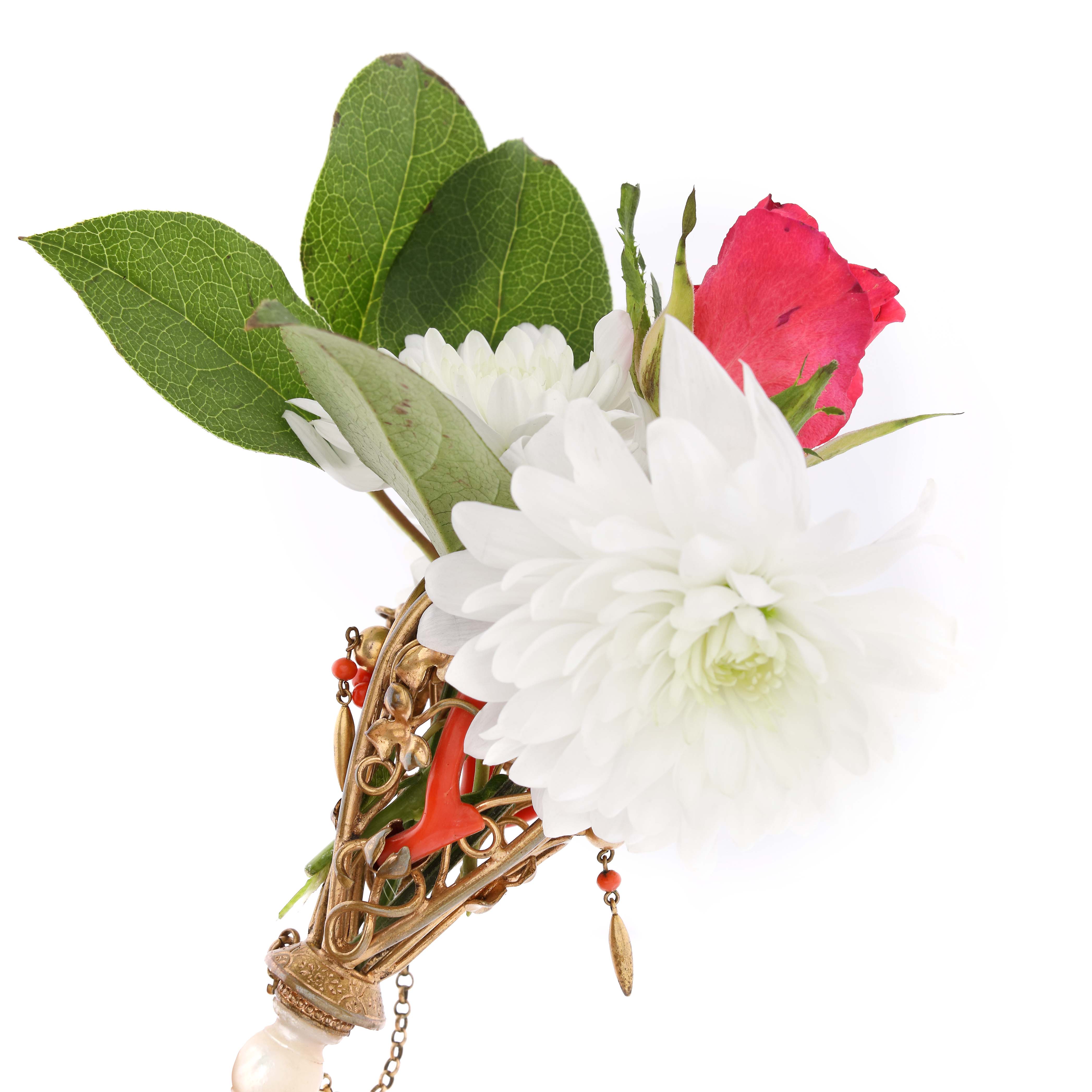 11. ”Tussie mussie” - suport pentru buchețel de flori, pentru bal, decorat cu sidef și corale, sfârșitul sec. XIX